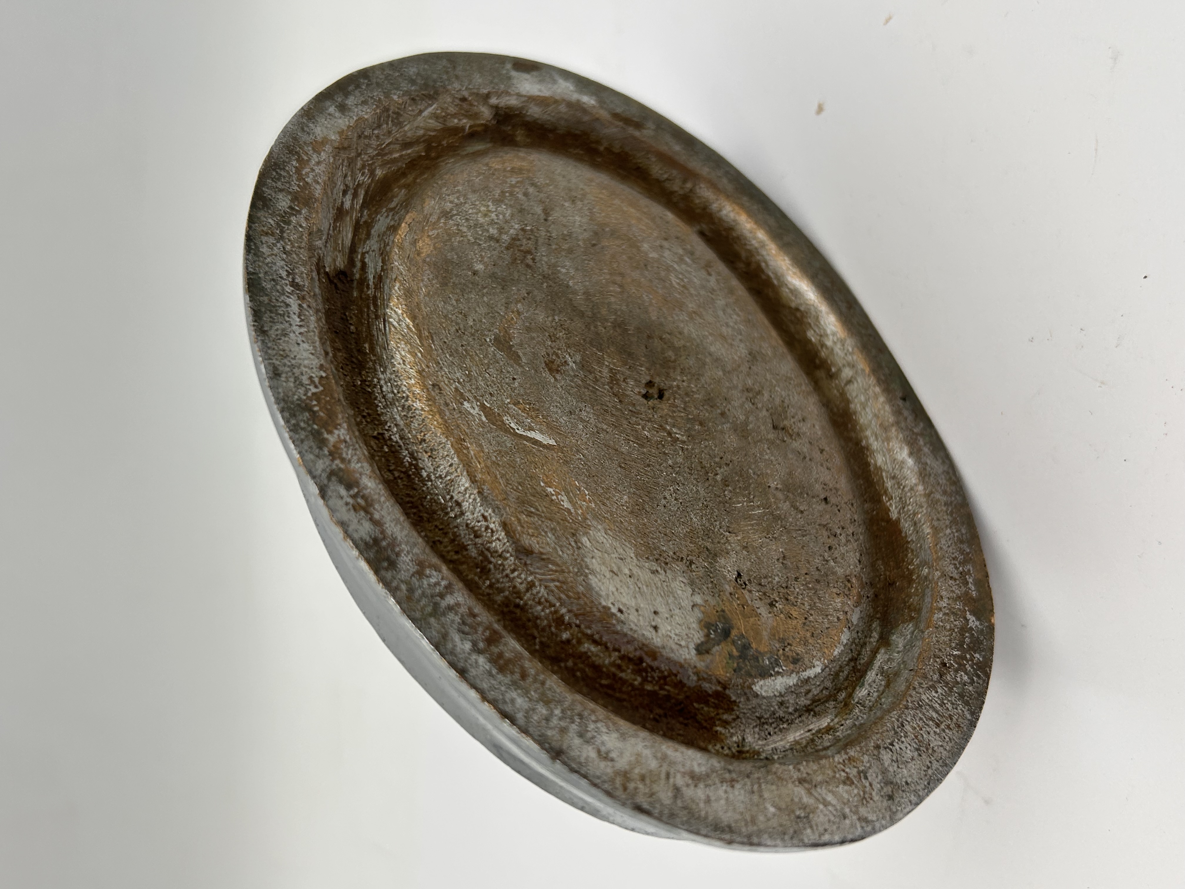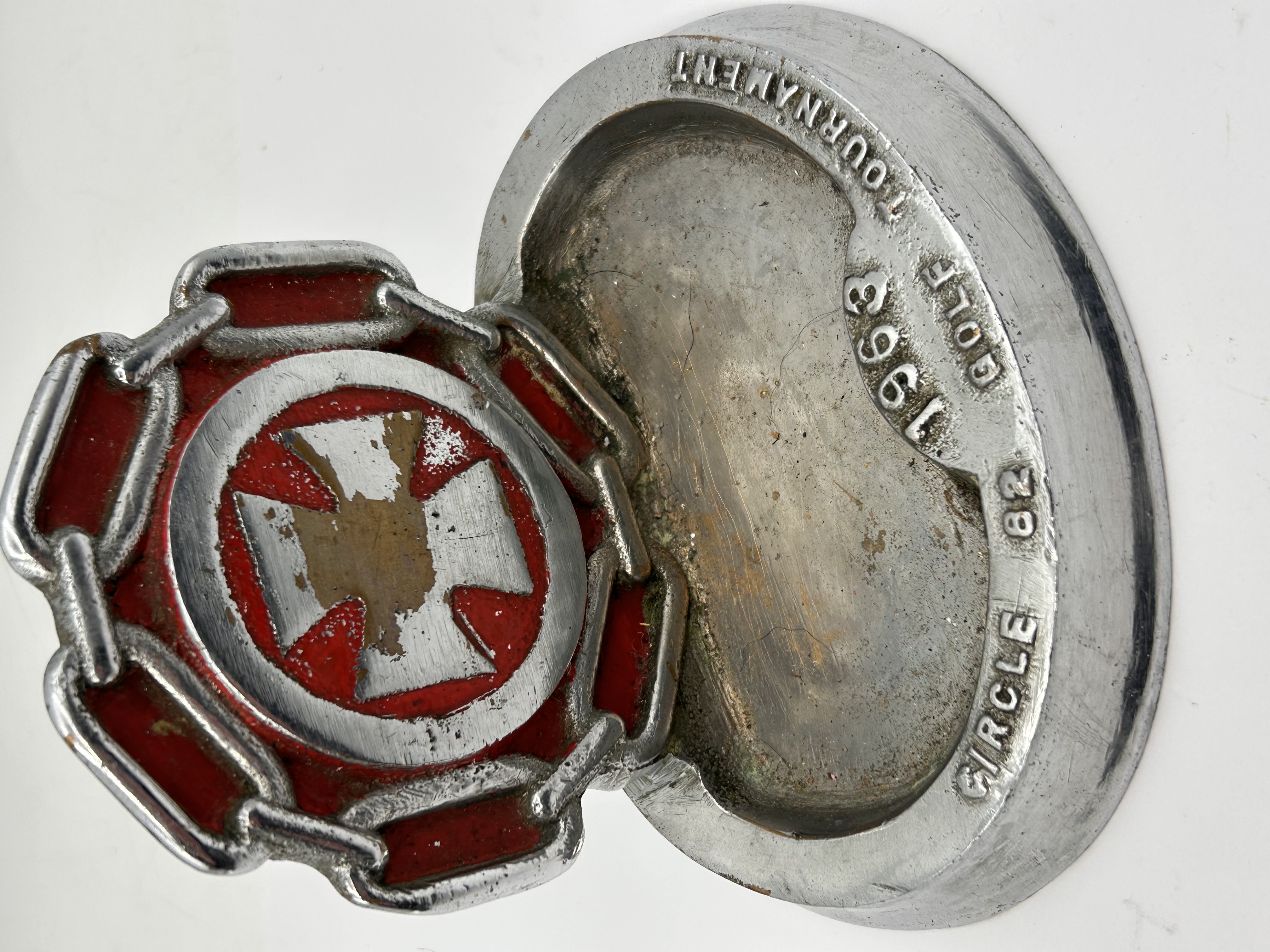 A single vintage commemorative desk ornament or trophy base, dated 1963. The item is constructed from a silver-toned metal, likely pot metal or chrome-plated alloy. The design features an oval tray base supporting a stylized round emblem. The emblem utilizes iconography associated with the Masonic Knights Templar, consisting of a central red-enameled circle containing a silver cross pattee design. This is surrounded by an outer ring detailed with eight stylized chain links, also finished in red enamel. Visible cast markings on the base identify the object as a memento from a specific event, reading: “CIRCLE 82,” “1963,” “GOLF,” and “TOURNAMENT.”