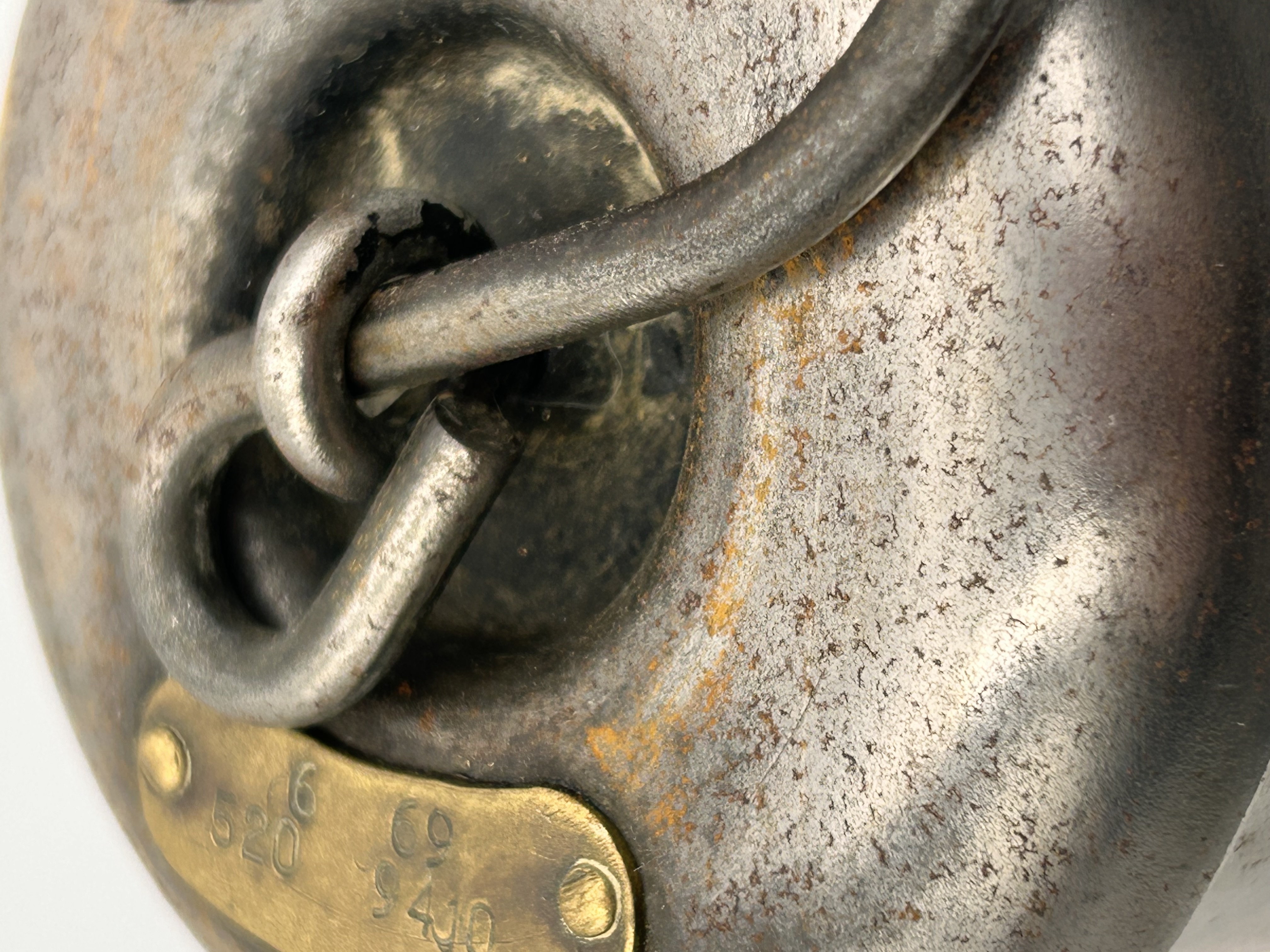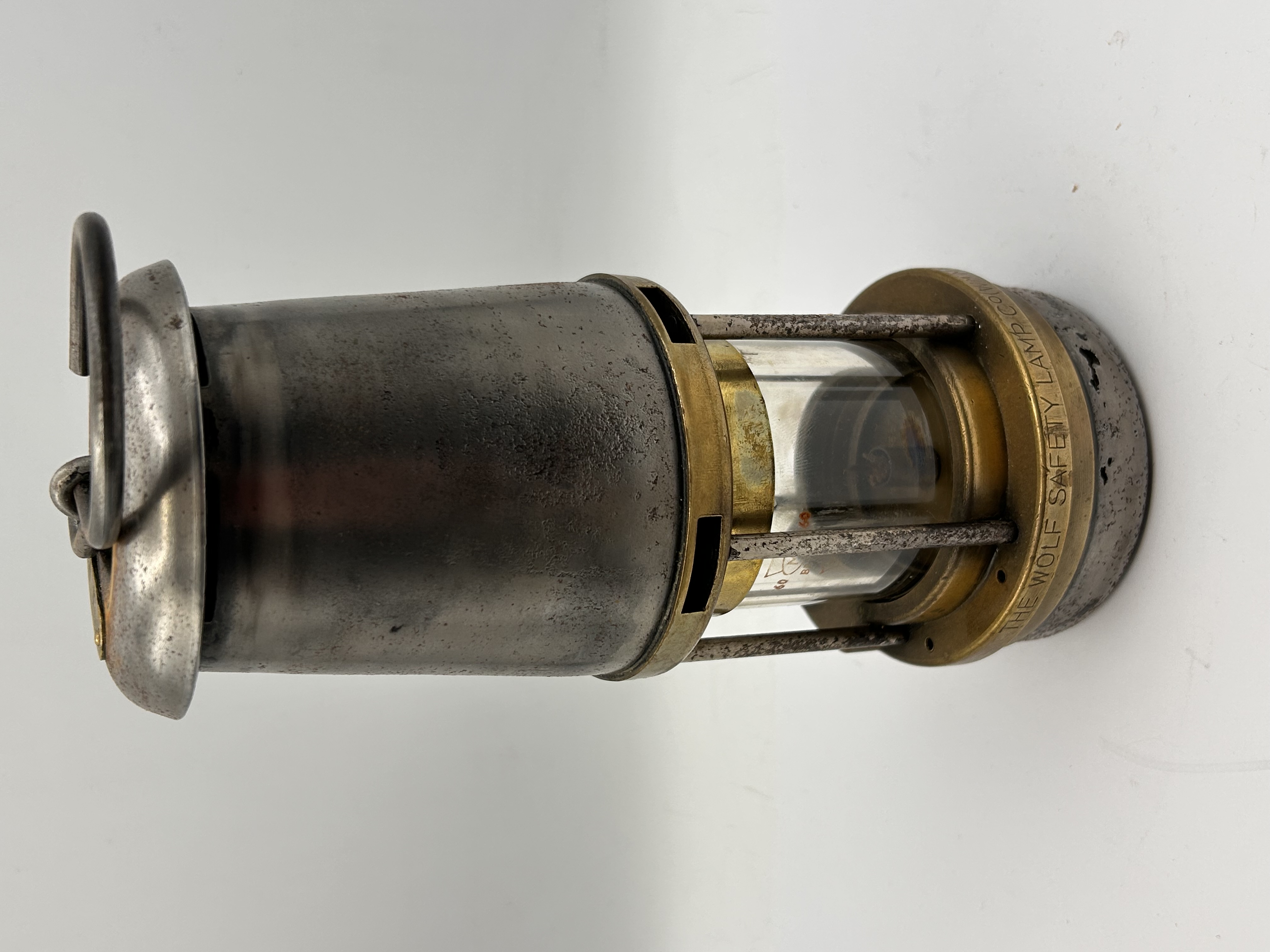An antique industrial flame safety lamp manufactured by The Wolf Safety Lamp Co. (Wm Maurice) Ltd., Sheffield. The construction utilizes composite materials, featuring a heavily patinated steel or iron hood and base, contrasted with tarnished brass components forming the fount ring and supporting pillars. A clear glass cylinder protects the flame mechanism. Inscriptions are visible around the brass base reading: “THE WOLF SAFETY LAMP CO (WM MAURICE) LTD SHEFFIELD.” A separate brass identification tag is affixed to the hood, stamped with numerical identifiers including “620,” “G.P.5,” and “D59.” This type of lamp was historically used as a flame safety lamp in mining environments.