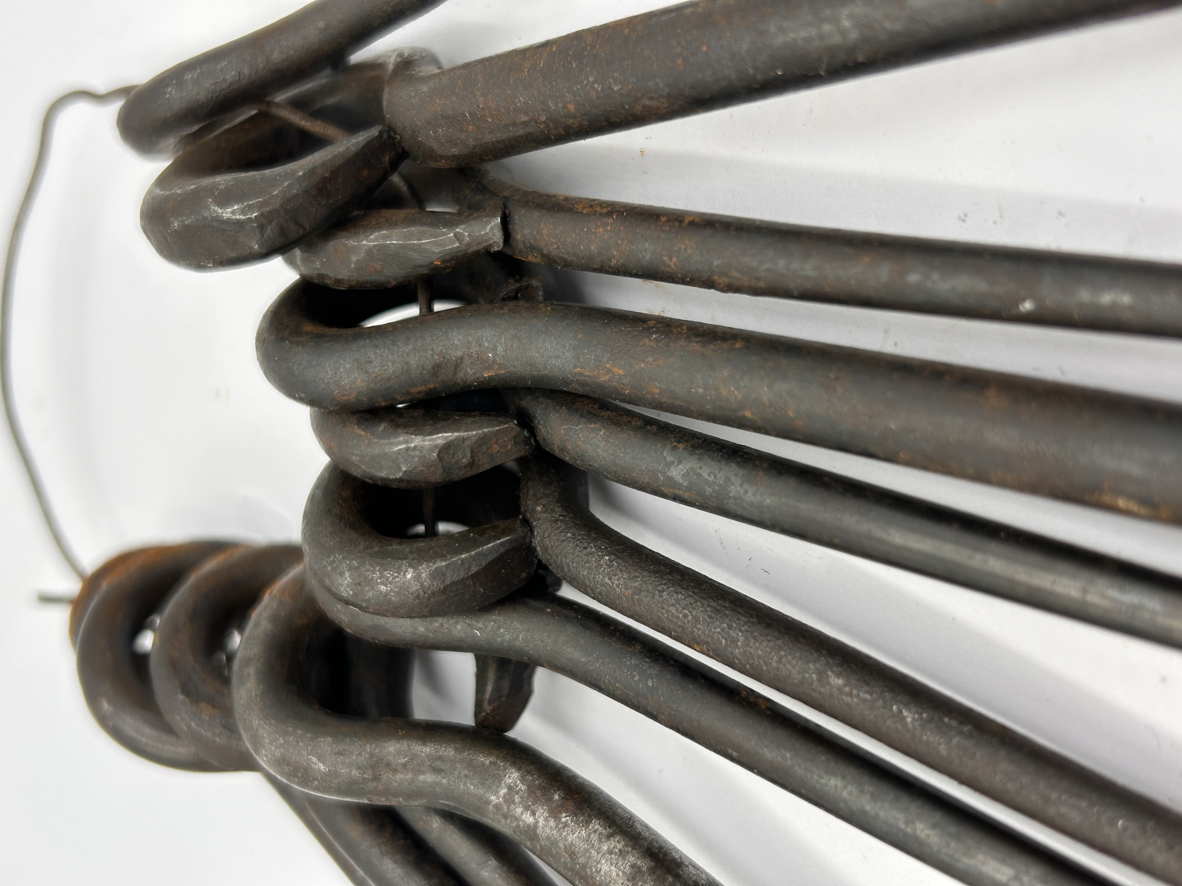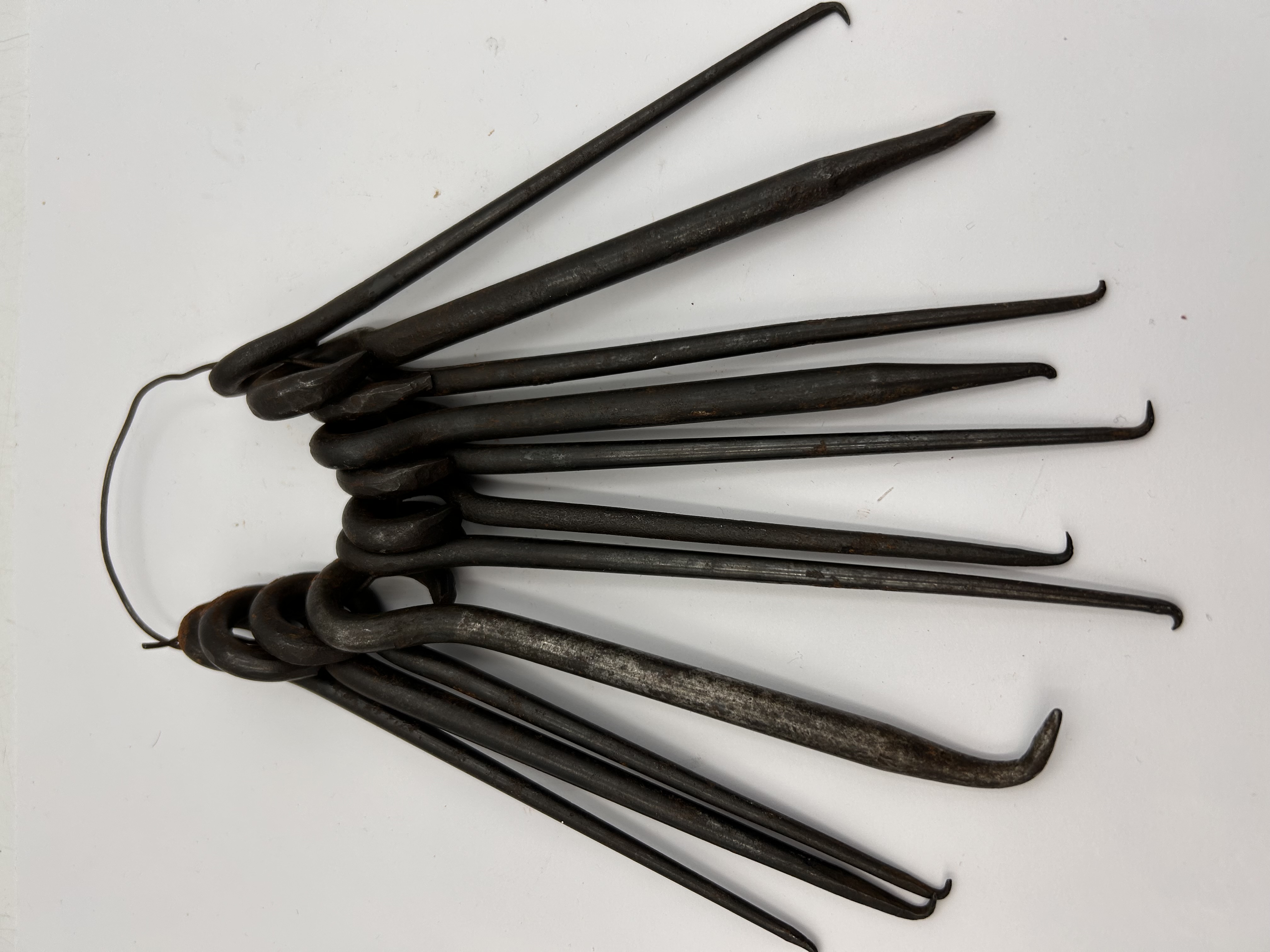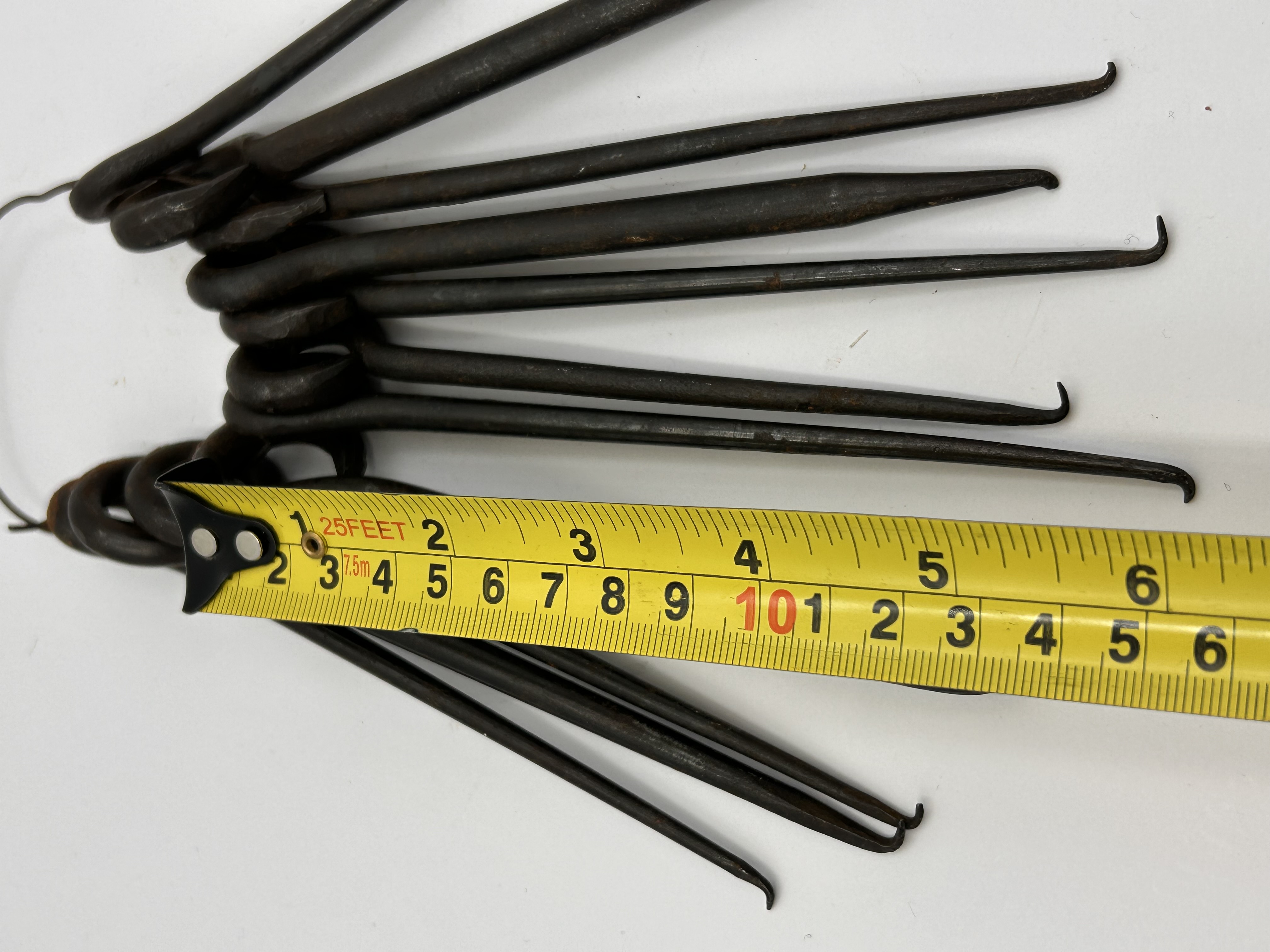 A collection of twelve hand-forged ferrous metal implements, likely specialized picks or tools, presented together on a simple, looped iron wire ring. Each implement is constructed from dark metal and features a long, slender, tapered shaft. One end of the shaft is curled into a closed loop for storage on the ring, while the opposing end tapers sharply to a point, often terminating in a slight hook. The tools show evidence of being individually hand-forged. No manufacturer names, dates, or other identifying markings are visible.
