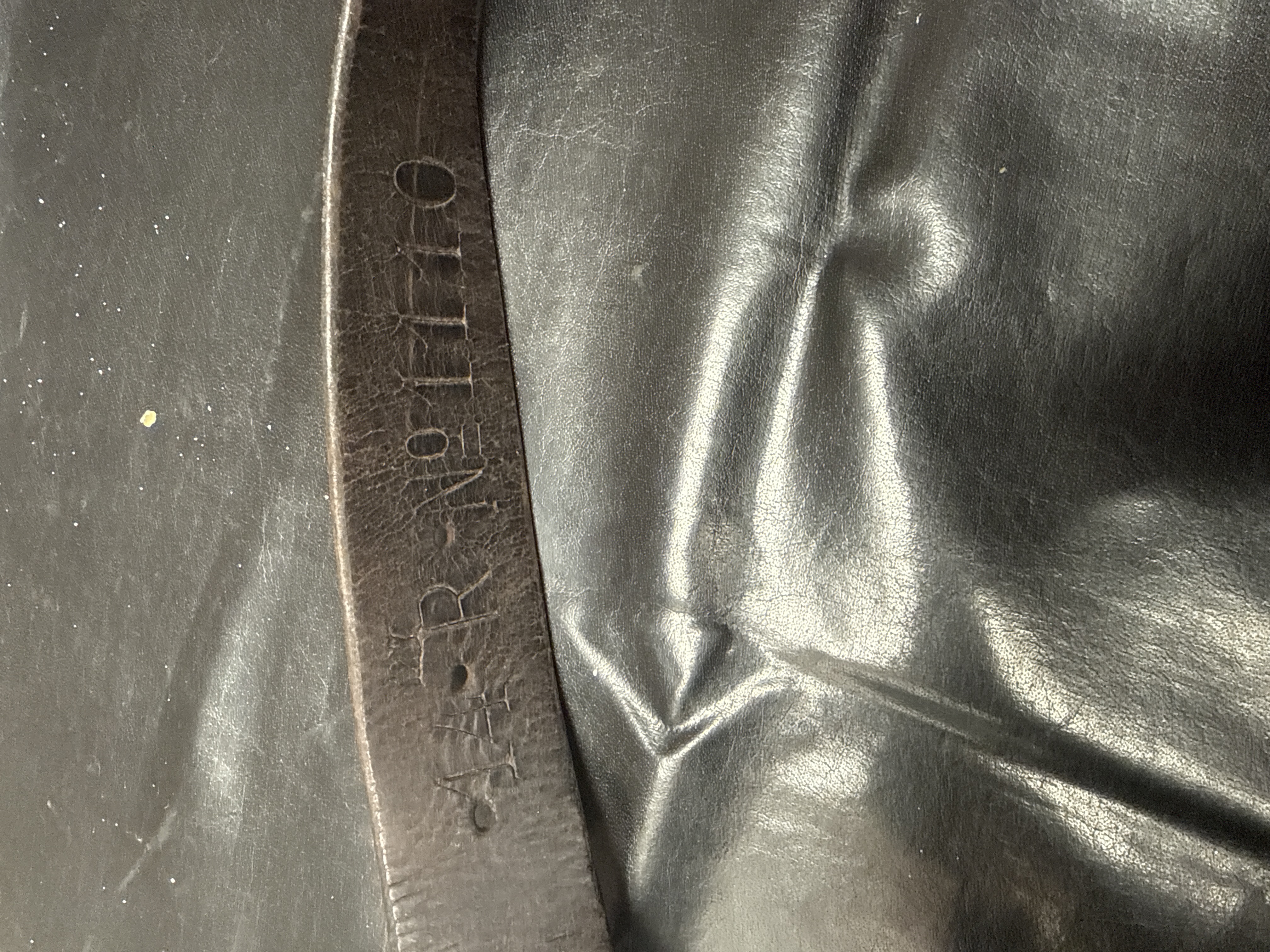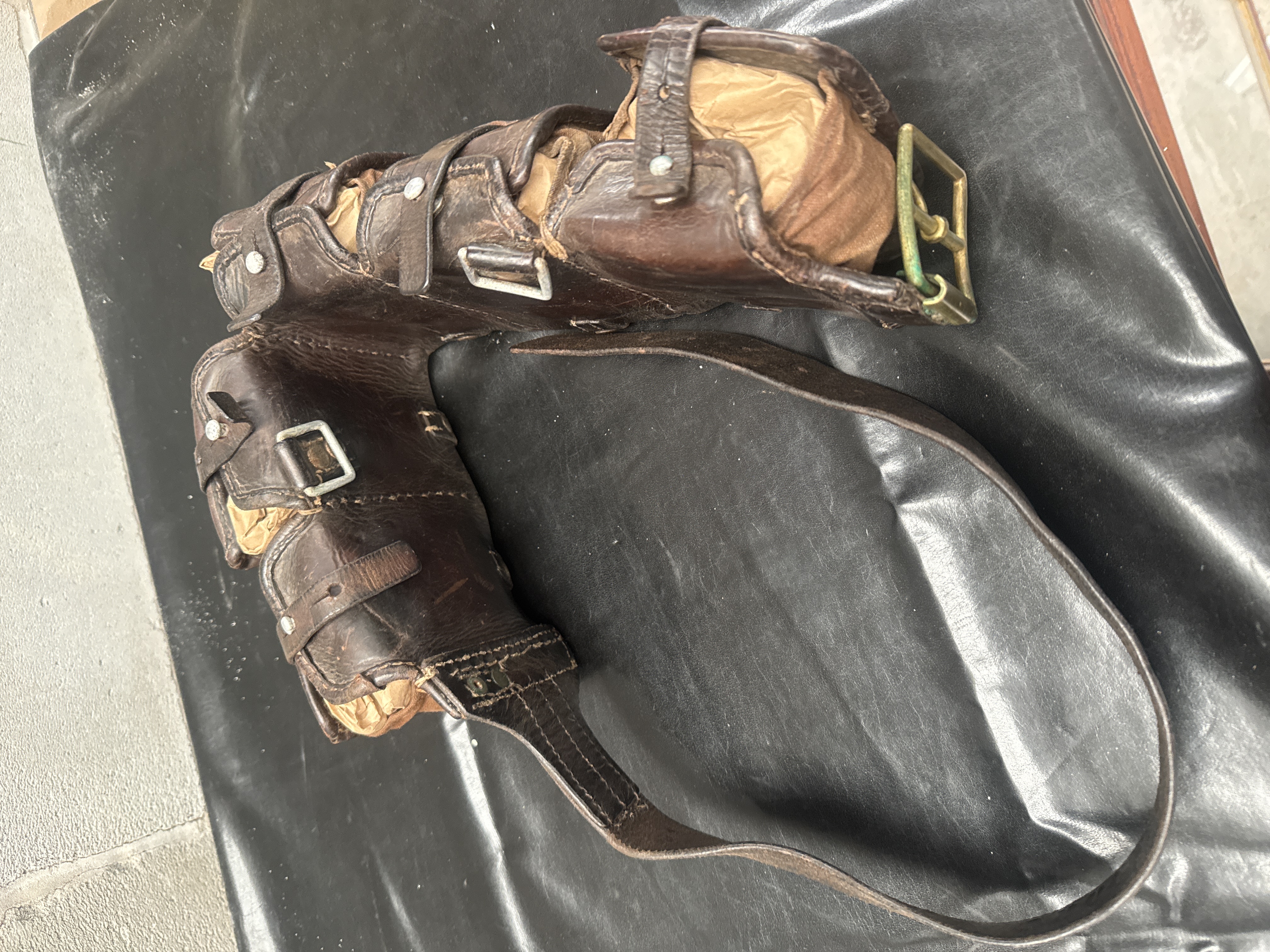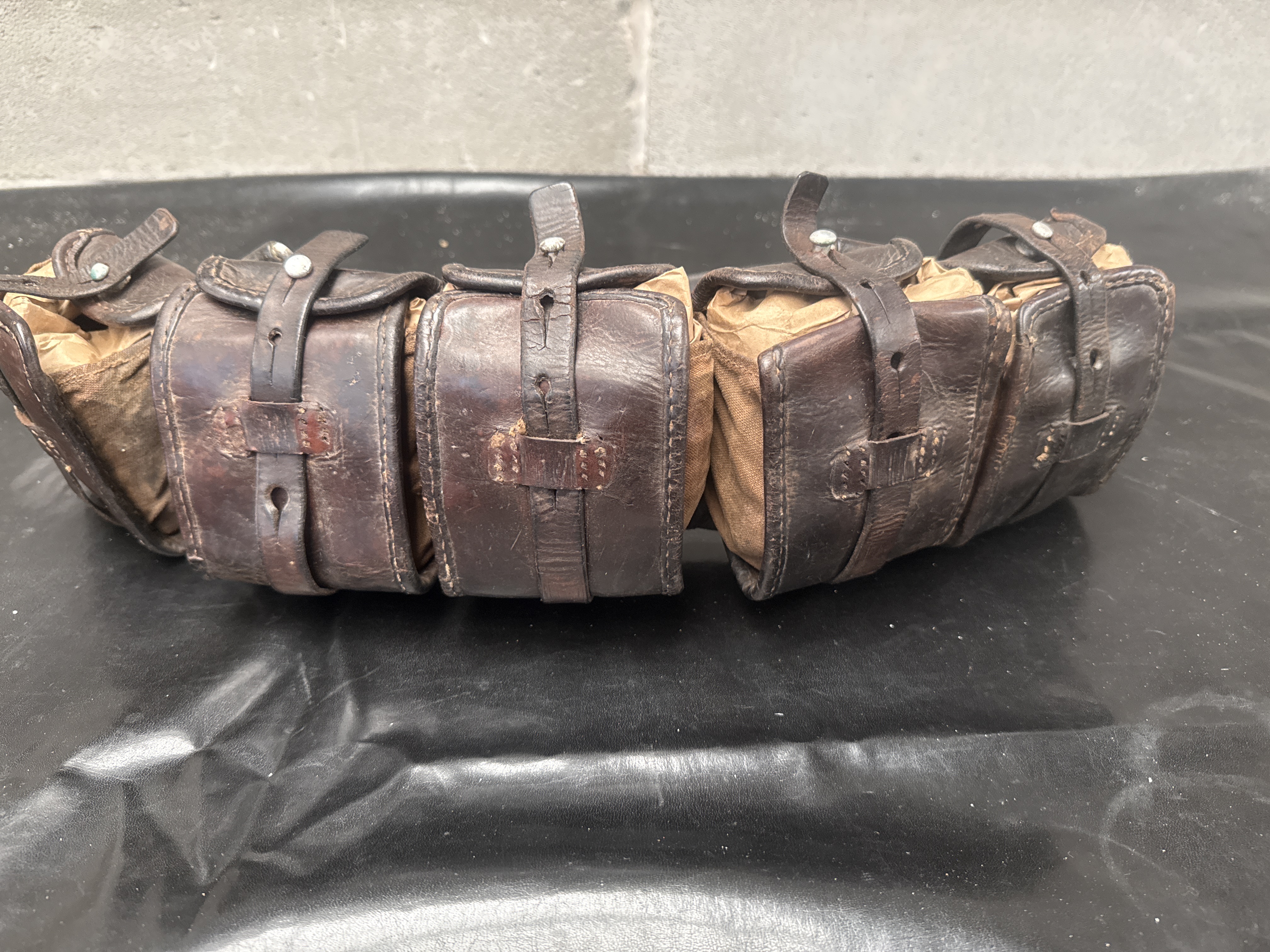 A vintage military or utility cartridge belt assembly constructed entirely of Leather. The assembly features five individual, highly compartmentalized pouches connected along a central spine. The pouches are lined with visible tan canvas or fabric inserts. Each pouch utilizes a leather flap closure secured by small leather straps and metal studs. The main belt section includes larger metal roller buckles. One strap bears clearly visible, deeply stamped markings reading A.A.R. N° 1110.