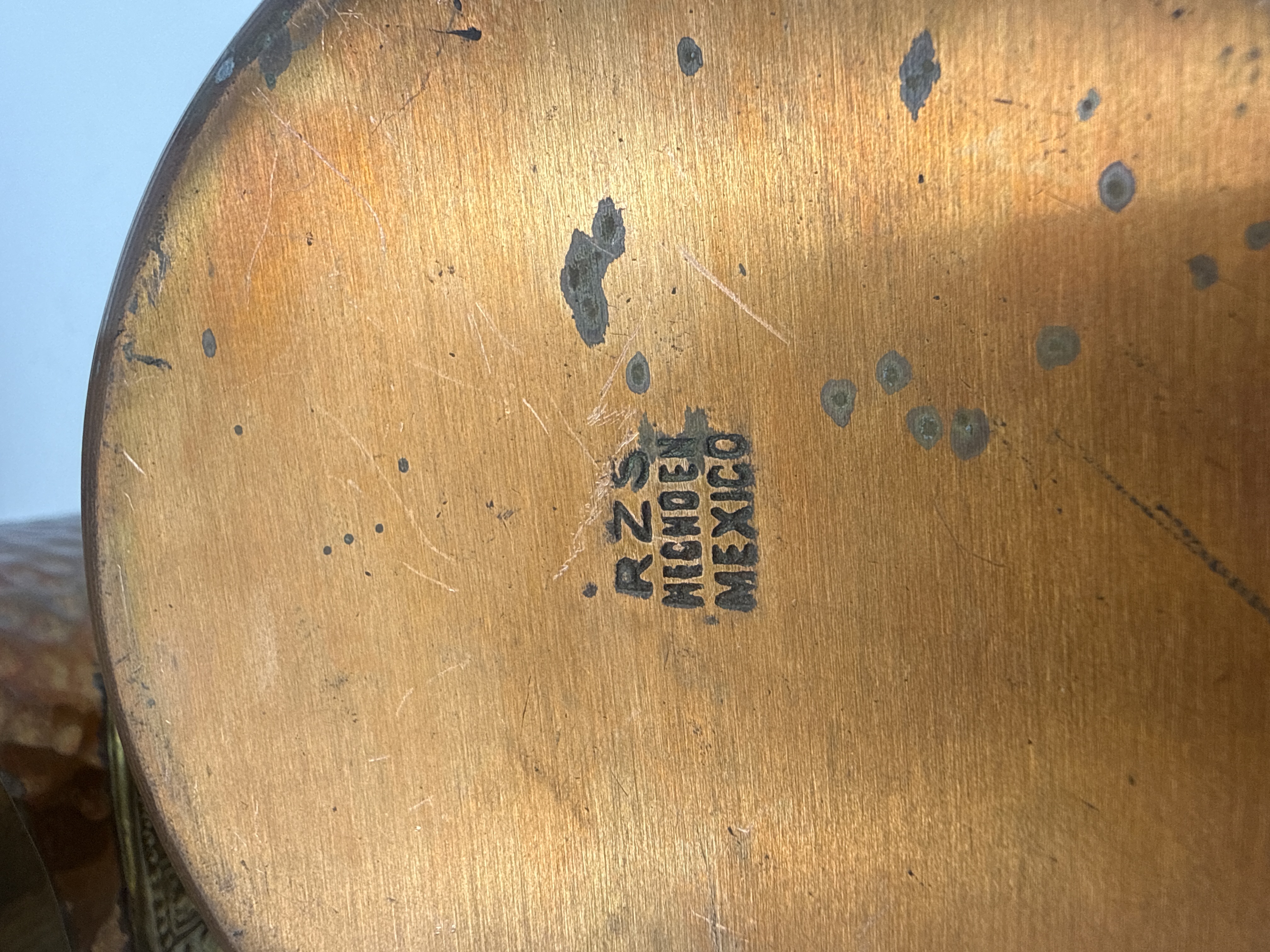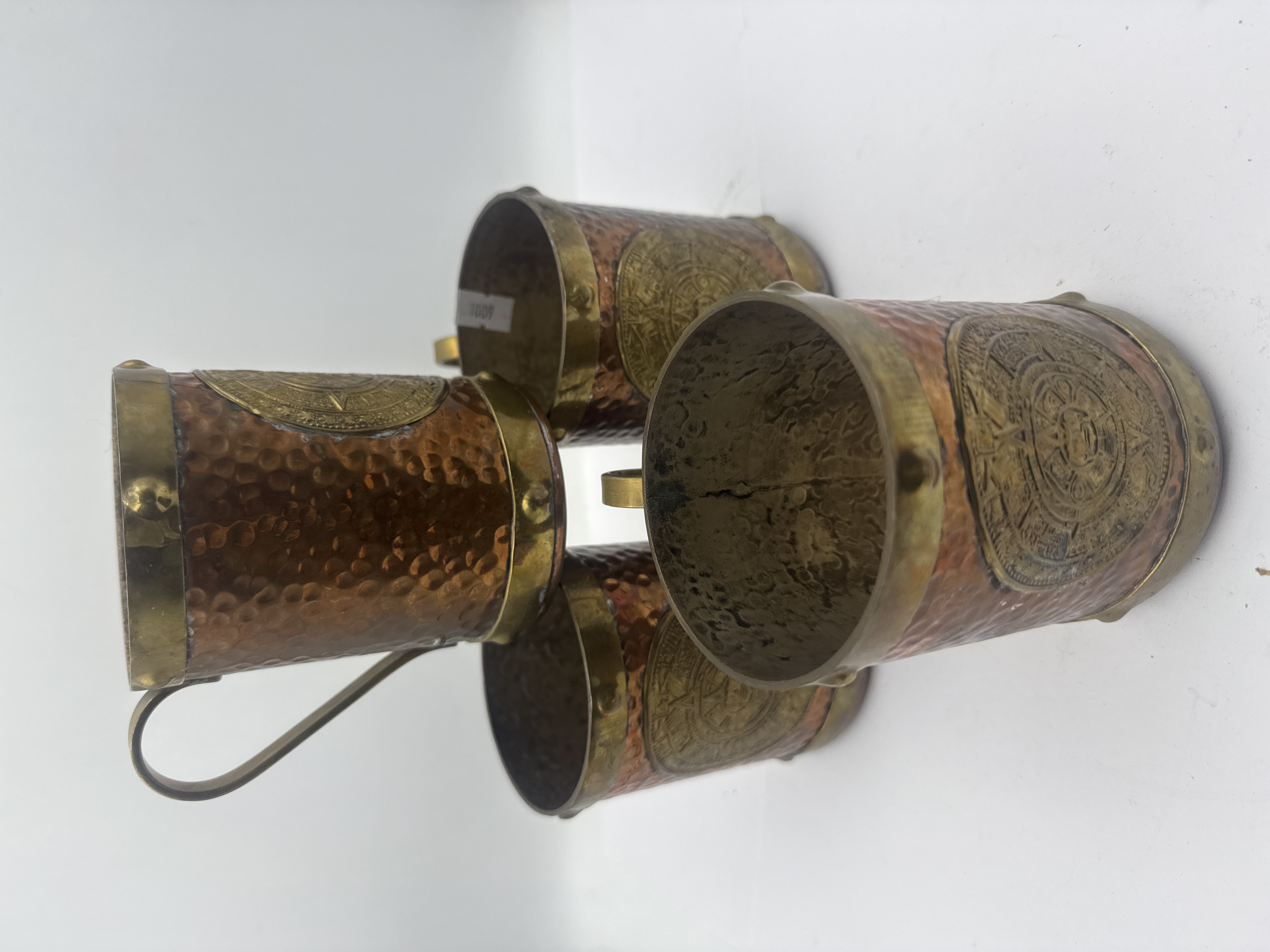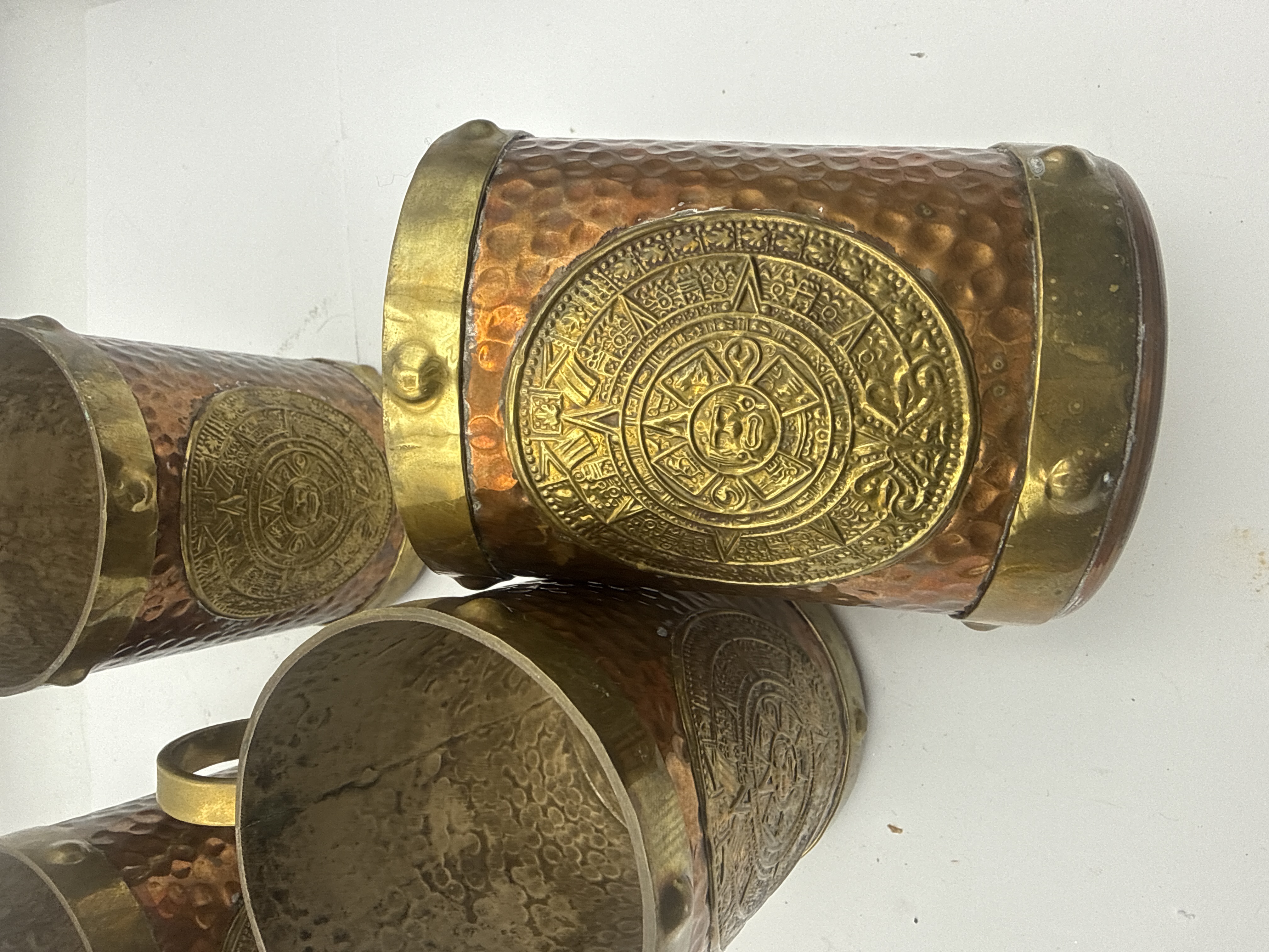 A collection of four vintage drinking mugs attributed to the Mexican manufacturer RZS. Each mug features a cylindrical body constructed from hammered copper, banded at the rim and base with brass or bronze. A matching brass handle is attached to the side. The primary decoration consists of a prominent applied circular brass medallion depicting the Aztec Sun Stone or Calendar. The style is consistent with mid-20th-century Mexican folk art or souvenir wares. The underside of one mug is stamped with the manufacturer’s initials “RZS” above the inscription “HECHO EN MEXICO” (Made in Mexico).