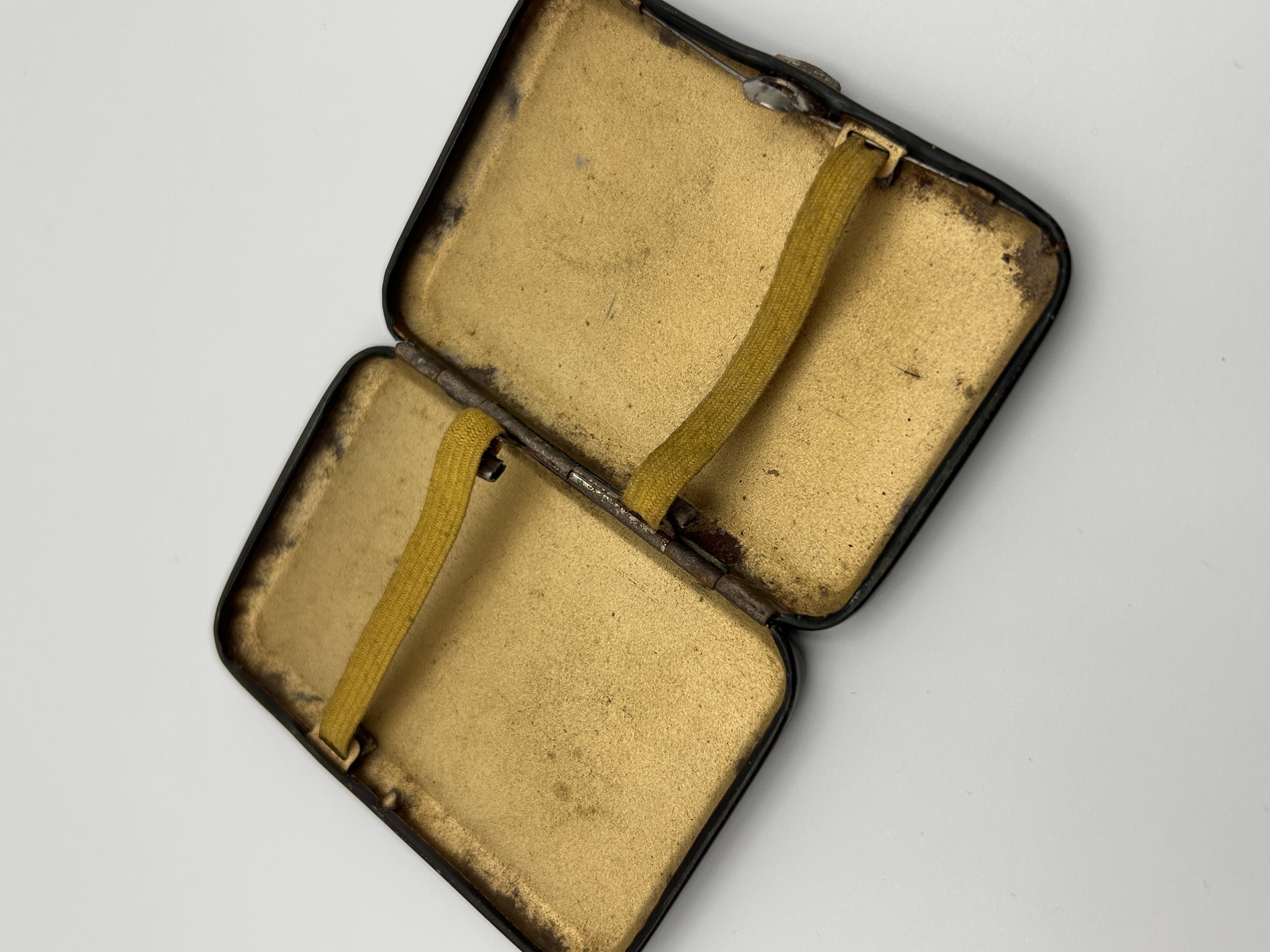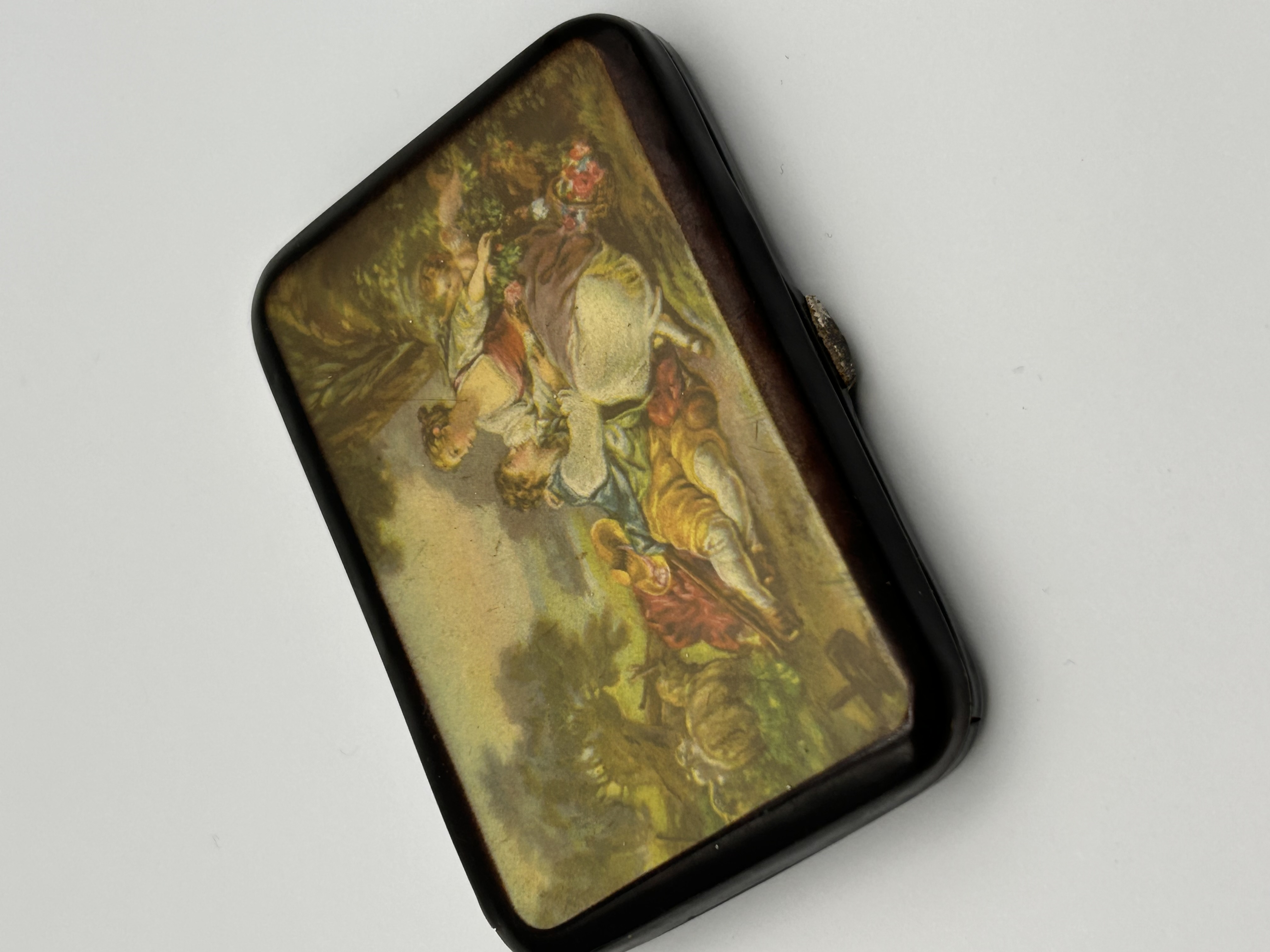 The item is a single, rectangular hinged case, likely intended for cigarettes or cards. The exterior features a dark, smooth frame, constructed of a material resembling enameled metal or synthetic resin, surrounding a central decorative panel. The panel displays a miniature scene executed in the Rococo or fête galante style, depicting a courting couple resting in a pastoral landscape, with a putto visible above them. The interior is constructed of gold-toned metal and is fitted with two yellow elastic retaining straps secured by small metal brackets. This style of decorative case is commonly associated with vintage continental European production. No visible maker’s marks or textual inscriptions are present.