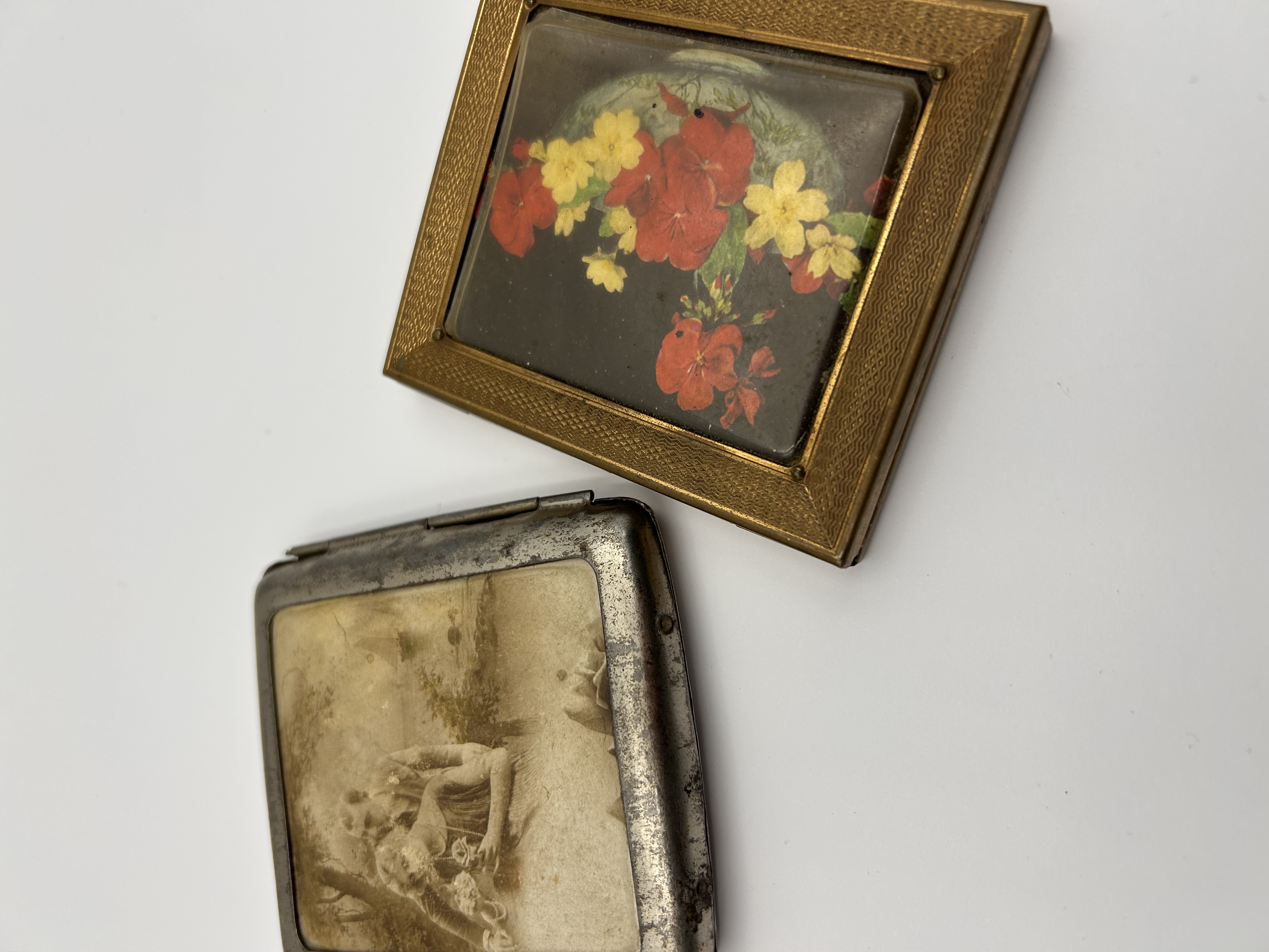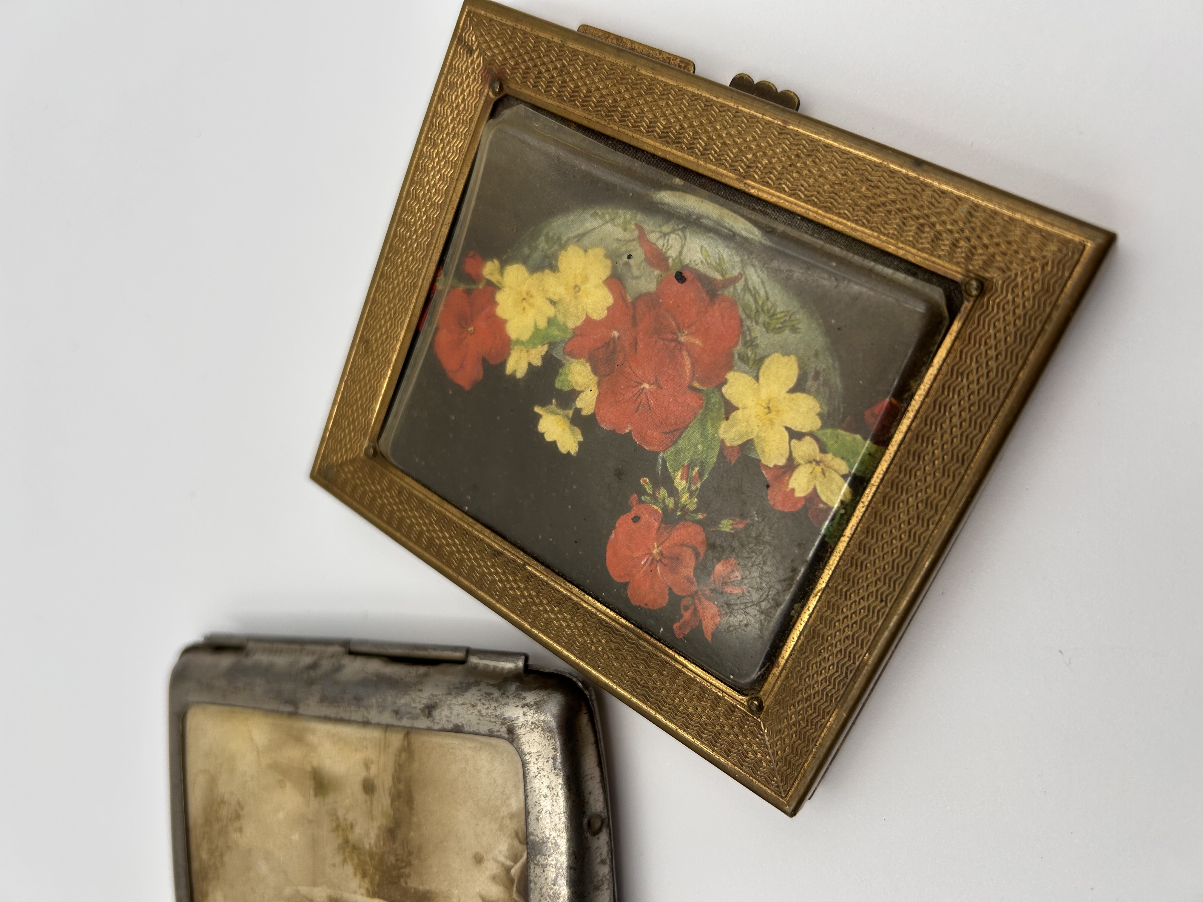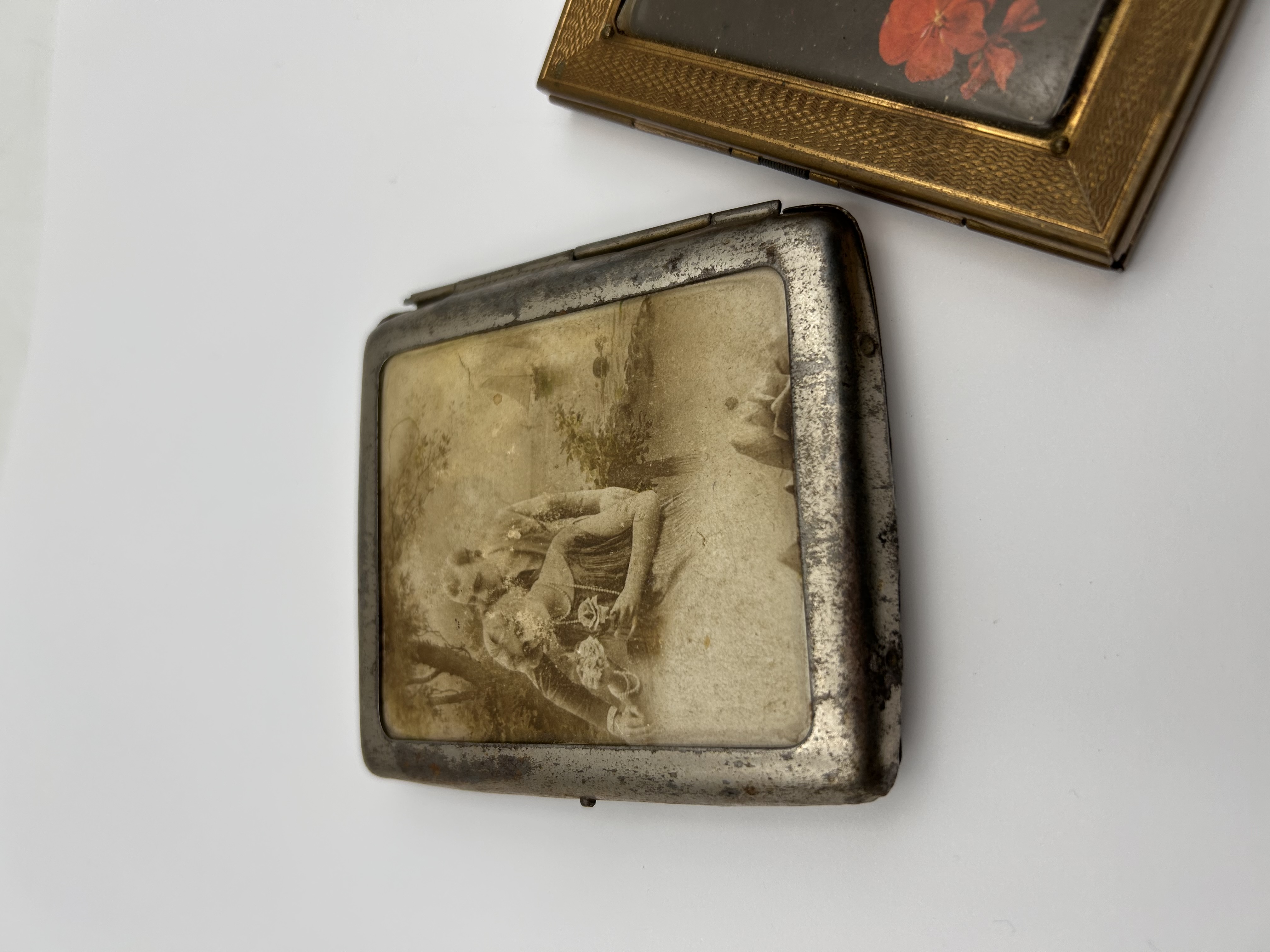 A collection of two vintage metal cases. The first is a silver-toned hinged case, likely a cigarette or calling card case, constructed of plated metal. The lid features a sepia-toned photographic insert depicting a young couple seated outdoors by the water. The second item is a smaller, rectangular gold-toned metal compact or box. This item features a textured decorative frame surrounding a slightly convex clear cover, beneath which is an insert displaying a colorful image of red and yellow flowers against a dark background.