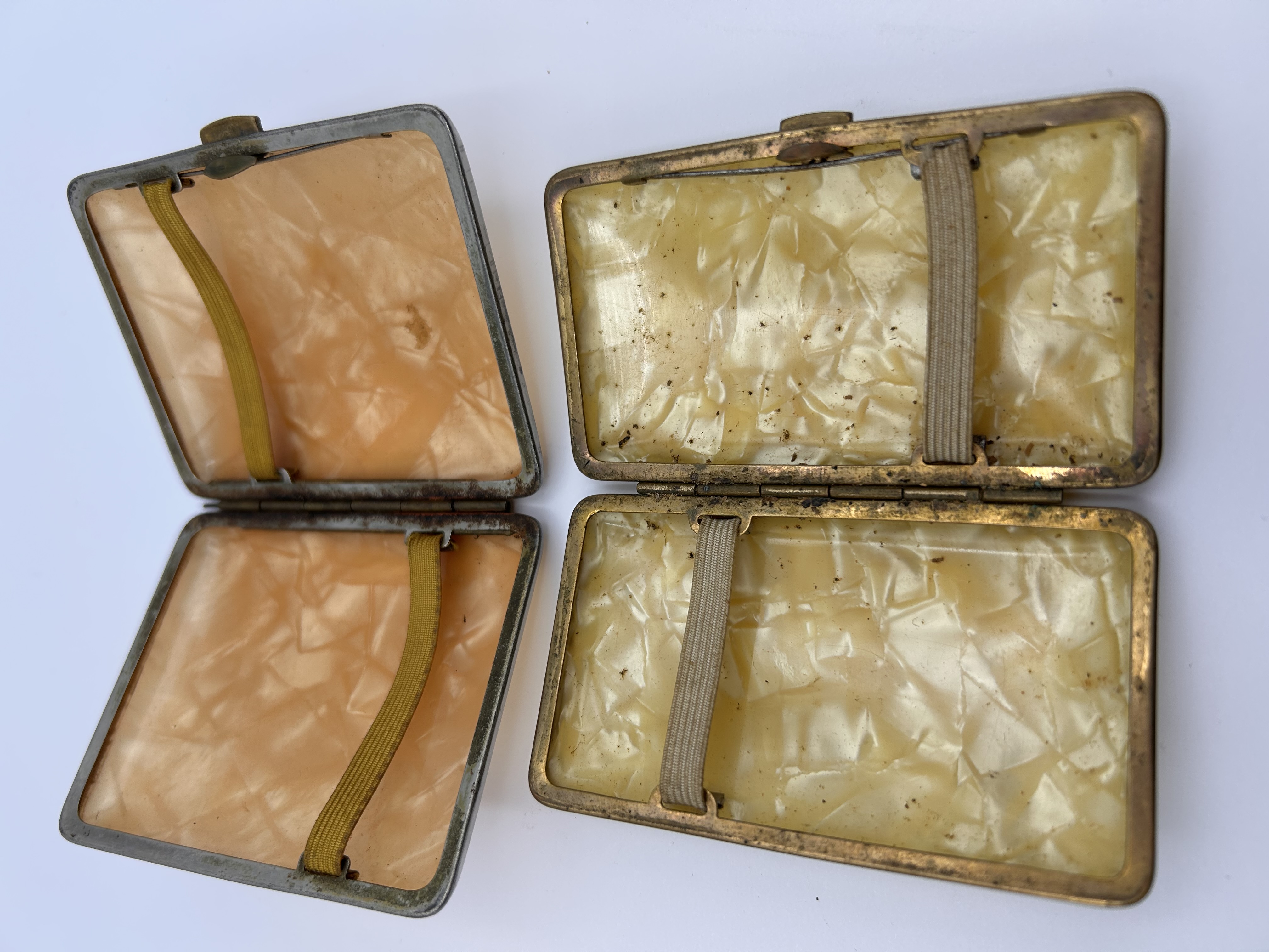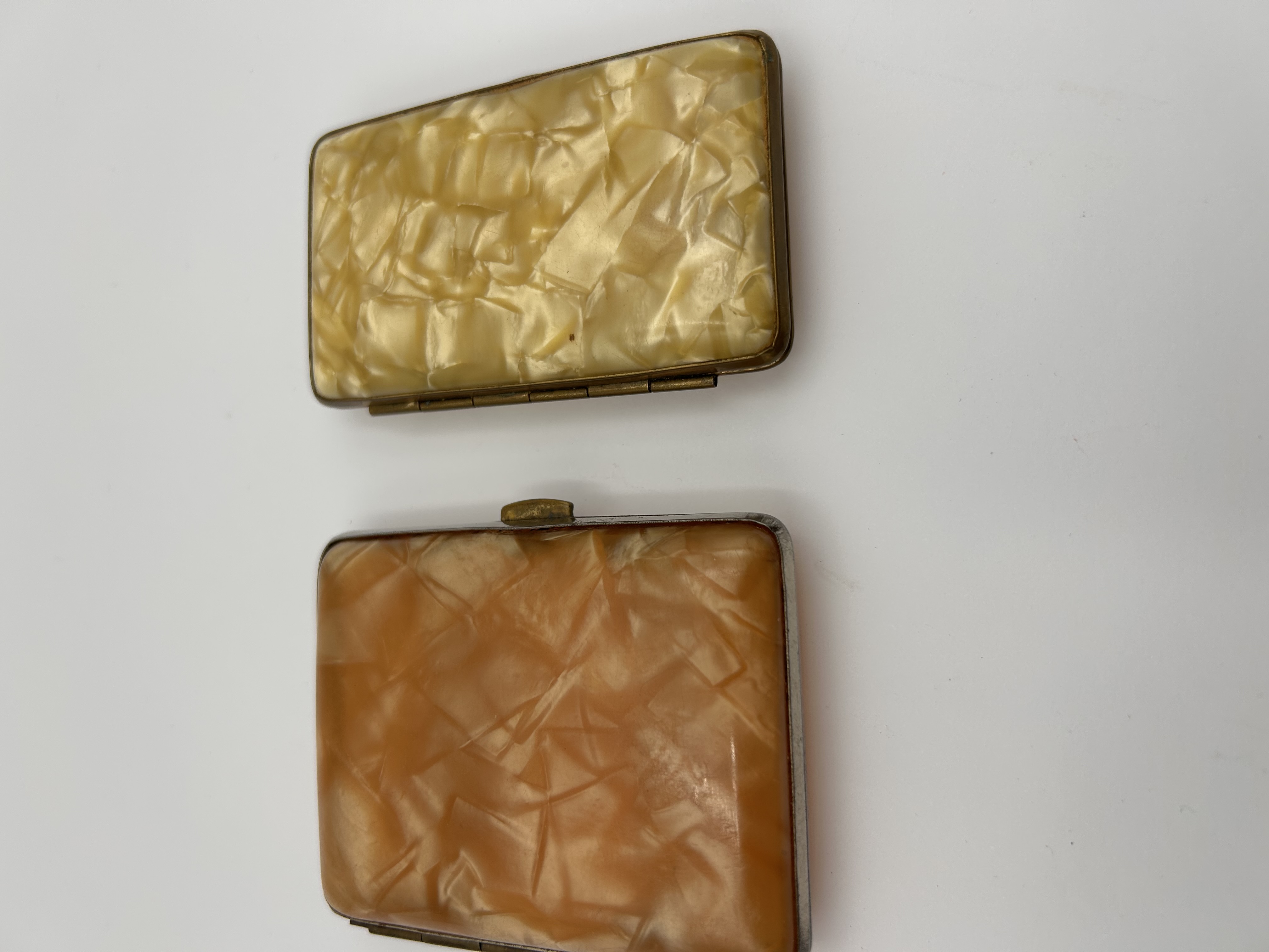 A pair of vintage hinged rectangular cases designed for holding cigarettes, consistent with Art Deco or mid-century styling. The cases feature covers constructed from early plastic material, likely celluloid or bakelite, designed to simulate highly mottled tortoiseshell and mother-of-pearl finishes. The first case is set in a silver-toned metal frame and features an amber/orange-brown mottled plastic cover. The second case is set in a brass-toned metal frame and features a pale ivory/yellow mottled plastic cover. Both cases open to reveal interiors lined with matching plastic material, each fitted with two elastic retaining bands designed to secure contents. No manufacturer markings or inscriptions are visible on either item.