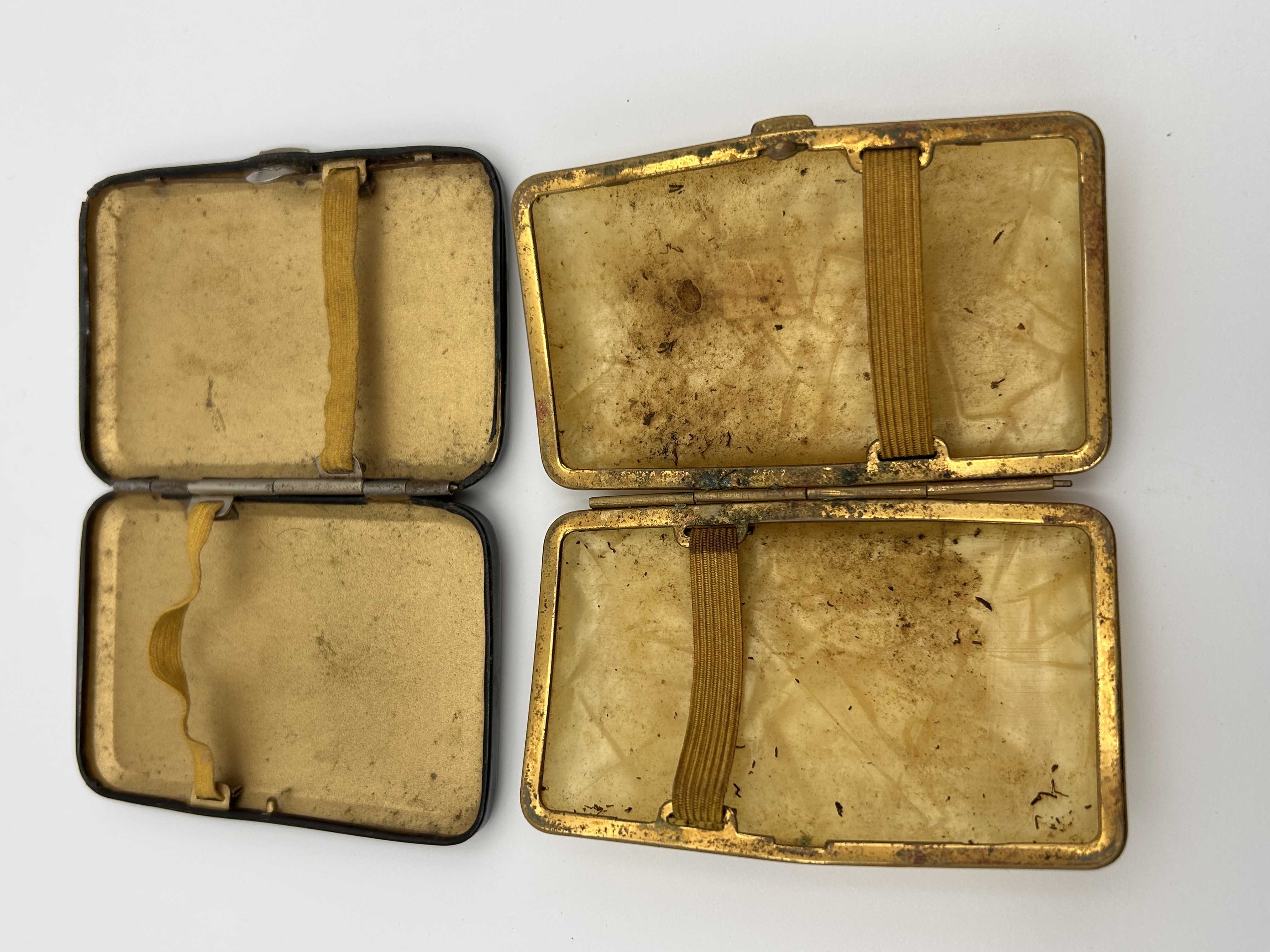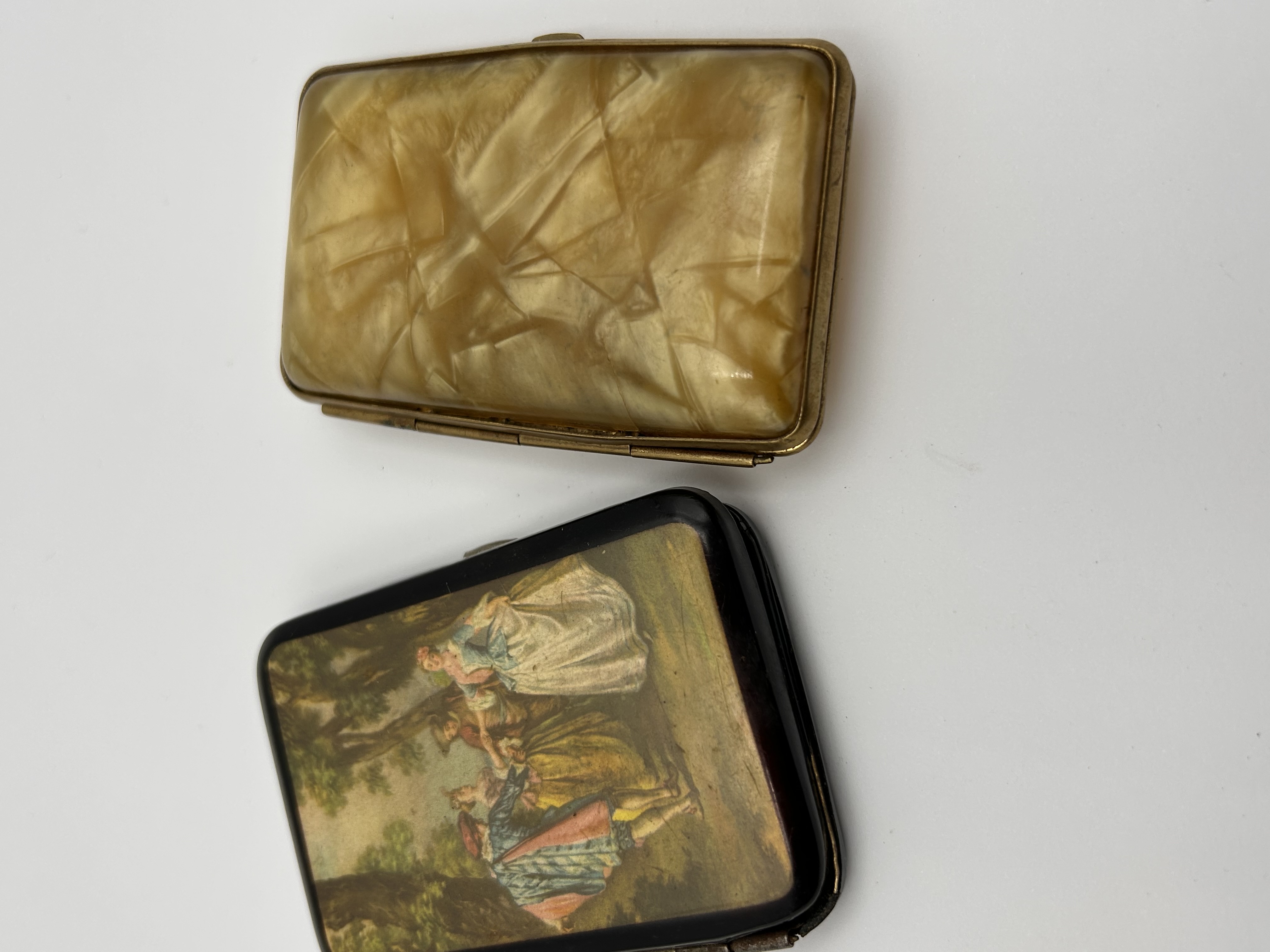 A pair of early 20th-century hinged rectangular cases, likely intended for cigarettes or cards, exhibiting styles ranging from Edwardian to Art Deco. The first case features a black enameled body and brass frame, the lid inset with a miniature panel depicting a pastoral or Rococo-style painted scene of three figures in a wooded landscape. The second case is constructed with a brass frame enclosing panels of mottled, translucent yellow-gold material, consistent with early plastics such as celluloid or faux tortoiseshell. Both cases open to reveal gilt metal interiors. The black case contains one yellow elastic strap, while the plastic-covered case contains two yellow elastic straps. No manufacturer markings or text are visible.