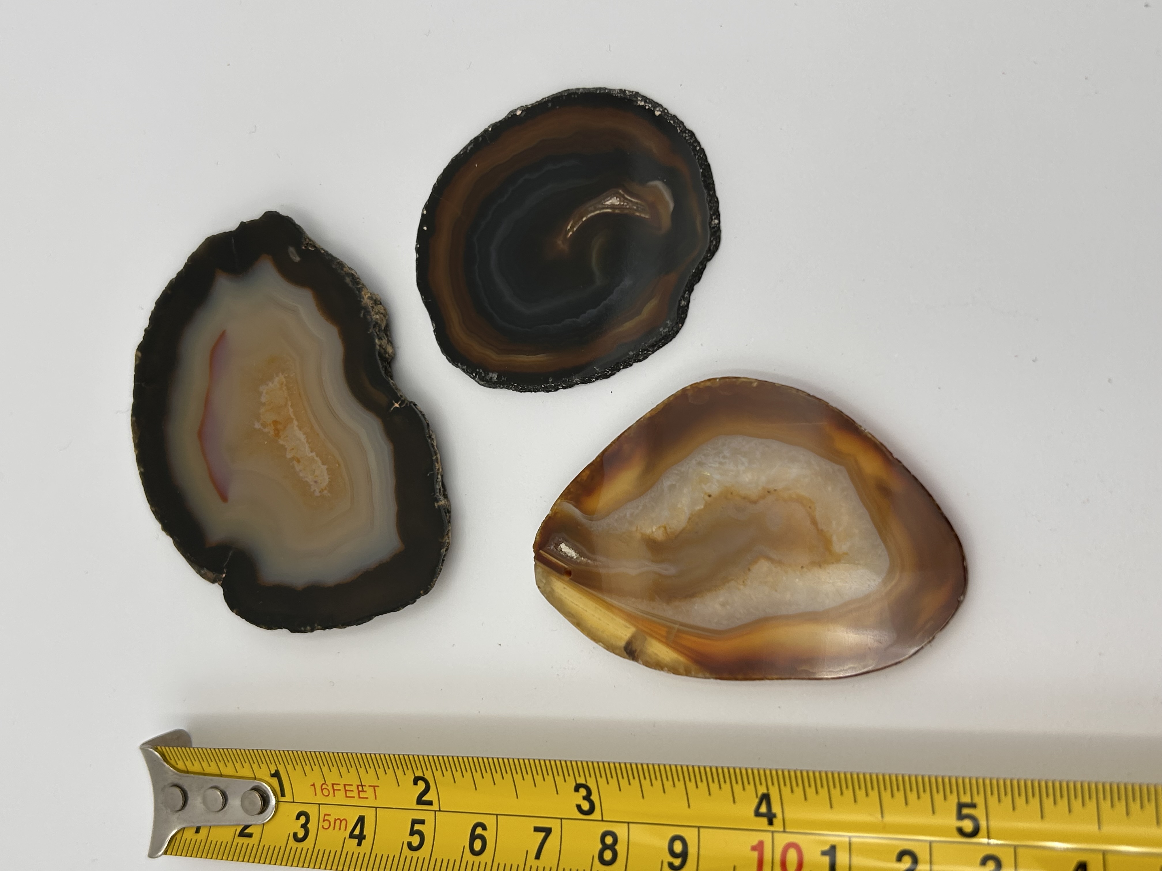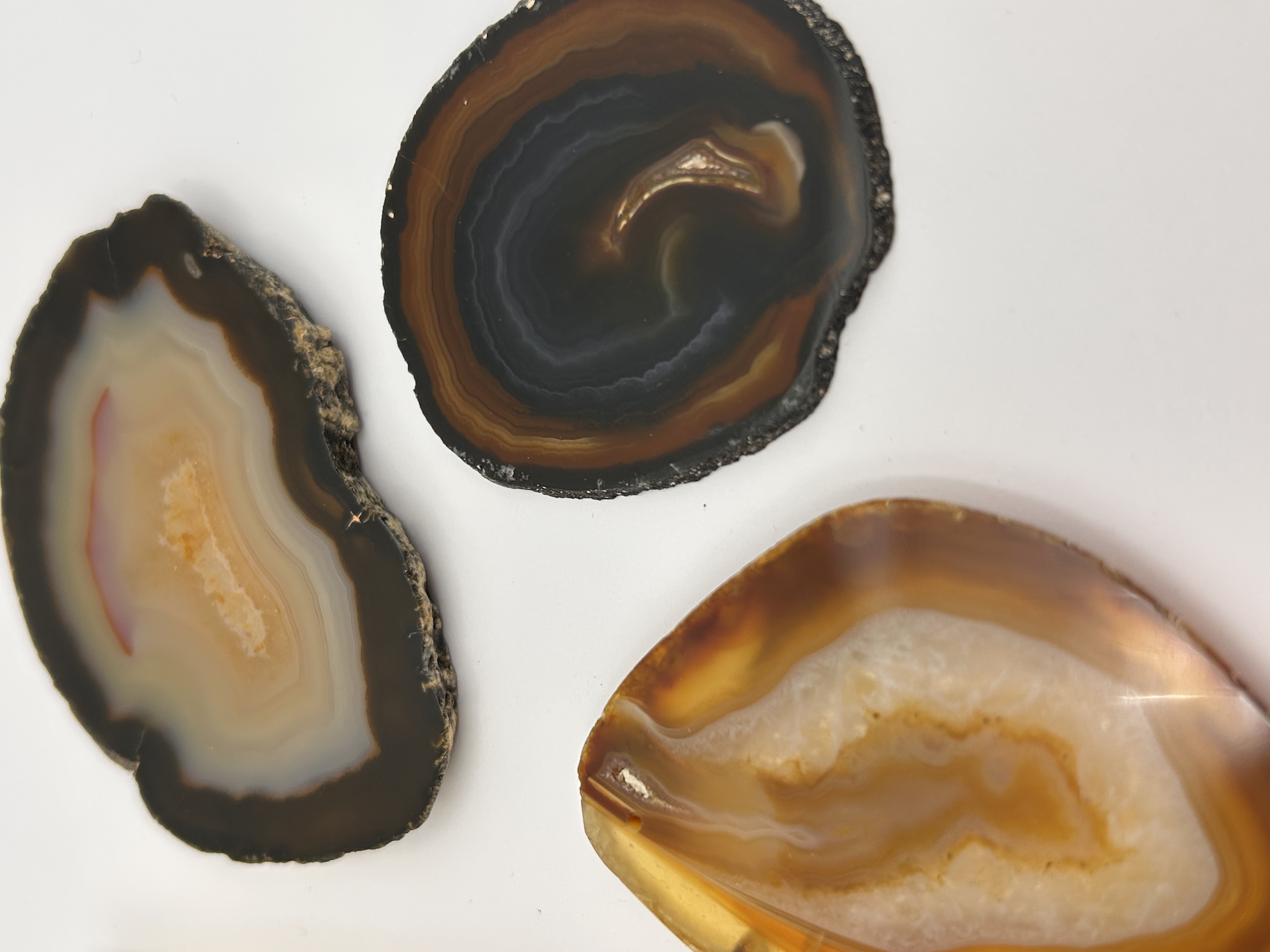 A collection of three polished slices cut from natural agate geodes. Each specimen displays distinct concentric banding in various natural hues, including black, dark brown, white, gray, and warm reddish-orange or tan colors. The flat surfaces of the slices are highly polished, contrasting with the naturally irregular, rough outer rind edges. One slice, positioned lower left, features a small drilled perforation near its top edge, suggesting preparation for use as a pendant or drilled display specimen.