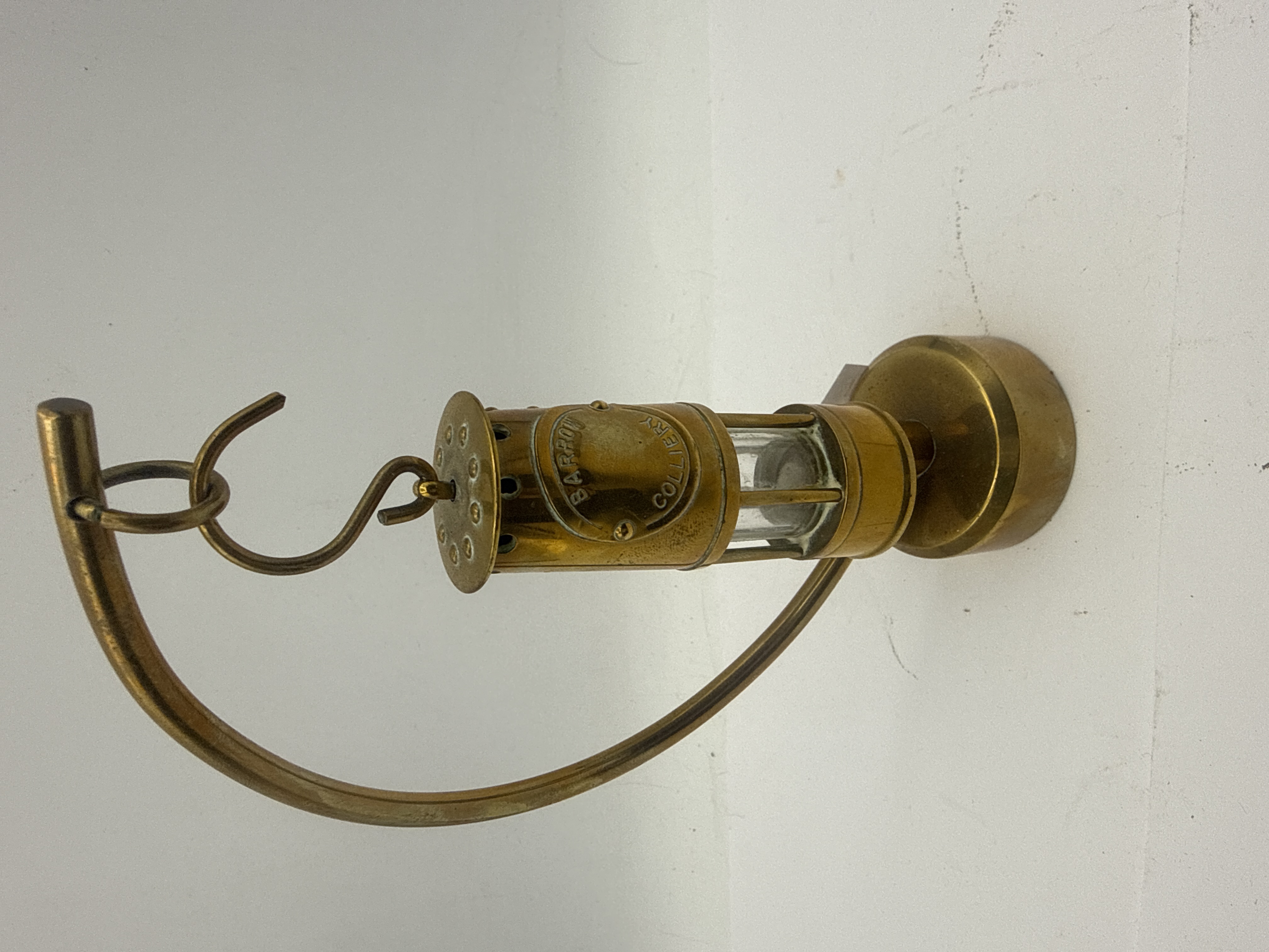 A presentation or decorative miners safety lamp constructed from polished brass, consistent with the style manufactured by the Hockley Lamp & Limelight Company. The lamp features a cylindrical body with a clear glass section enclosing the burner area, topped by a cap with ventilation holes. The lamp is suspended via an S-hook from an integrated, arched hanging stand mounted on a circular base. A circular brass plaque is affixed to the lamp body bearing the inscription BARROW COLLIERY. This item is a single piece.