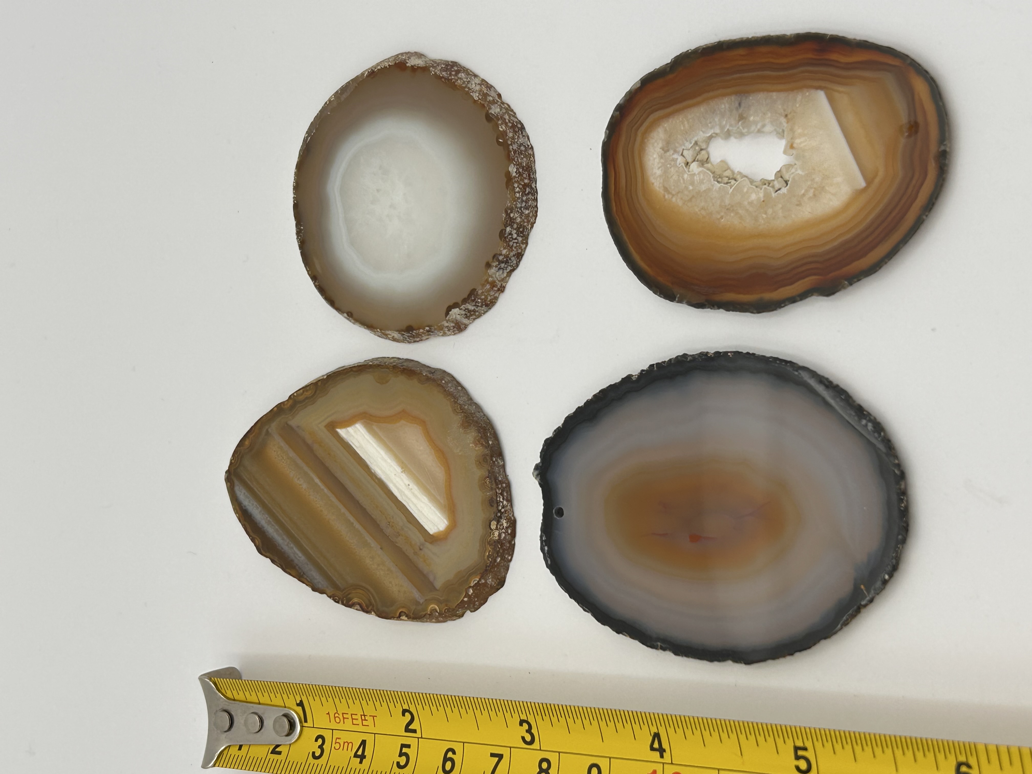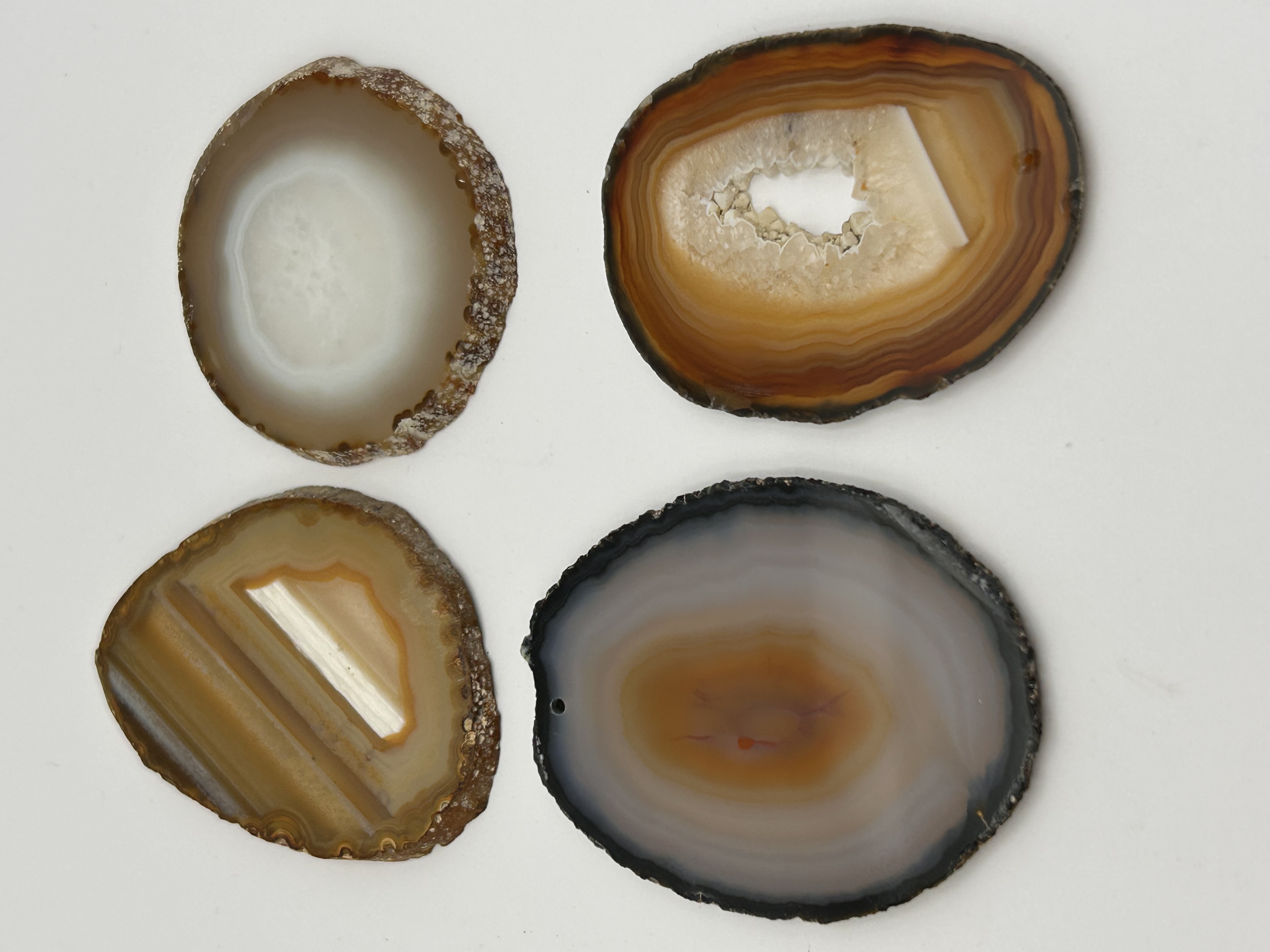 A collection of four natural polished agate slices, cut transversely to display the concentric banding and crystalline structures typical of geode formation. The material is chalcedony, exhibiting a natural spectrum of earth tones including browns, tans, whites, grays, and reddish-orange hues. Three of the slices retain rough, unpolished geode edges. The fourth slice (bottom left position) features a smoothly polished exterior edge and includes a small drilled suspension hole near the top, suggesting potential use as an ornament or pendant prior to being grouped with the others. These items are commonly marketed as decorative coasters or display pieces.