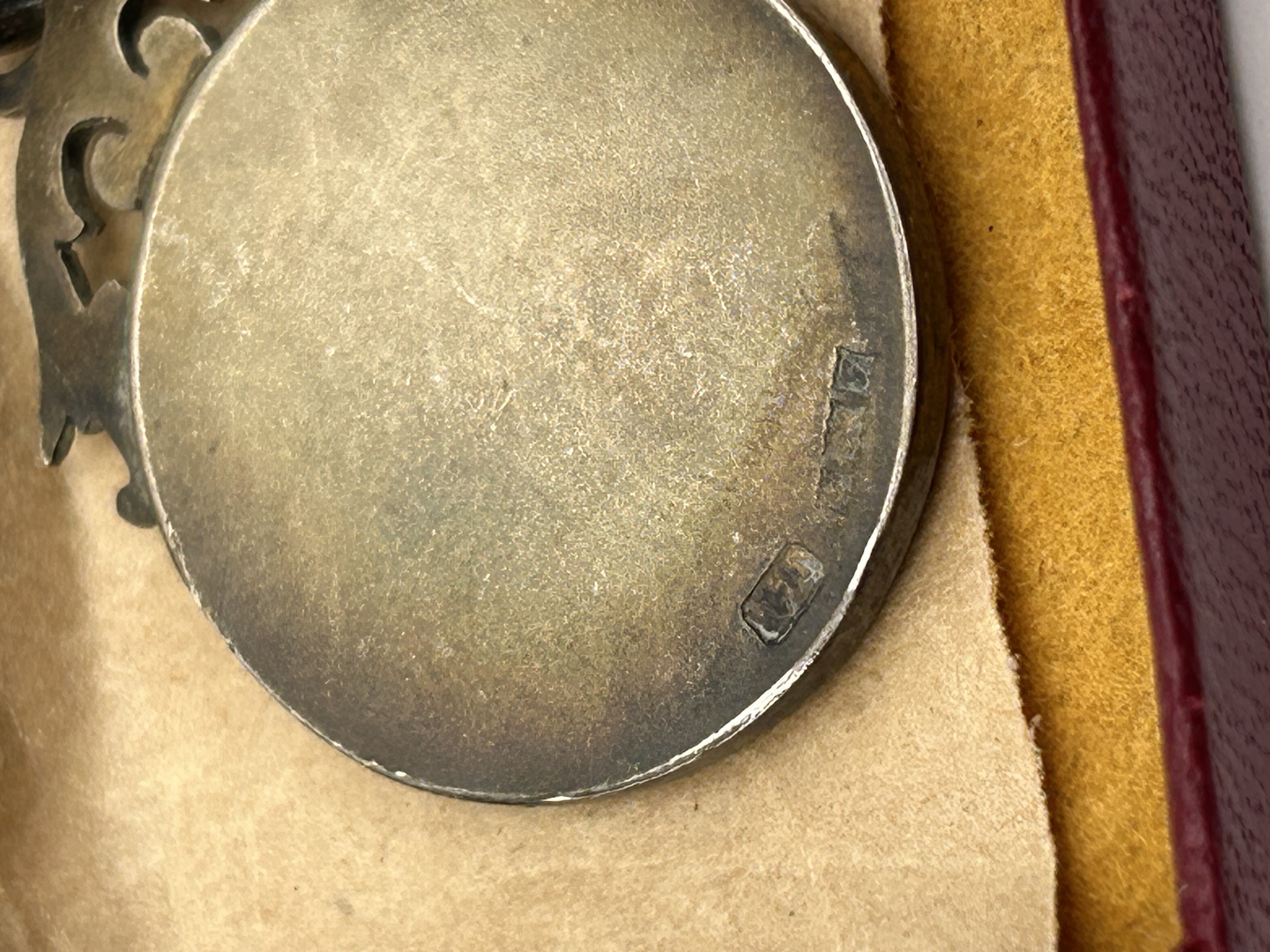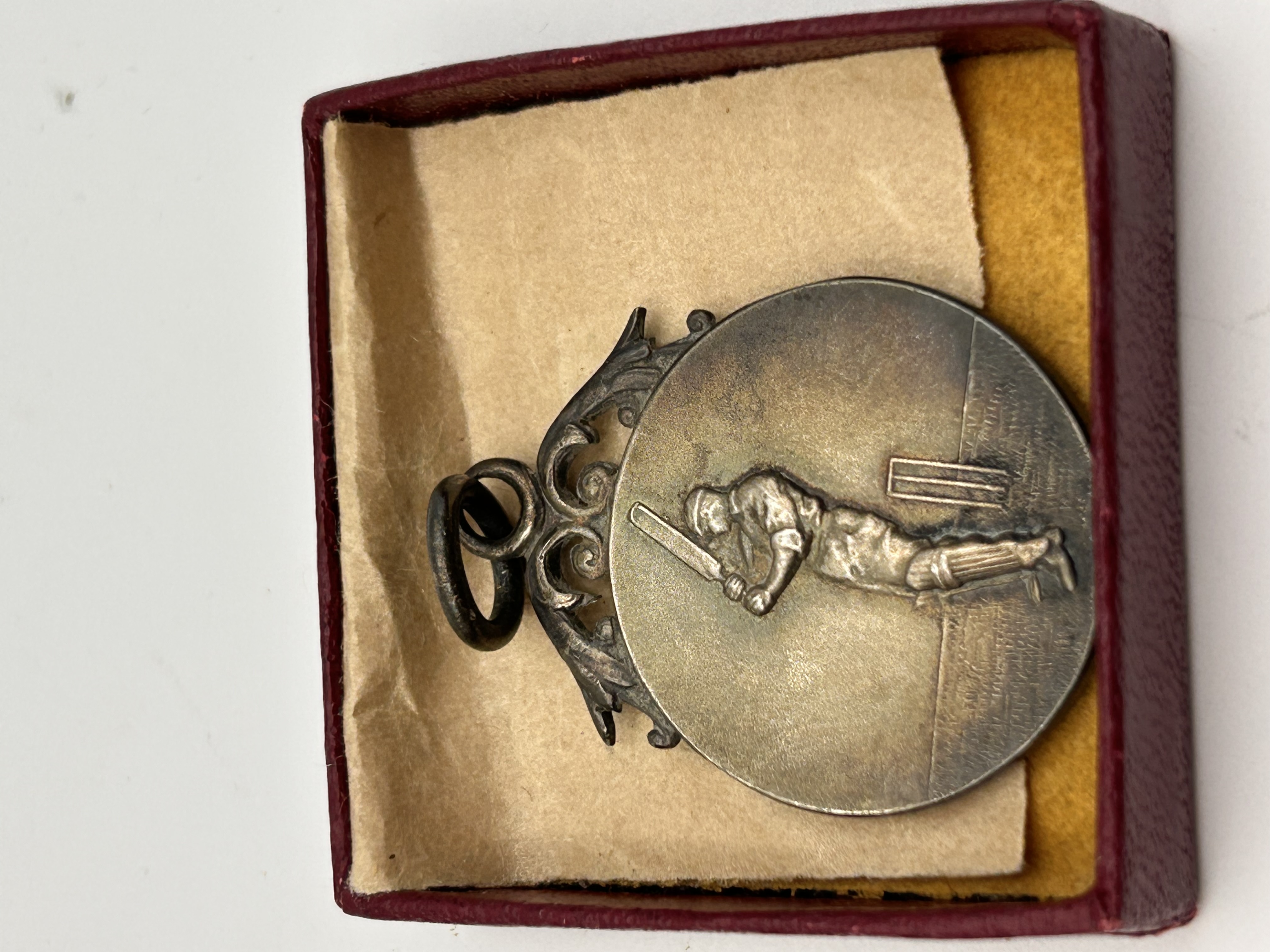 A single antique sporting medal, likely dating to the early-to-mid 20th century, depicting a cricket theme. The circular medal features an ornate, scrolled suspension loop and jump ring. The obverse displays a high-relief scene of a cricket batsman positioned ready to strike the ball before a set of stumps. The reverse is plain and exhibits two distinct, square hallmarks situated along the lower rim, suggesting a silver alloy or base metal construction. The medal is presented in its original, worn red/maroon presentation box, lined internally with mustard-colored velvet and tan paper.