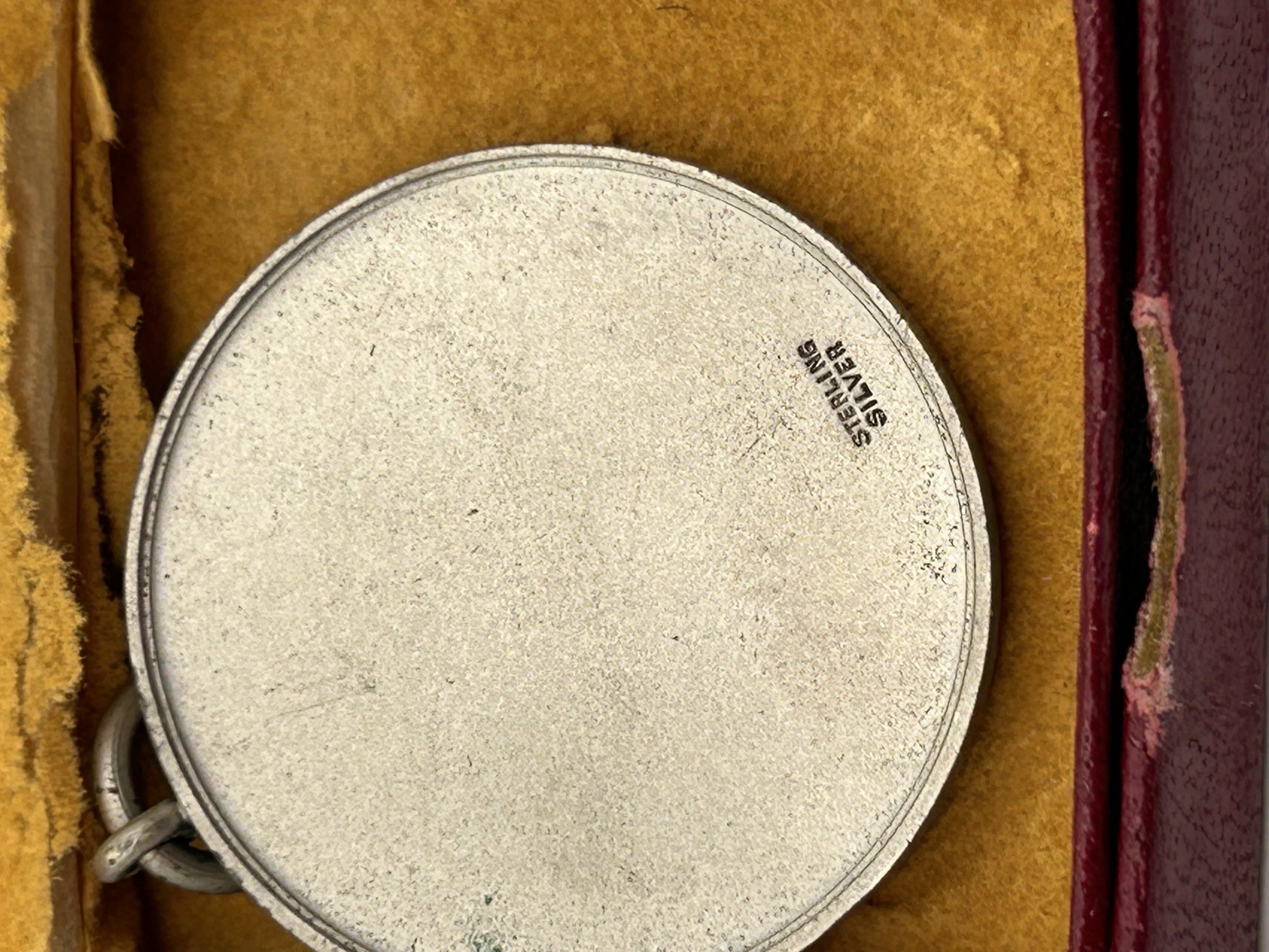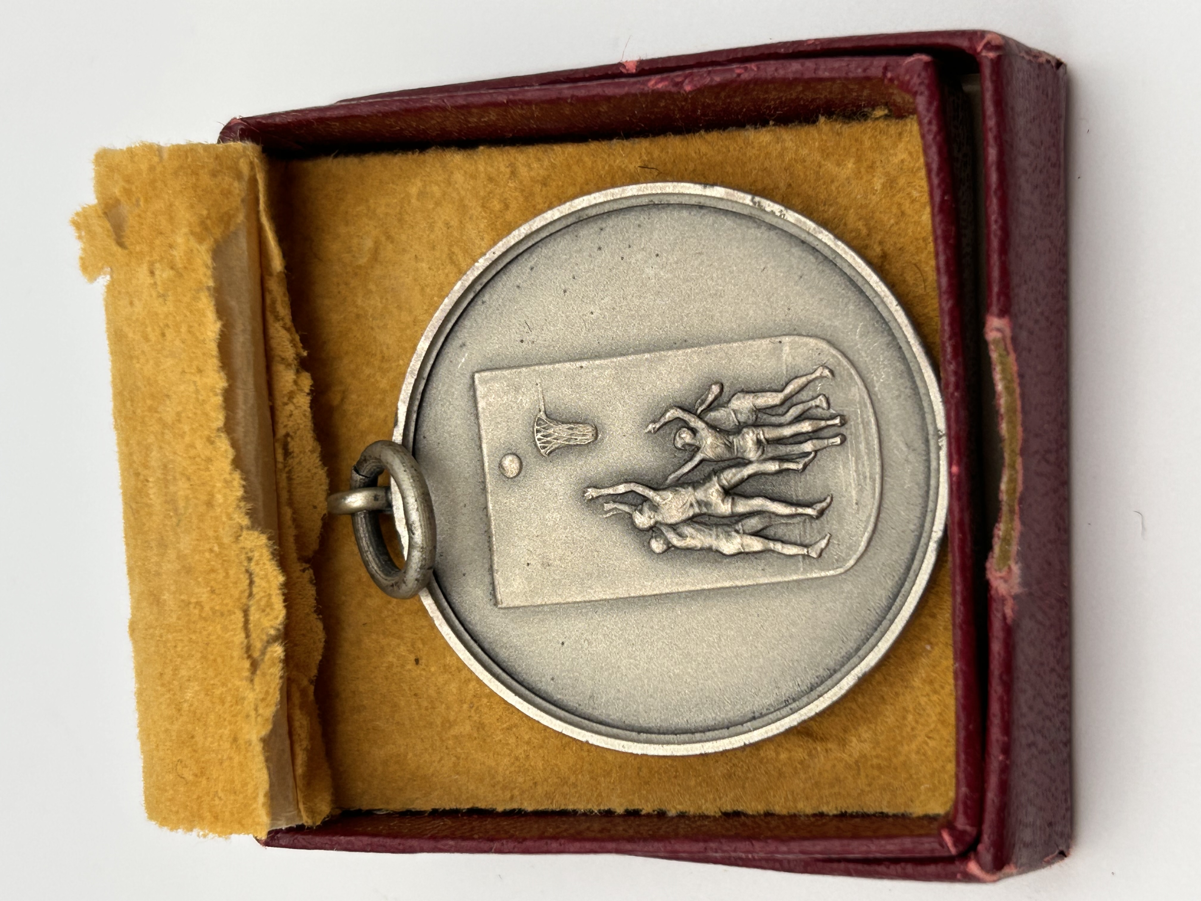 A single sterling silver sports award medal, consistent in style with pieces identified in the market as Wells pendants. The circular medal features a soldered suspension ring and loop for wear or display. The obverse side displays a high-relief rectangular scene depicting four basketball players competing for the ball beneath a net. The reverse side is clearly marked STERLING SILVER near the bottom edge, confirming the material composition. The medal is presented in its original burgundy cardboard box.