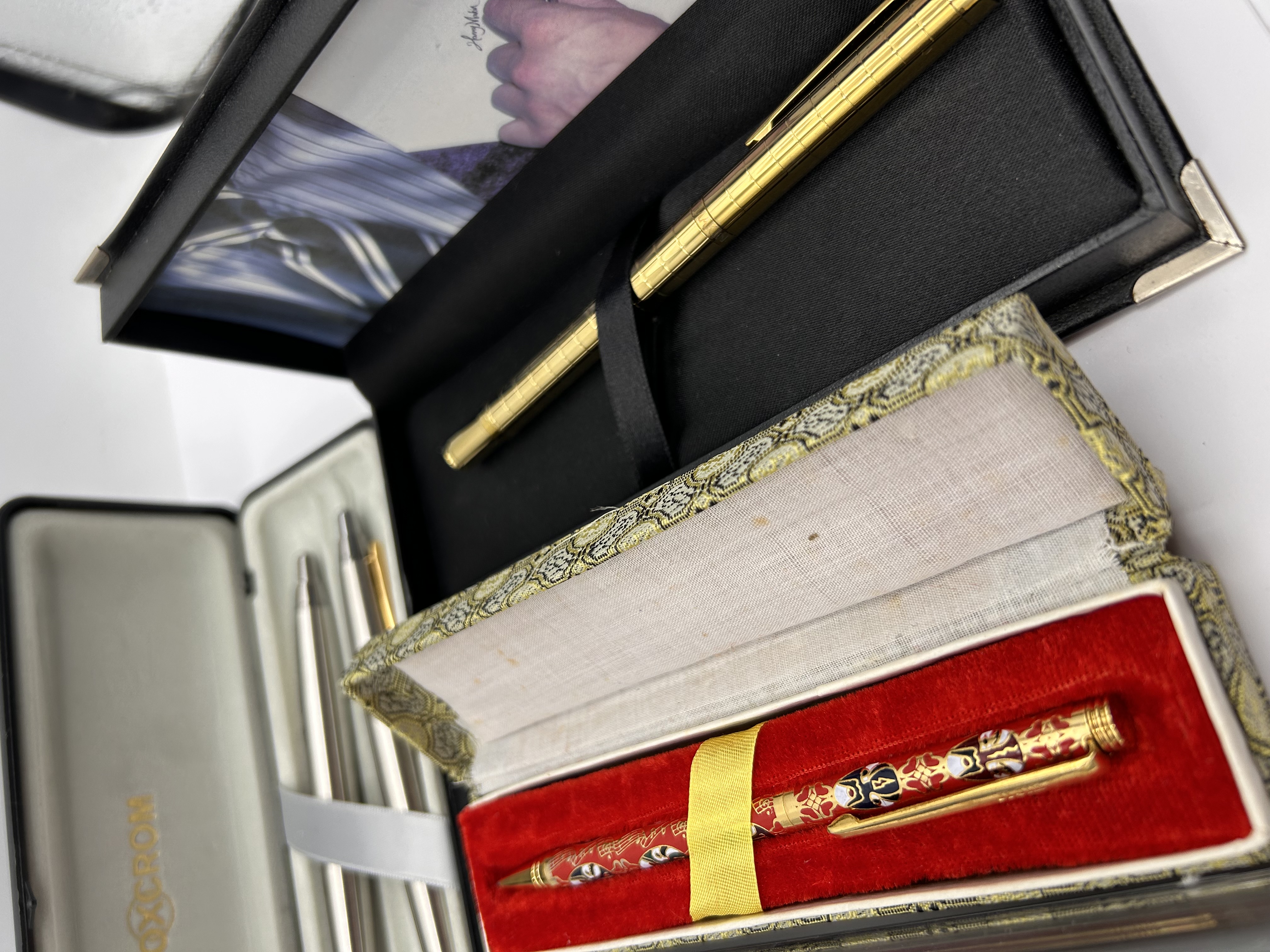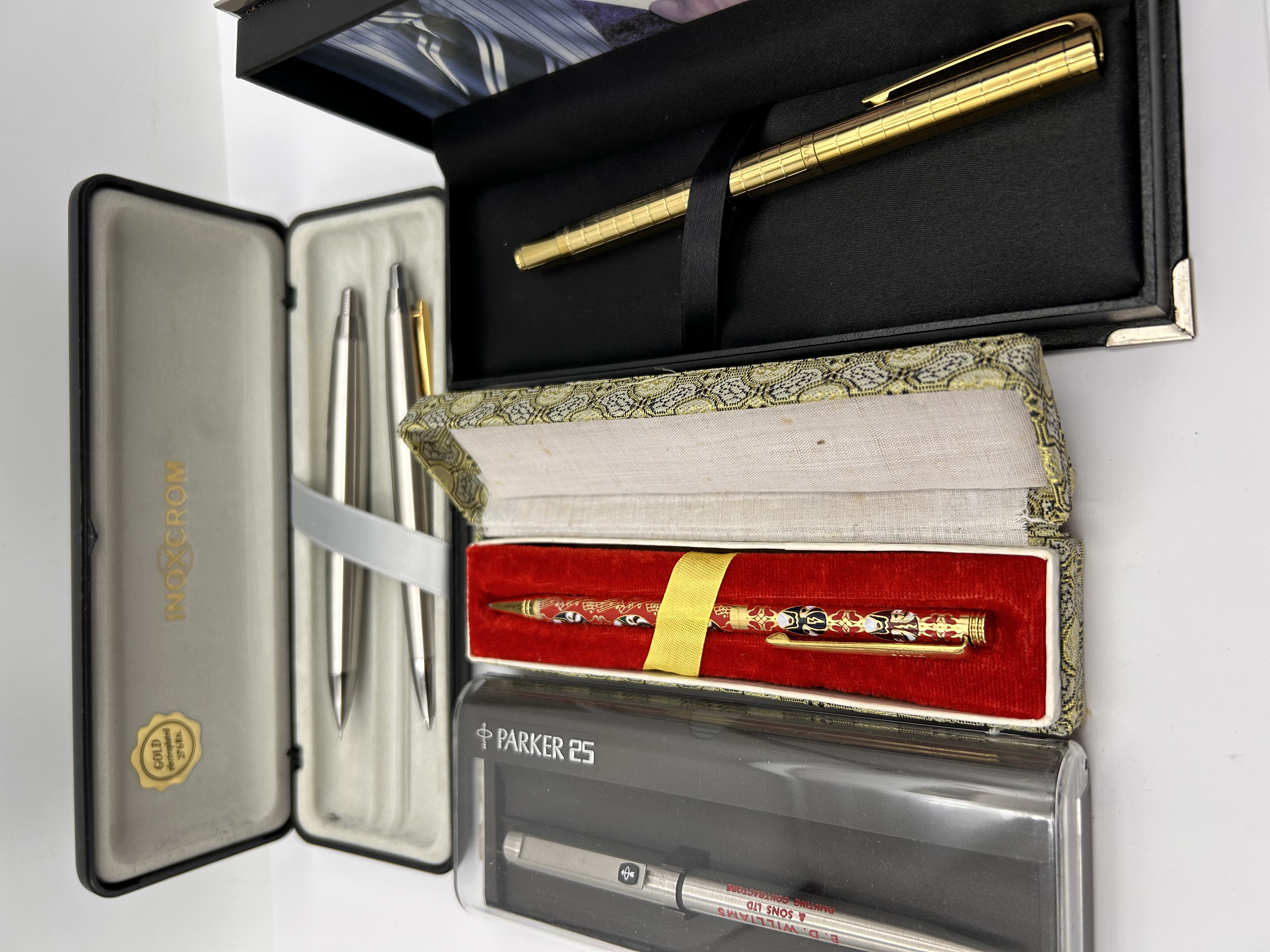 A collection of five modern writing instruments presented in four assorted cases. The lot includes a matching pair of silver-toned pens or pencils housed in a black Inoxcrom presentation case marked GOLD PLATED TRIM. A third silver-toned writing instrument, identified as a Parker 25, is contained in a clear case, featuring the corporate imprint E. D. WILLIAMS & SONS LTD in red lettering. The collection also features one brightly decorated red and gold pen, possibly lacquer or cloisonné, featuring stylized figures and presented in a fabric-covered box with a gold paisley pattern and red velvet lining. The fifth instrument is a smooth gold-toned pen presented in a simple black case.