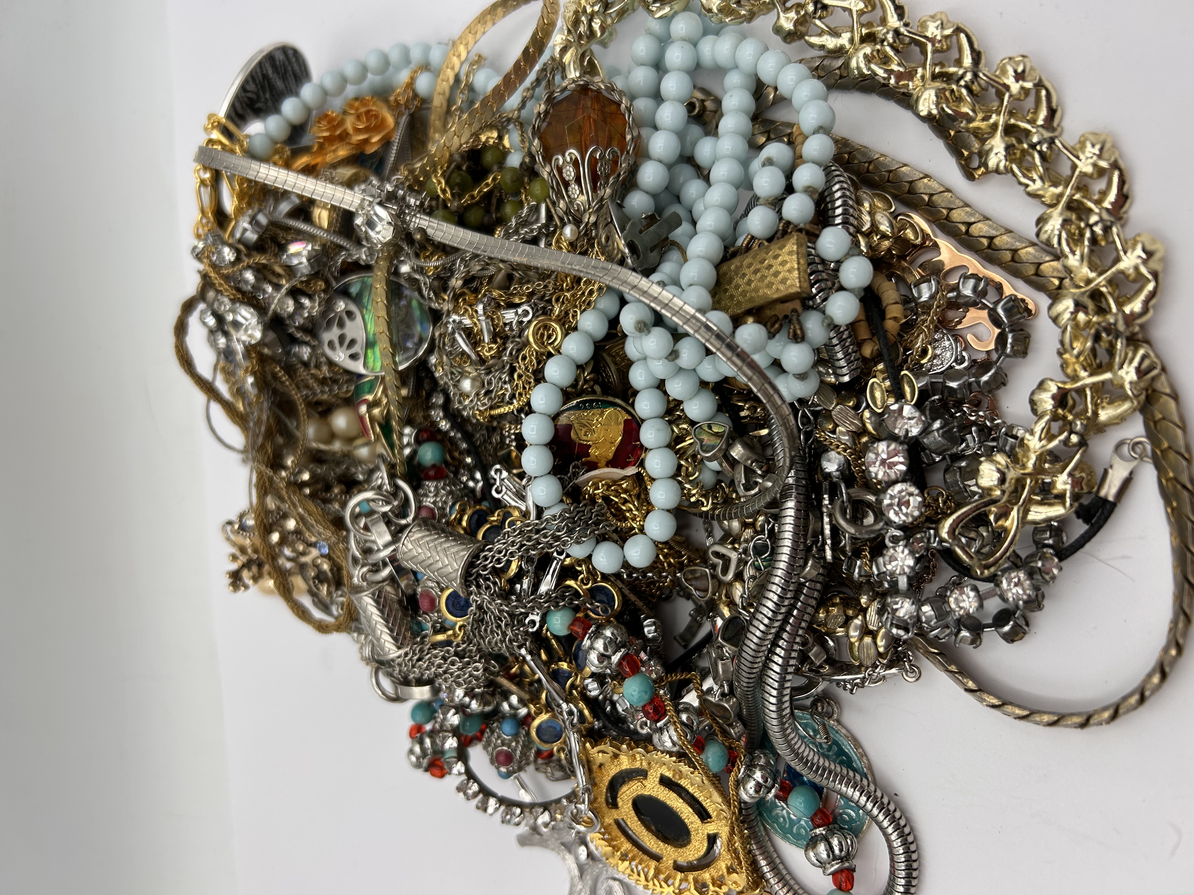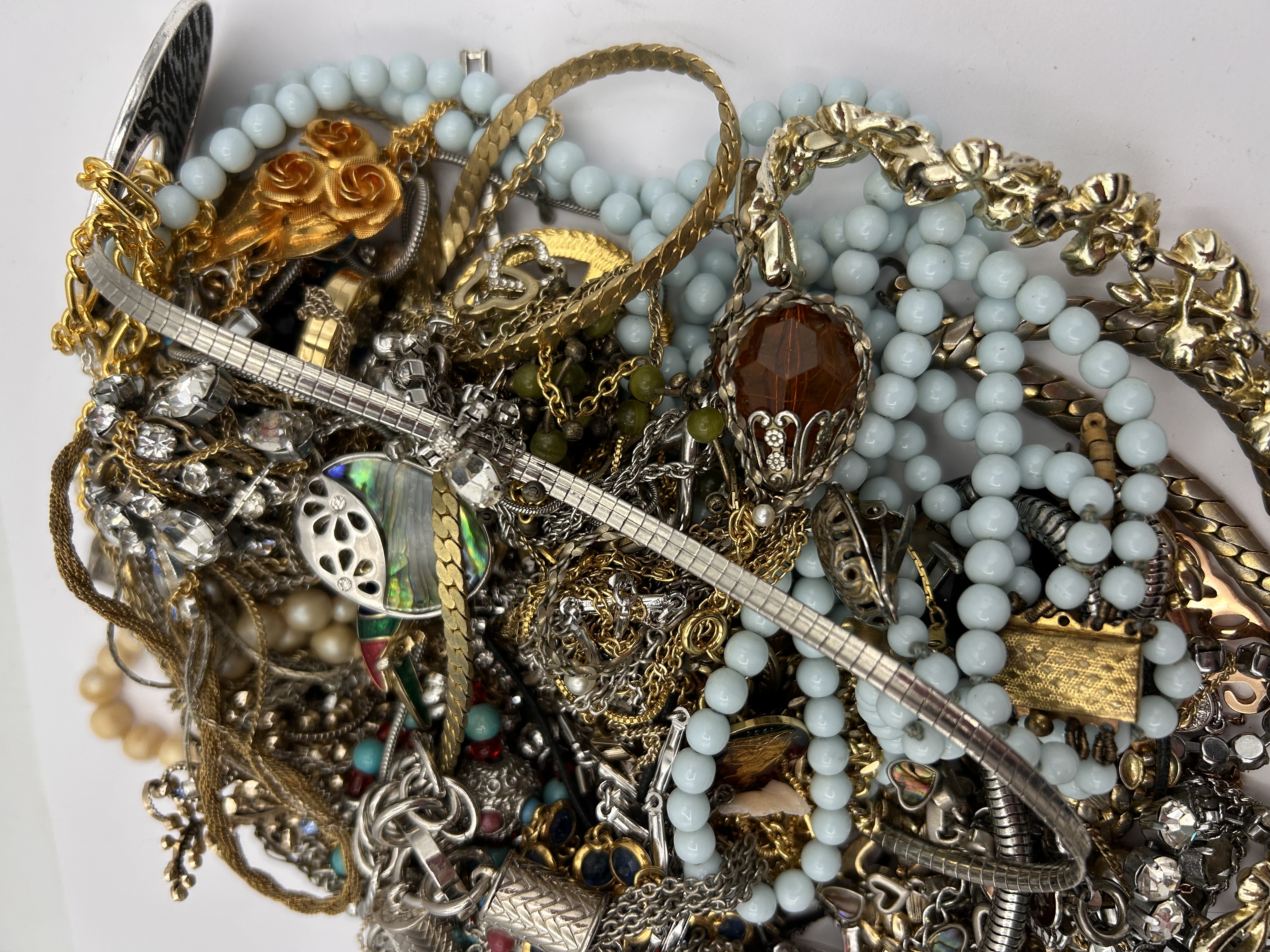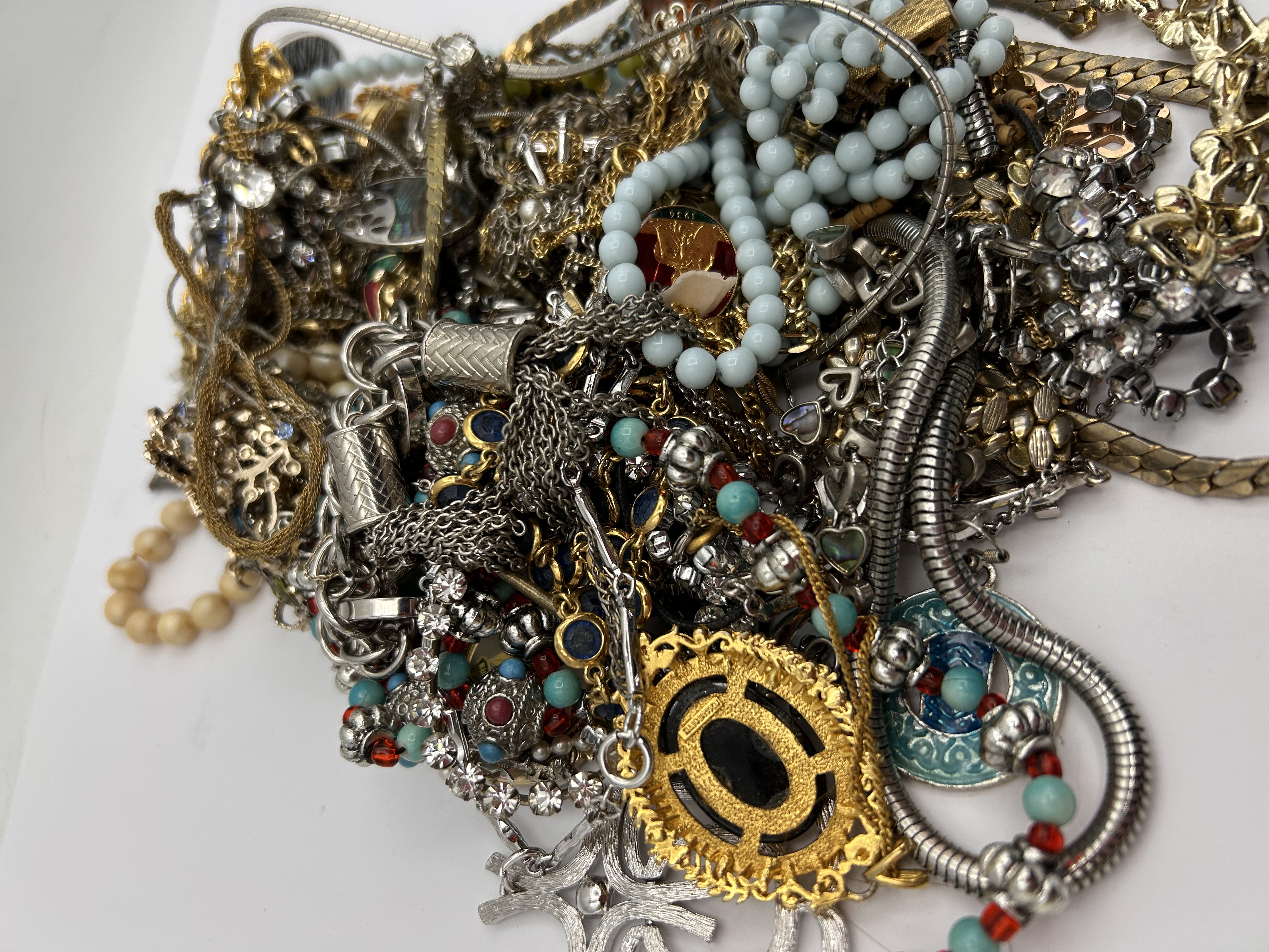 A substantial, unsorted bulk collection of costume jewelry, components, and crafting materials. The lot consists of various finished pieces including necklaces, bracelets, chains, and pendants, consistent with market offerings described as ‘mystery’ or ‘craft’ lots. Materials are primarily base metal alloys featuring contrasting gold-tone and silver-tone finishes. Decorative elements include numerous strands of light blue glass or plastic beads, faux pearls, clear and colored rhinestones, red and turquoise-colored enamel or cabochons, and one pendant inlaid with abalone shell. Specific styles observed include thick snake chains, wide textured link chains, thin link chains, and several large statement pendants, such as a prominent gold-tone piece featuring a black oval cabochon. The collection represents a variety of styles and periods.