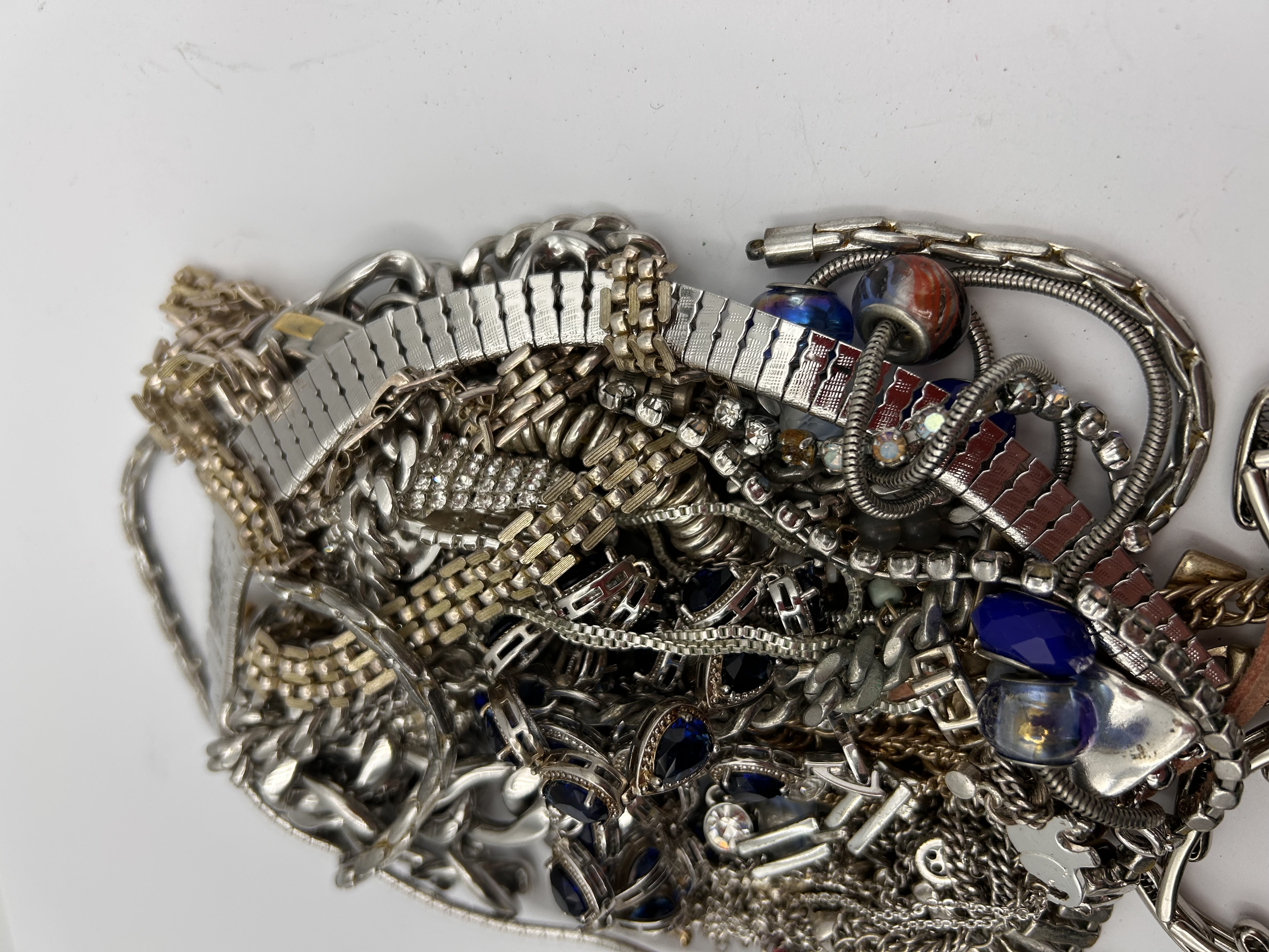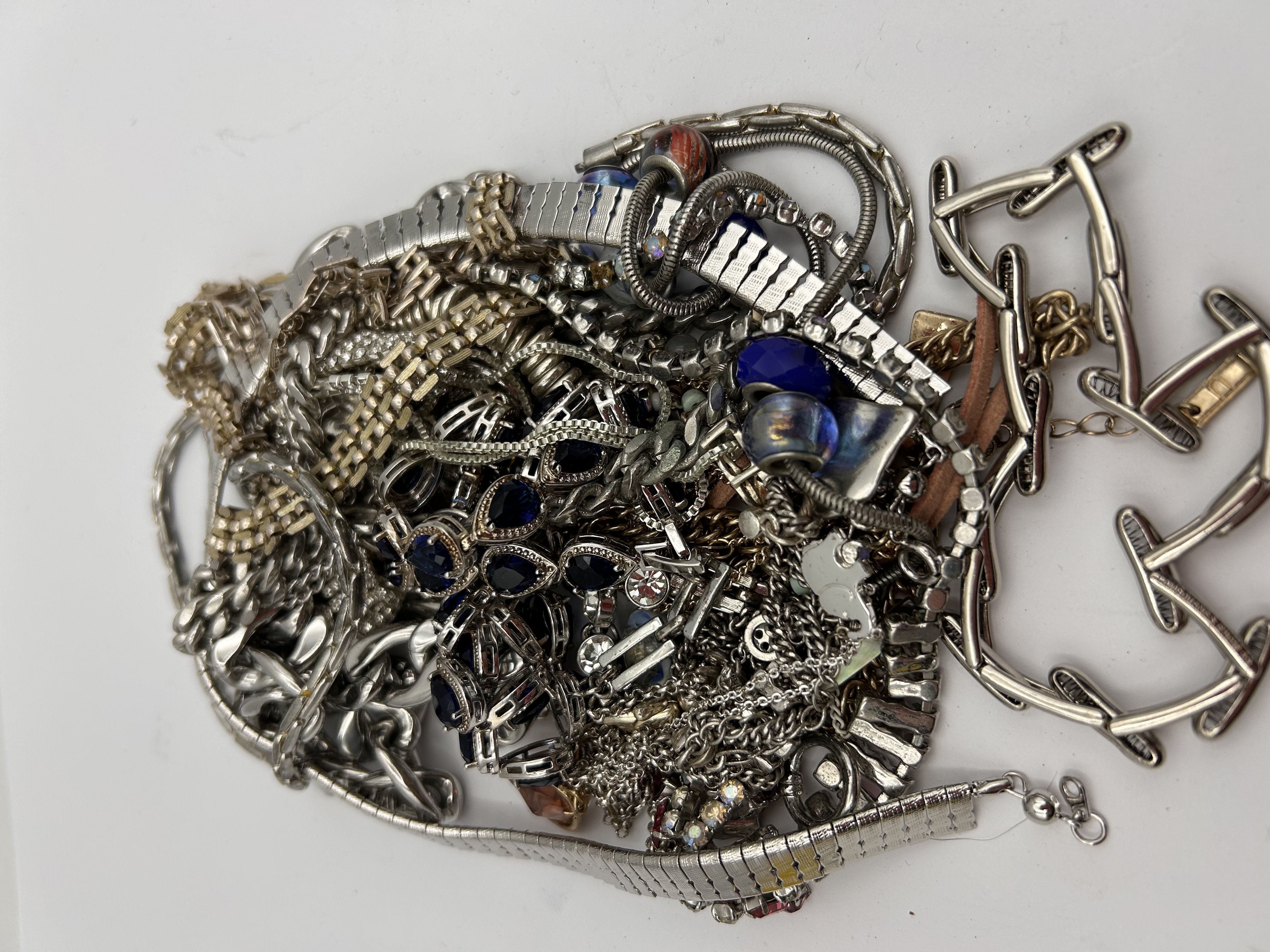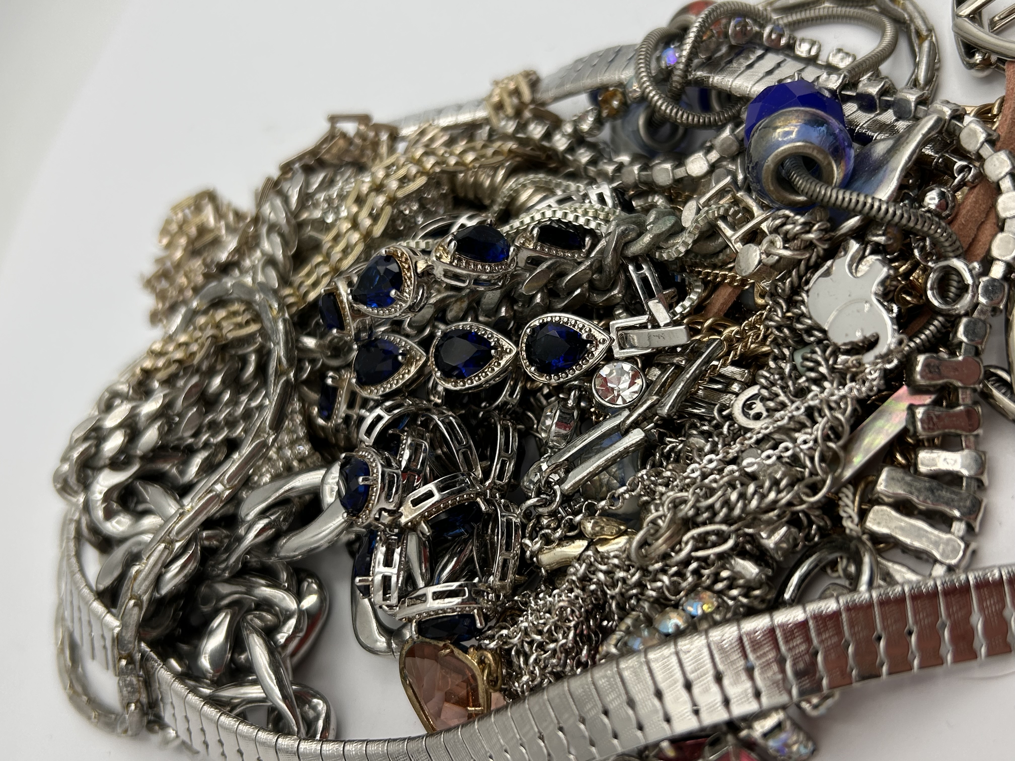 A large, unsorted bulk lot of miscellaneous costume jewelry, consistent with market descriptions of “scrap bulk” lots intended for craft or repair. The collection consists of numerous tangled items including necklaces, chains of various weights and links, bracelets (some resembling watch bands), and rings. The majority of the items are constructed from base metals with mixed silver-tone and gold-tone finishes. Decoration includes imitation gemstones such as faceted rhinestones in clear, deep sapphire blue (including teardrop and heart shapes), and light pink, alongside various glass beads. No legible maker’s marks or text are visible due to the density and tangling of the pile. This lot is sold for parts, repair, or scrap purposes.