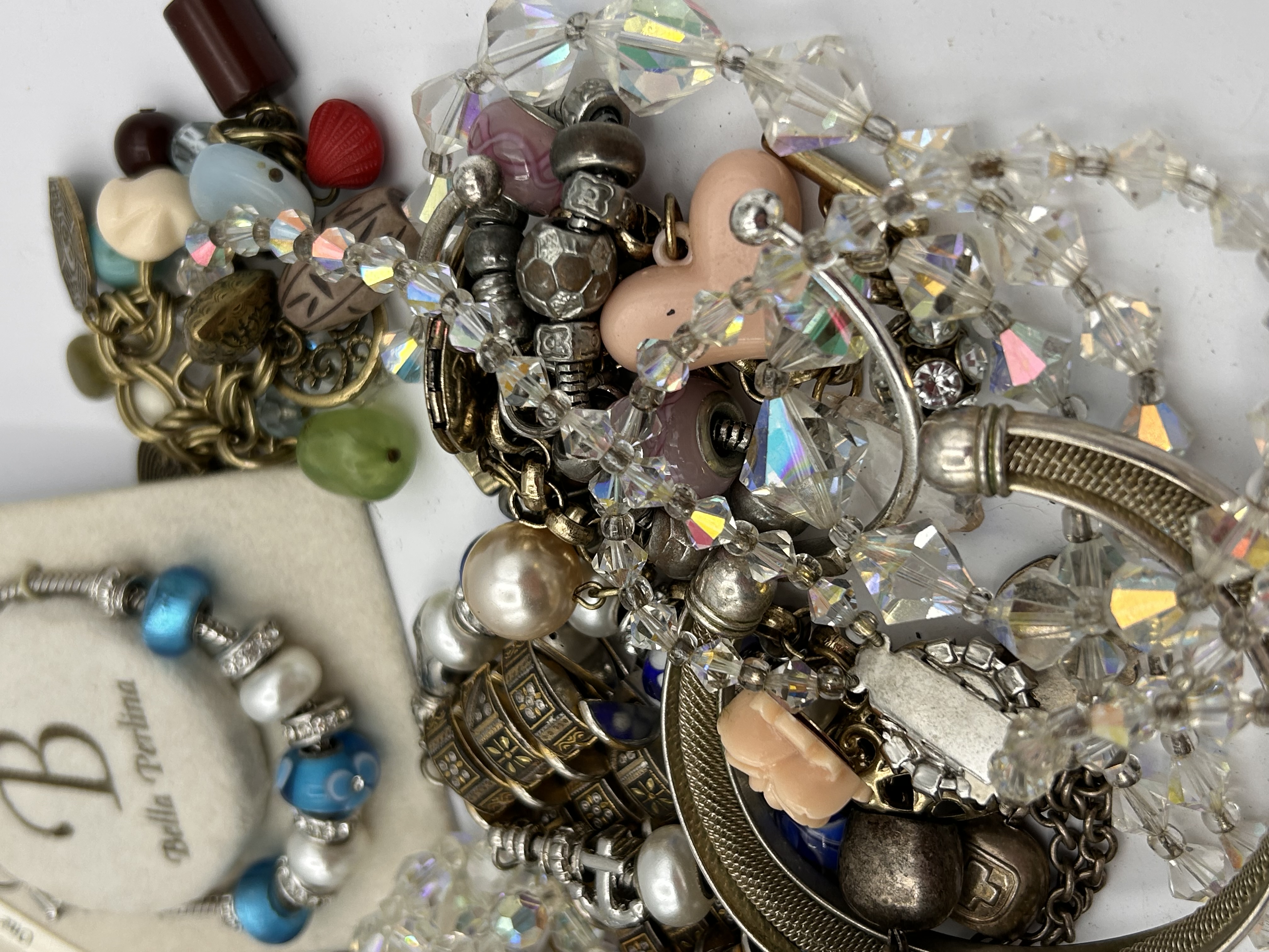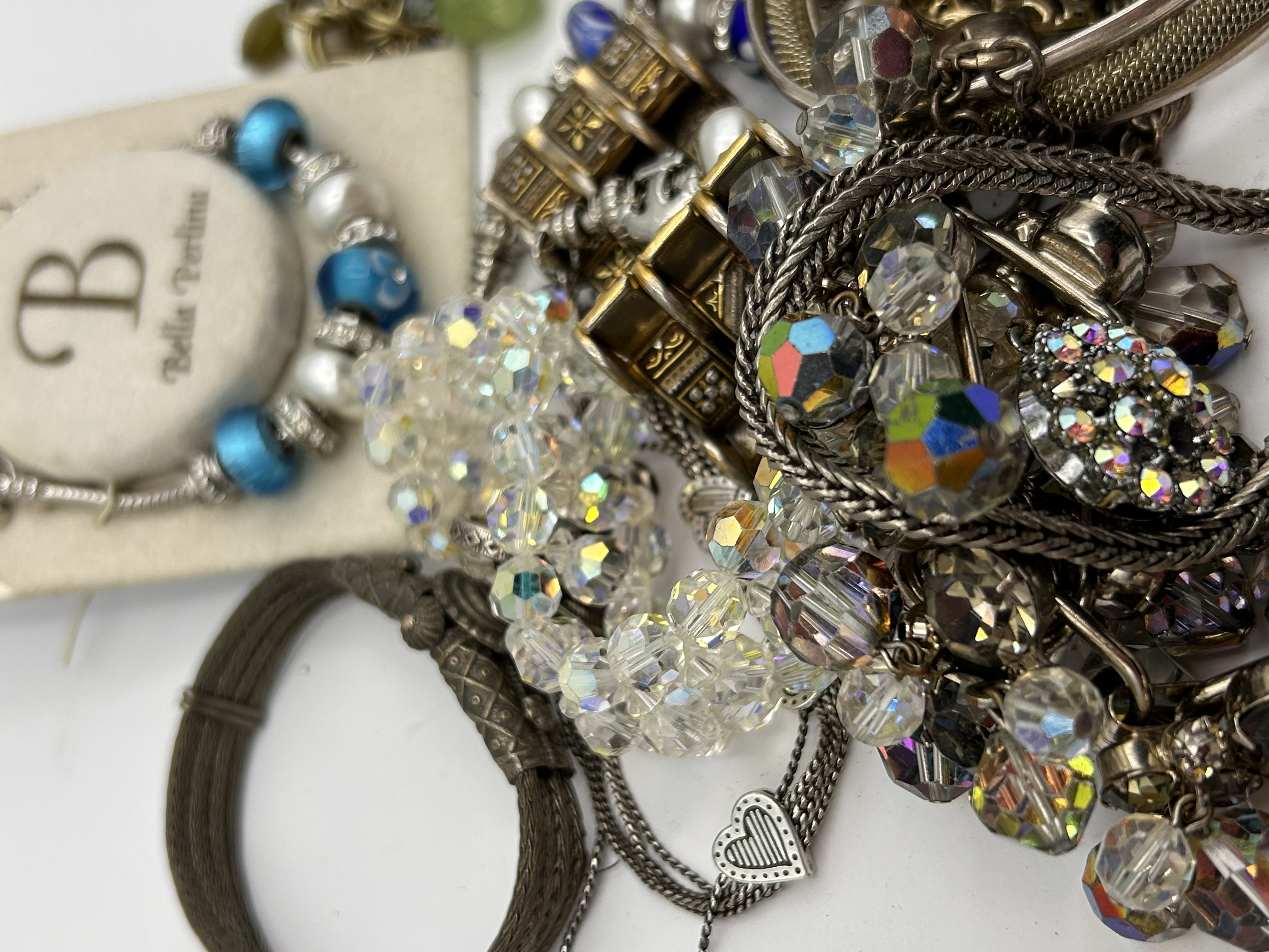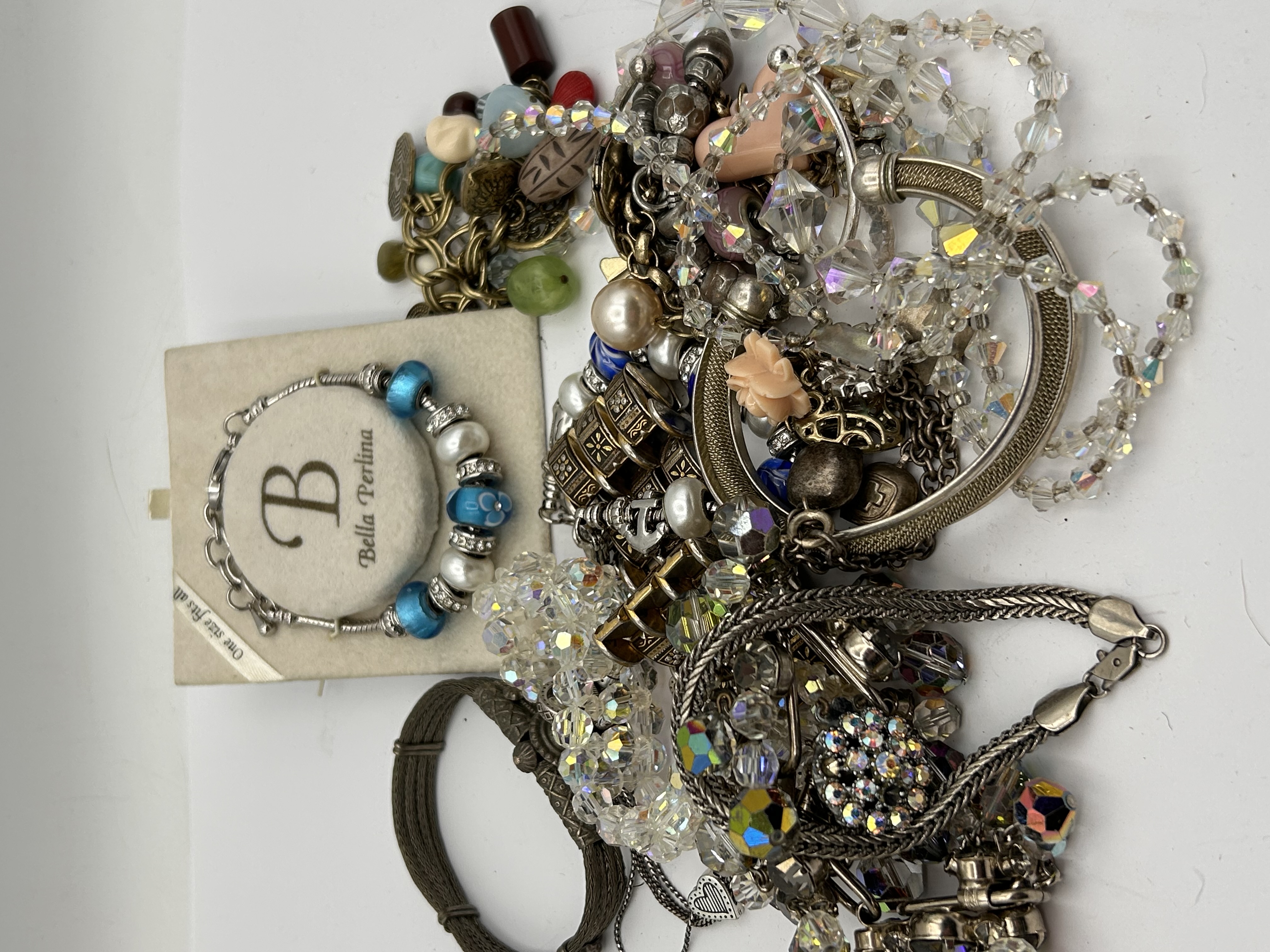 A collection of 12 pieces of contemporary costume jewelry, predominantly bracelets, bangles, and beaded strands. The lot features mixed base metals (silver-tone and gold-tone), various glass beads, faux pearls, and plastic/resin components. A significant portion of the collection is characterized by abundant faceted, iridescent (Aurora Borealis) clear crystal beads, along with various charms, including carved pink resin hearts and flowers. One silver-tone chain bracelet with blue glass beads and faux pearls is presented on its original card marked One size fits all and featuring the brand name Bella Perlina. Other pieces include a heavy dark brown wire bangle and a wide silver-tone textured cuff.
