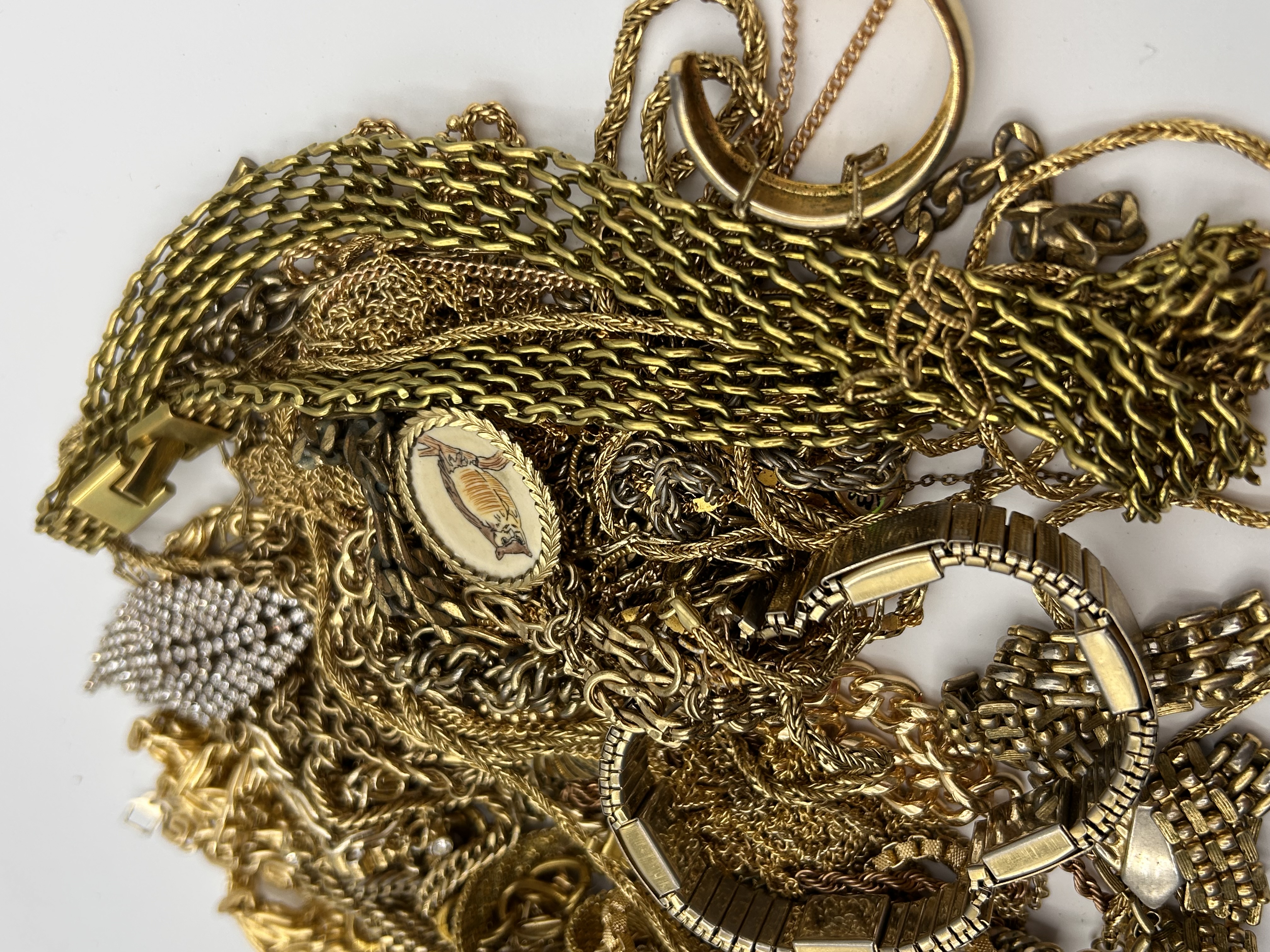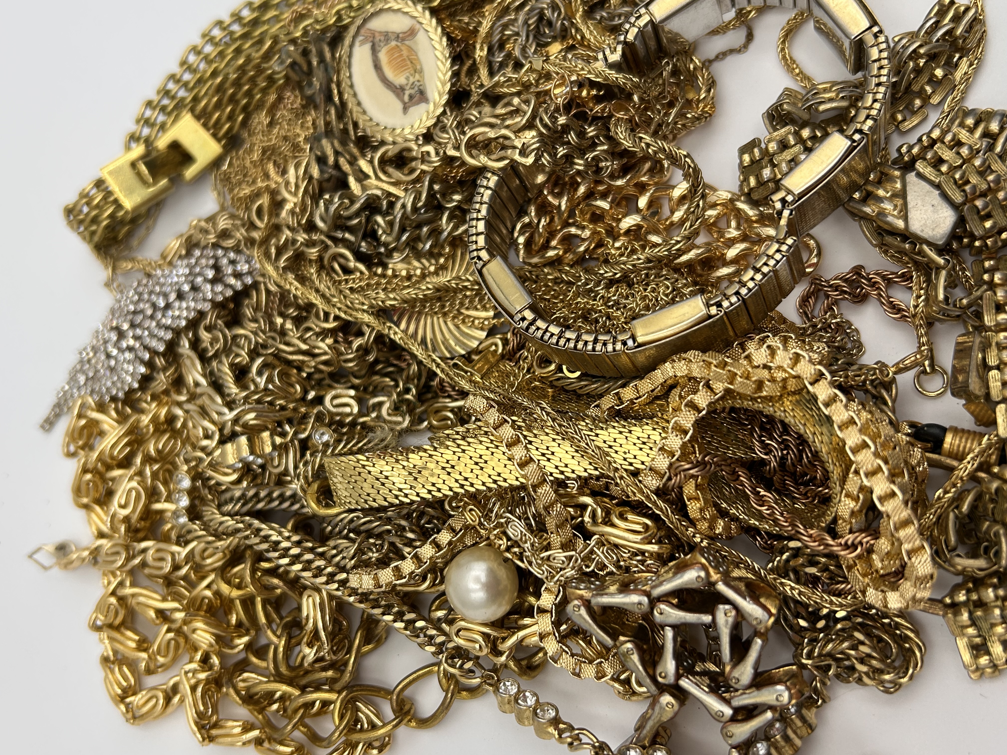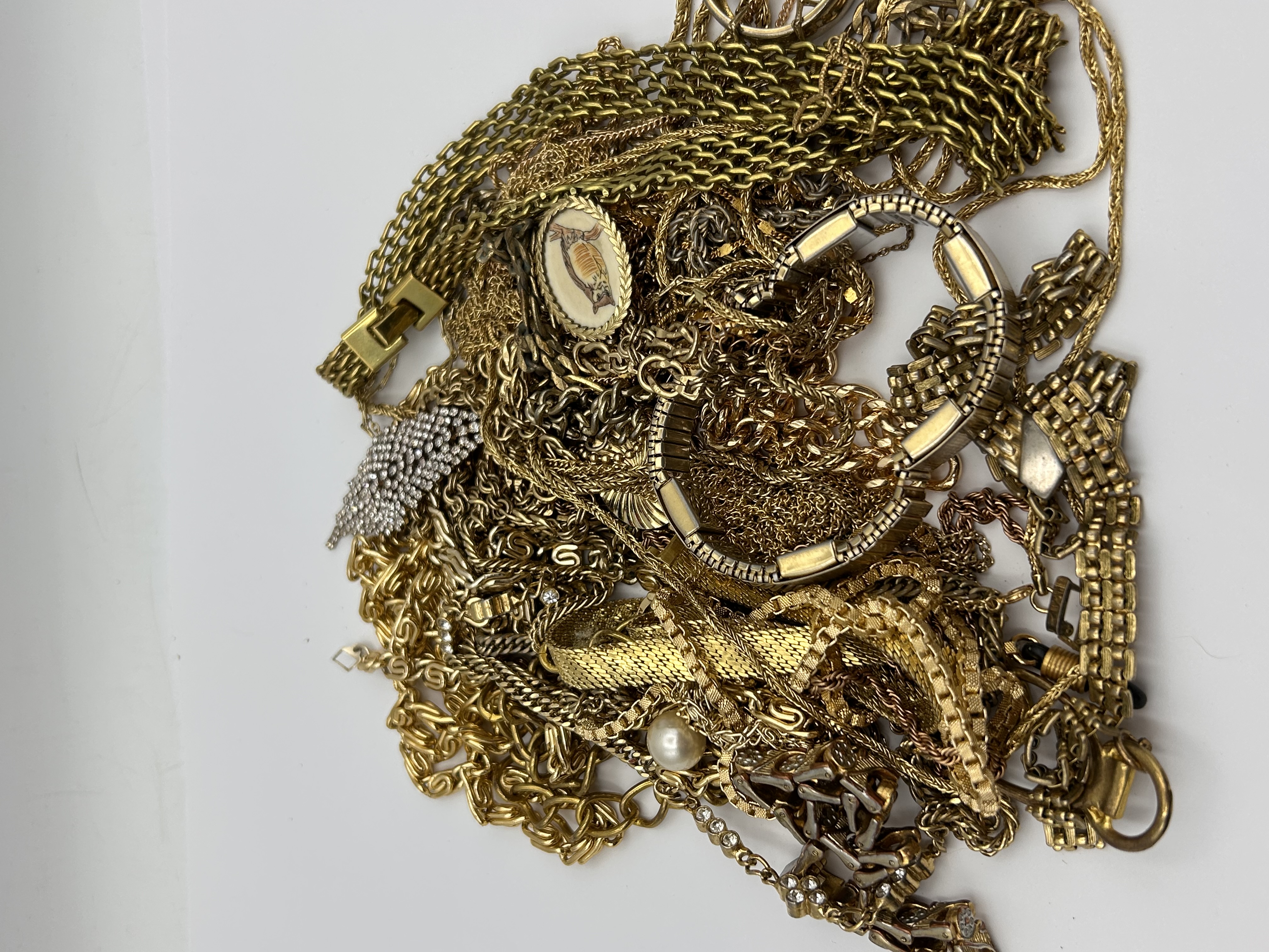 A substantial quantity of miscellaneous costume jewelry, primarily composed of gold-tone base metal components, chains, and bracelets. The lot includes numerous chains of varying link styles, such as curb, rope, and woven patterns. Observable distinct items include a wide expansion bracelet or watch band, a large brooch or clip heavily set with clear paste stones or rhinestones, an oval pendant or charm featuring a stylized fish motif set in enamel or resin, and a single large faux pearl. The collection is characterized by mixed construction and materials consistent with bulk costume jewelry intended for craft, repair, or scrap.