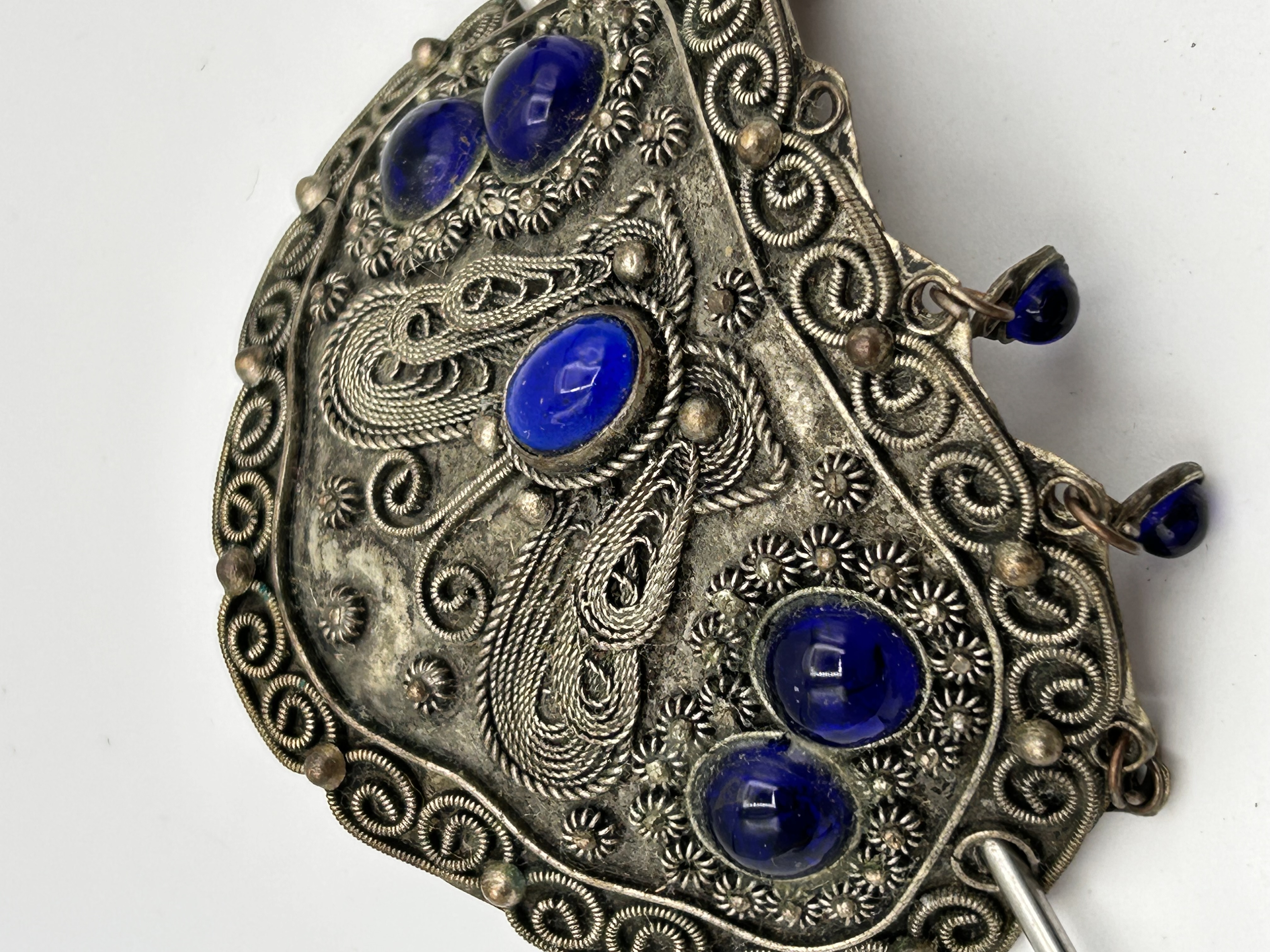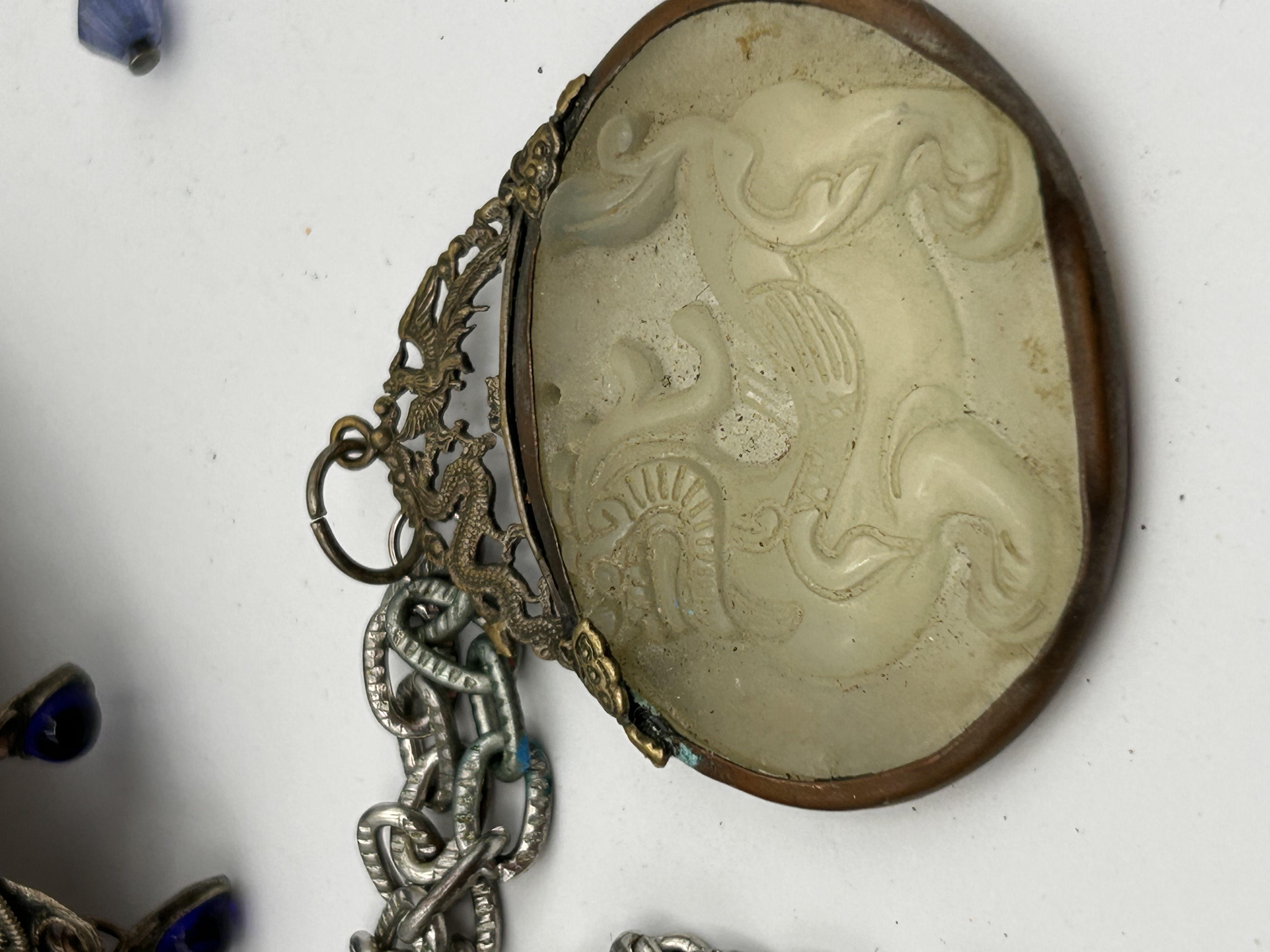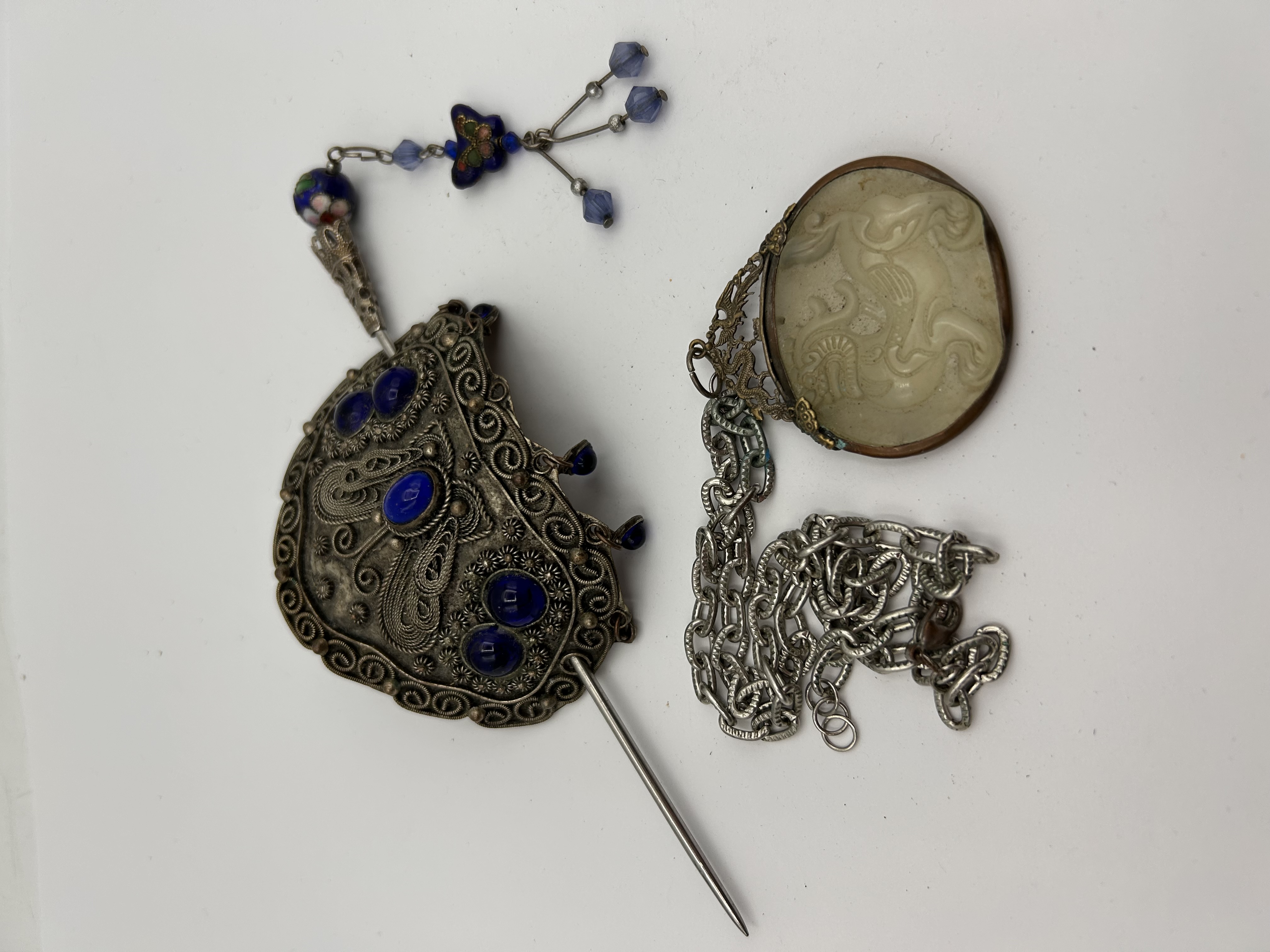 The lot comprises two pieces of vintage East Asian style jewelry. The first item is a hair ornament or chignon pin, constructed of metal identified in research as likely silver, featuring extensive filigree and granulation work forming stylized animal or bird motifs. The main body is set with multiple cabochon-cut dark blue glass stones. A complex dangle is attached, featuring small blue glass beads and enameled butterfly elements. The second item is a necklace assembly. It features an oval-shaped pendant inset with a raised, carved pale yellow or white hardstone depicting a mythological creature, possibly a Qilin. This inset is framed by a bronze or brass-toned metal mount decorated with dragon or bird motifs at the bail. The pendant is suspended from a separate silver-toned link chain.