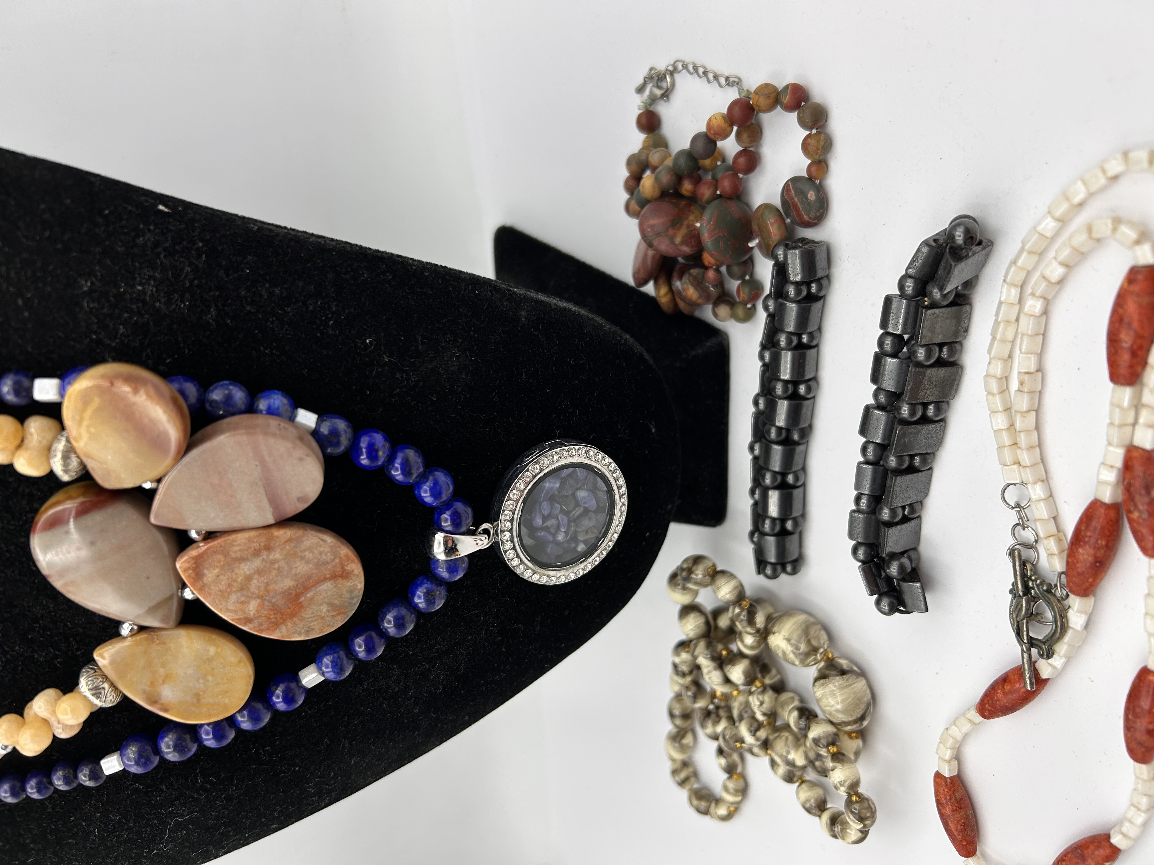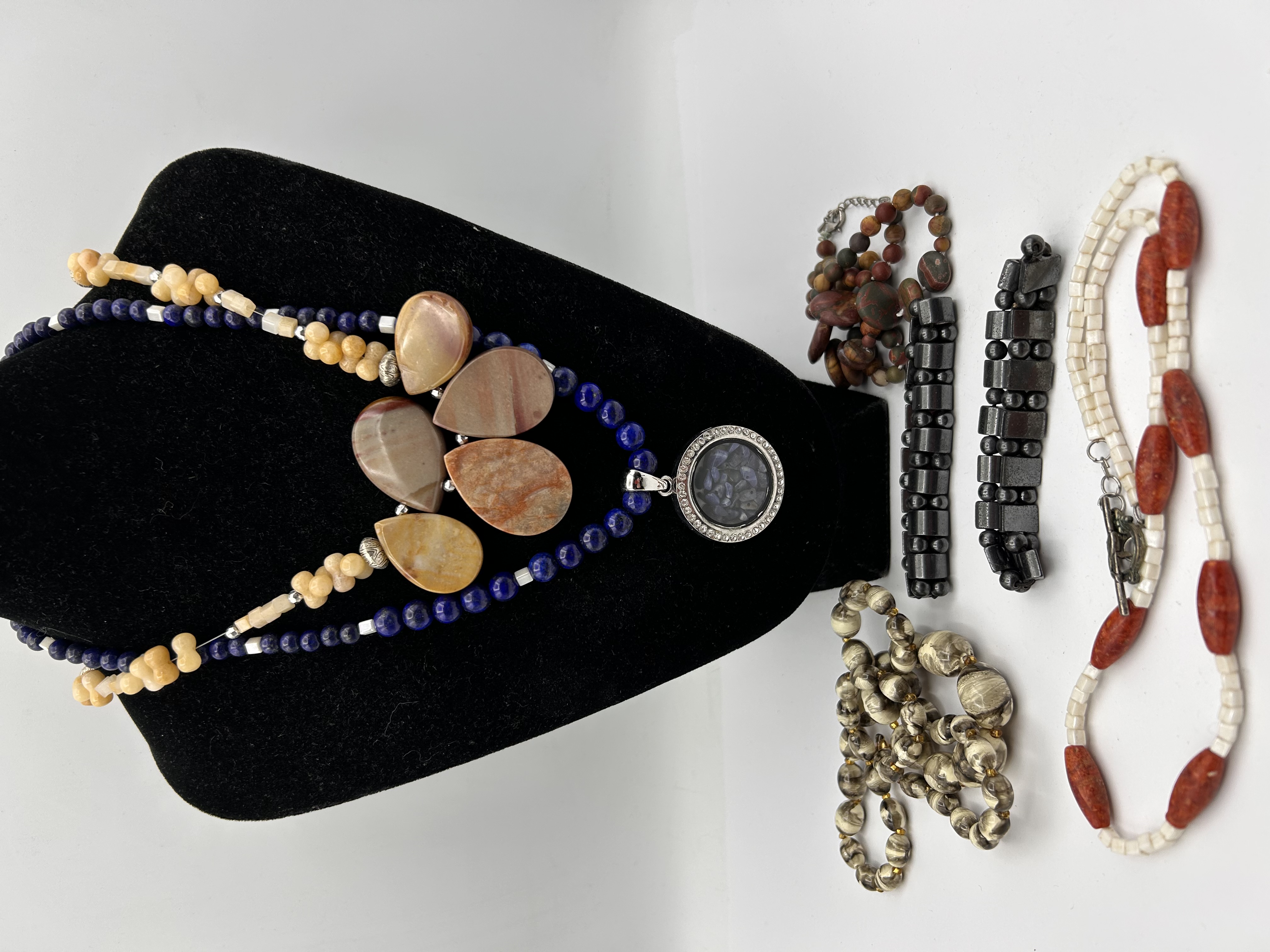 A collection of six contemporary beaded jewelry items utilizing natural stone and organic materials. The collection includes one complex multi-strand necklace displayed on a velvet bust and five assorted bracelets and necklaces. The centerpiece necklace features polished round dark blue beads, identified as Lapis Lazuli or Sodalite, paired with polished, irregularly shaped, earth-toned cabochons, likely Mookaite Jasper or Agate. The necklace terminates in a silver-tone circular pendant holding a dark blue cabochon encircled by clear accent stones. The five loose items comprise two stretch bracelets constructed of rectangular, dark gray links consistent with Hematite; one long strand of coiled, patterned organic or paper-style beads; one shorter strand of small, varied reddish Jasper beads; and one bracelet or necklace featuring segmented red pieces, likely Red Coral, alternating with small square white beads, secured by a toggle clasp.