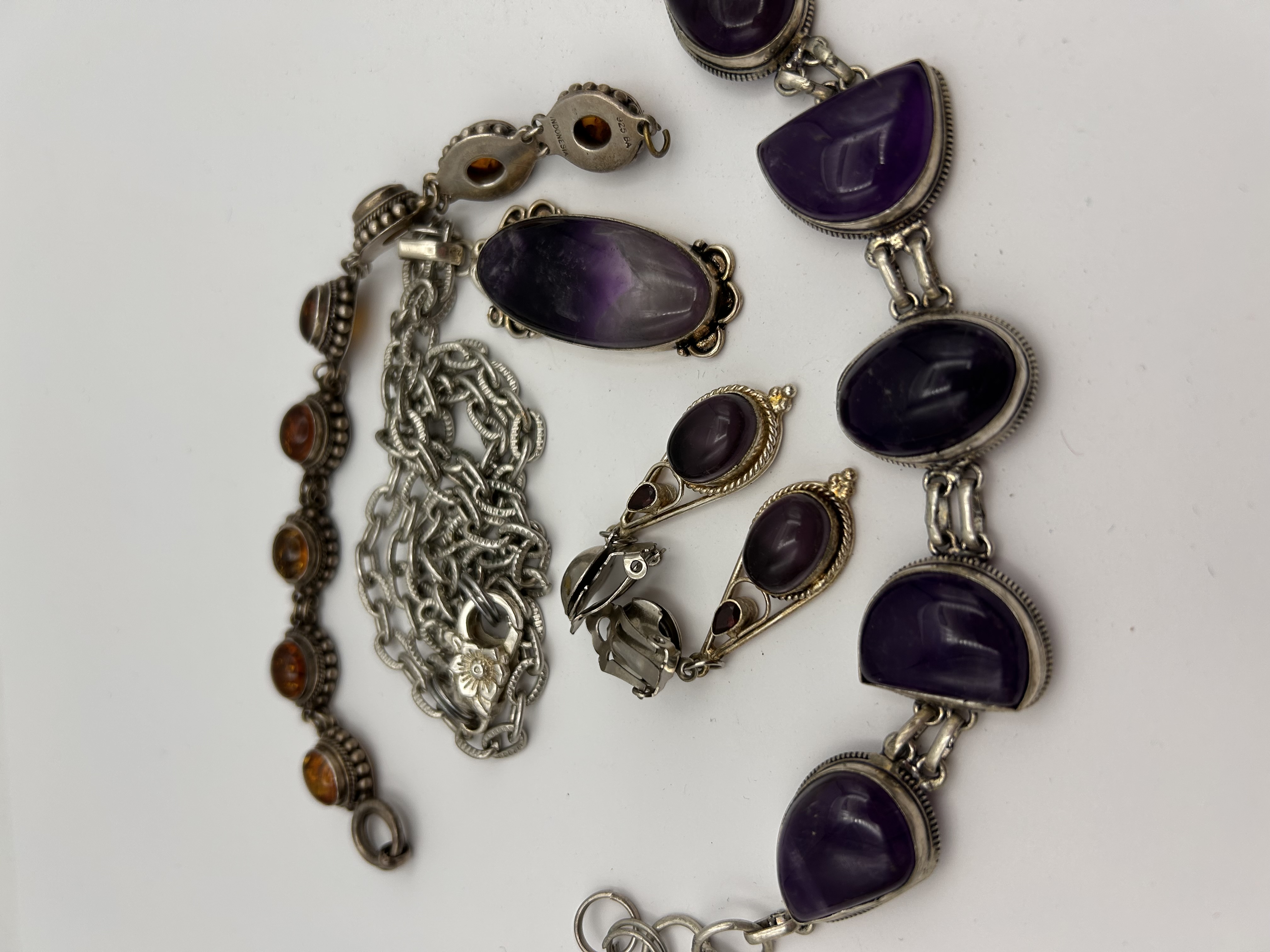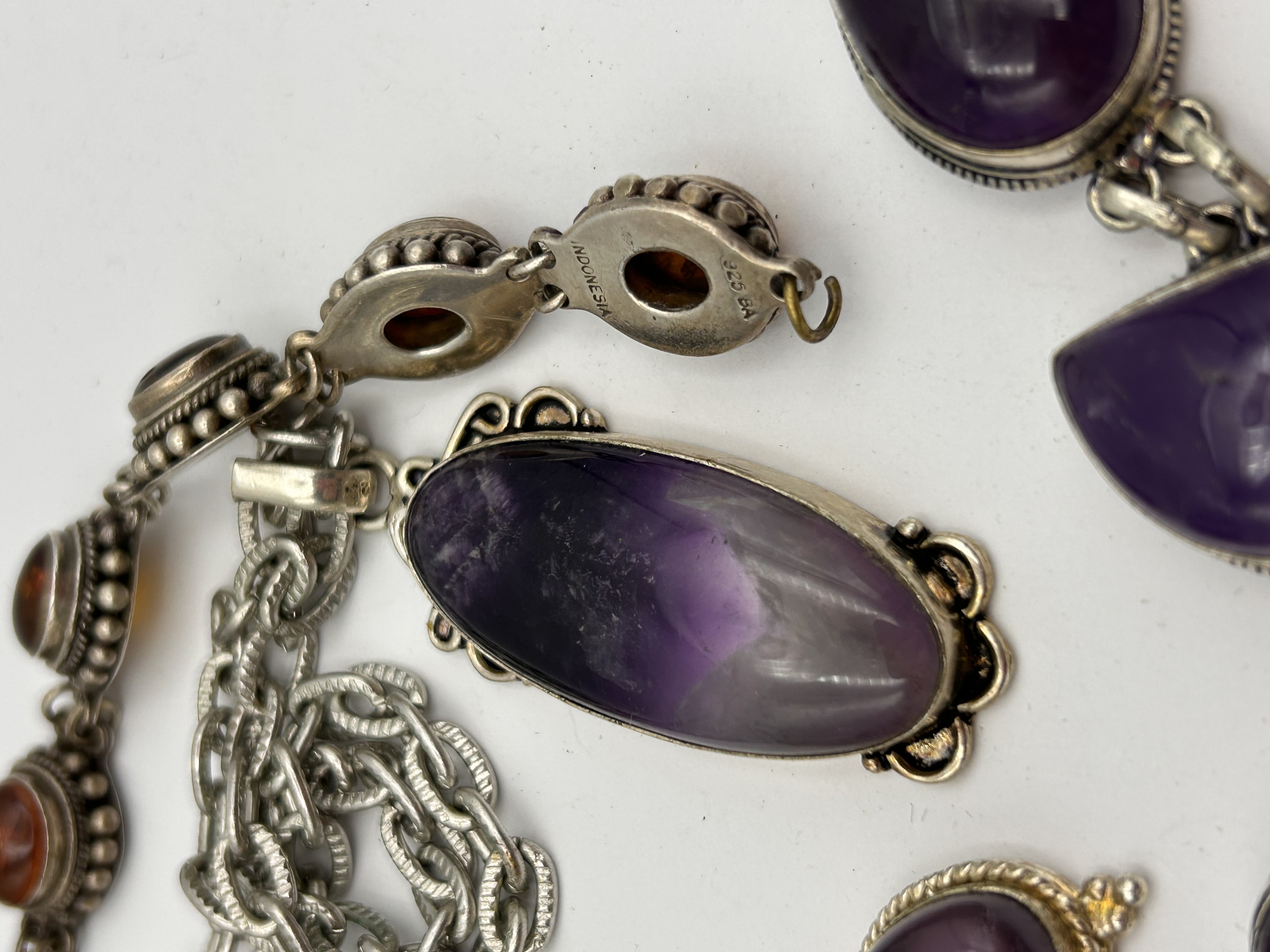 A collection of four pieces of jewelry featuring bezel-set natural stones, marked “INDONESIA” and “925 BA” on the reverse of a pendant link assembly. The lot includes two bracelets, one necklace, and one pair of earrings. The first bracelet is linked, set with multiple small, round amber cabochons. The second bracelet is heavy-linked, set with large oval and D-shaped deep purple amethyst cabochons. The necklace comprises a heavy cable-link chain and a large, elongated oval pendant set with a bi-color cabochon, likely amethyst or quartz, exhibiting a gradient from deep purple to clear/gray. The pair of clip-on drop earrings are set with smaller purple stones. The overall style is ethnographic or artisan.