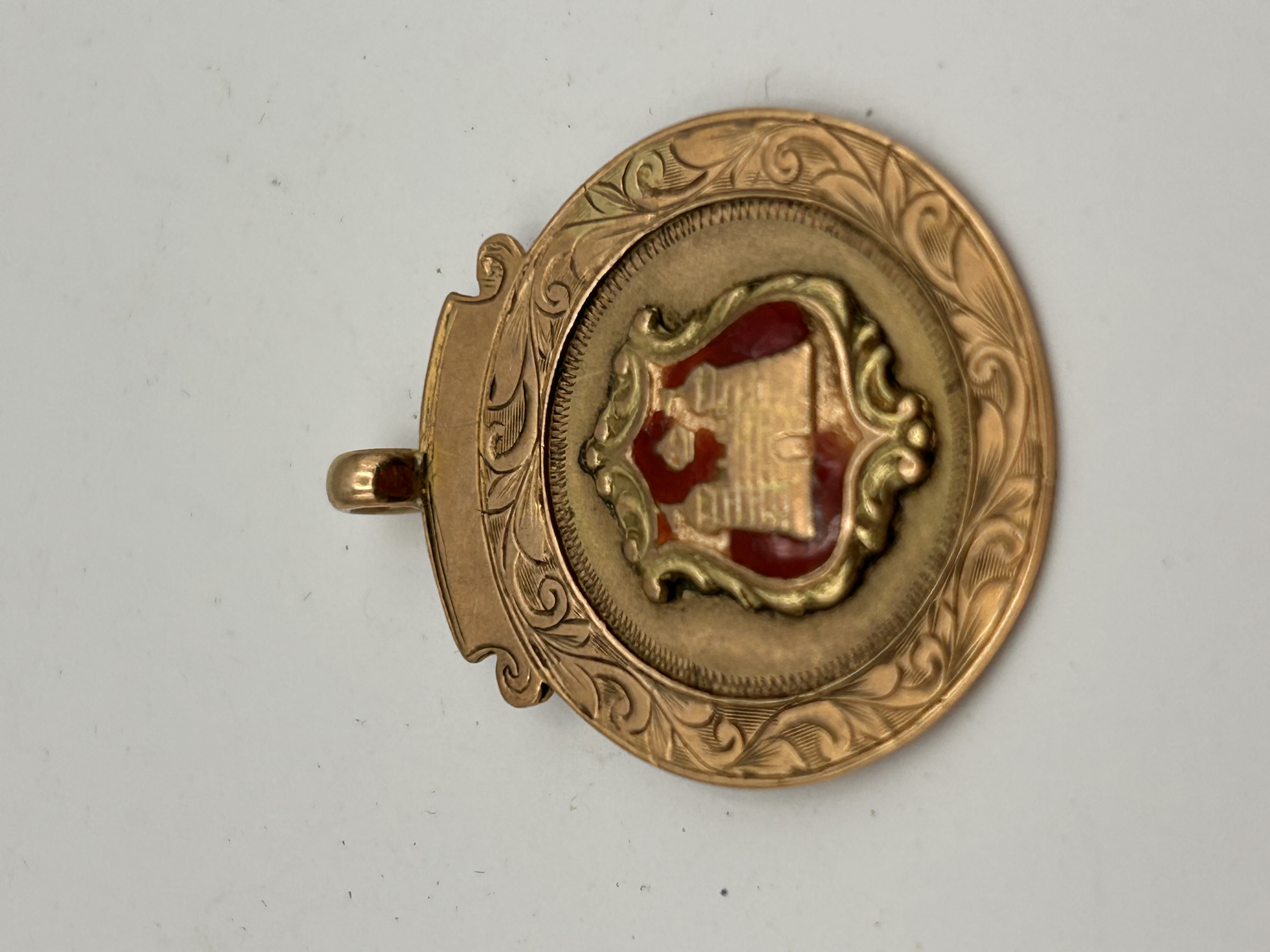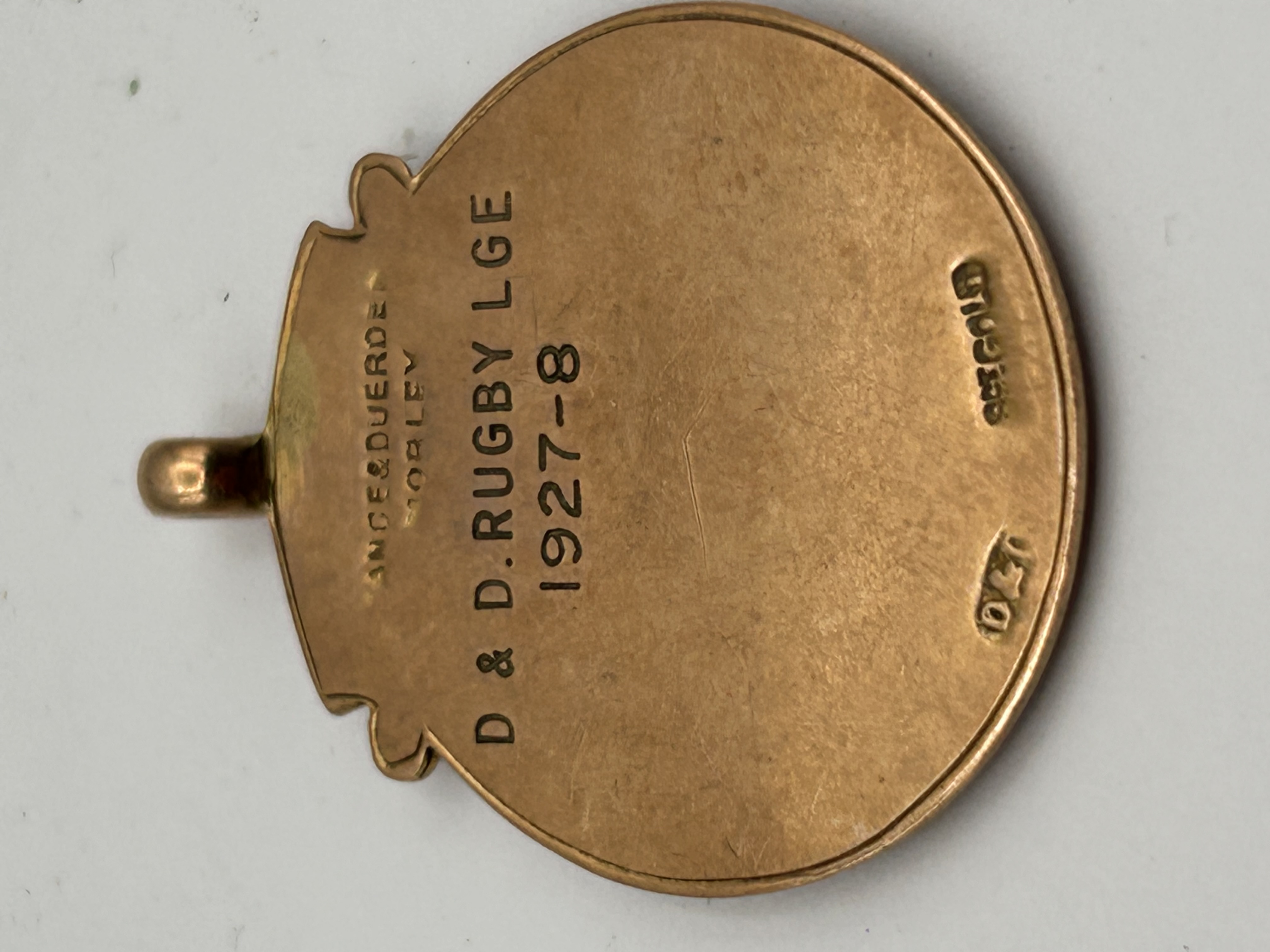 A single circular sports award medal or fob pendant, confirmed to be 9-carat gold based on the visible stamp. The object is representative of early 20th-century sporting awards, explicitly dated to the 1927-1928 season. The obverse features an outer ring deeply engraved with scrolling ornamentation, framing a central applied escutcheon bearing a relief image of a castle and a crescent moon, set against a red enameled background. The reverse is engraved with the maker and retailer details, ANGE & DUERDEN / MORLEY, and the award inscription: D & D. RUGBY LGE / 1927-8. Additional marks near the bottom edge include the material content 9ct GOLD and a partial maker’s mark D & T.