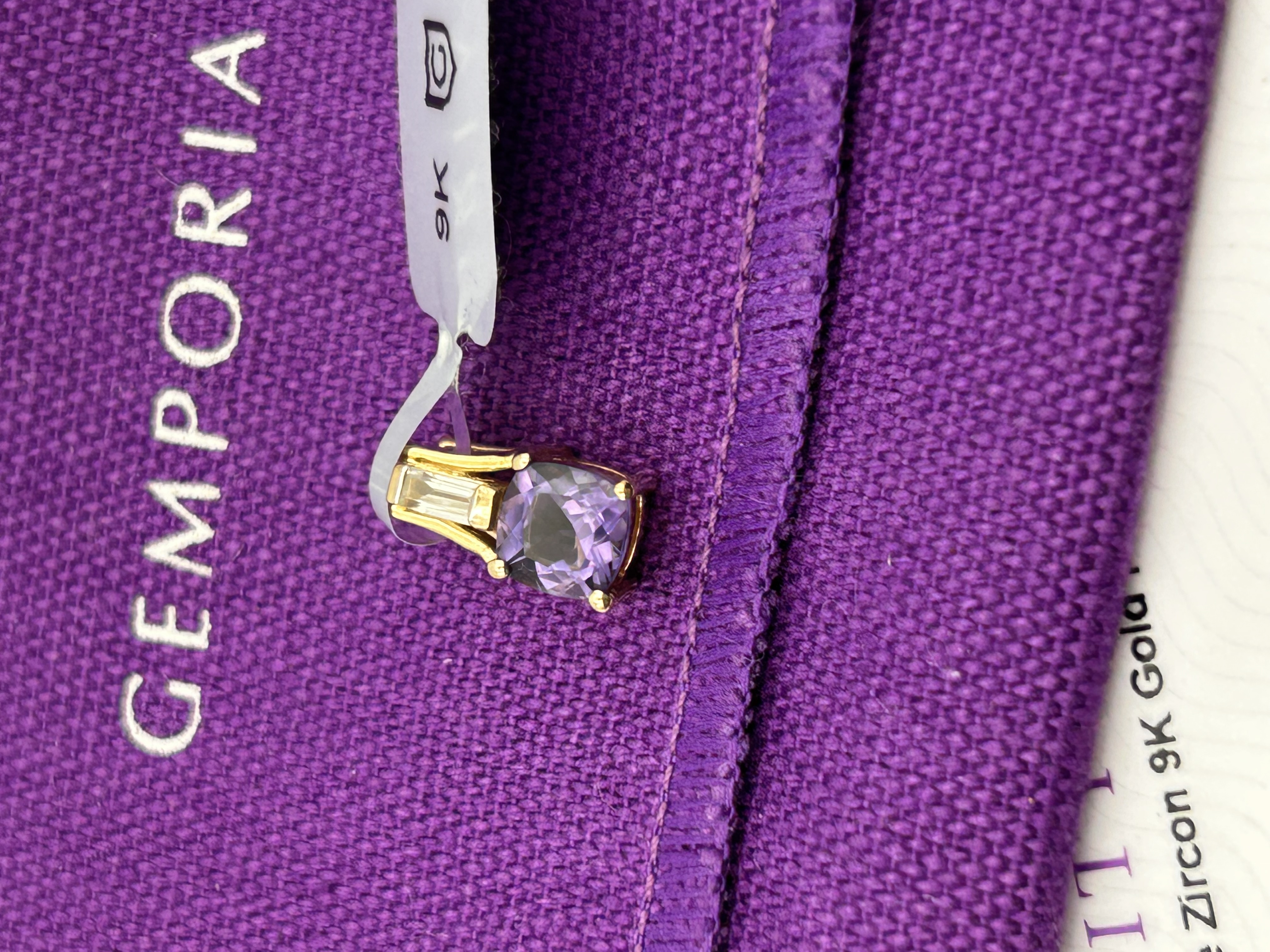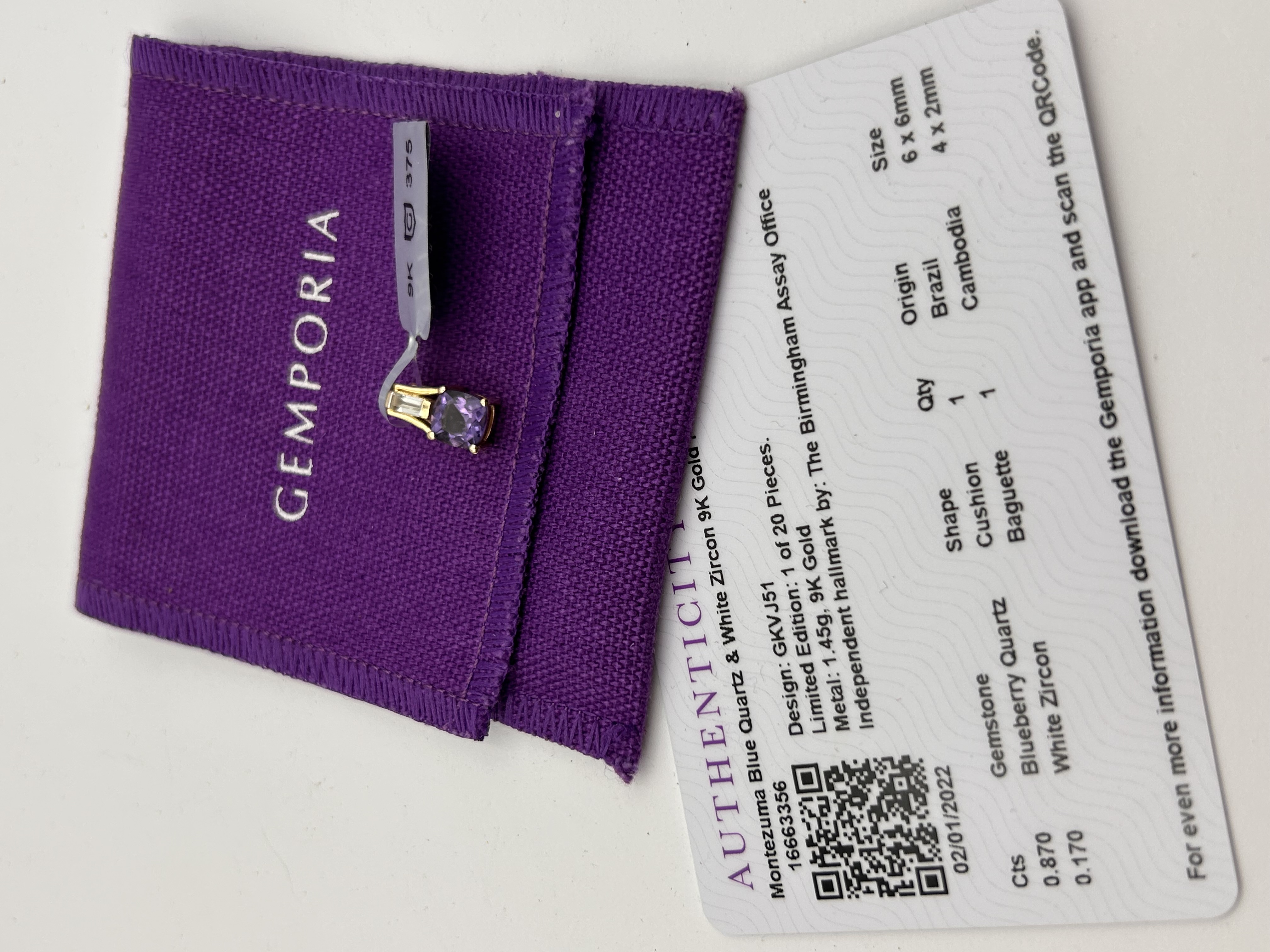 A limited edition pendant manufactured by Gemporia, identified by Design GKVJ51. The pendant is constructed of 9K gold, weighing 1.45 grams, and features two set stones. The primary stone is a cushion-cut Montezuma Blueberry Quartz, documented as 0.870 carats, sourced from Brazil. The secondary stone is a baguette-cut White Zircon, documented as 0.170 carats, sourced from Cambodia. The piece is confirmed as Limited Edition 1 of 20 and bears an independent hallmark by The Birmingham Assay Office. The lot includes the pendant, the original purple textile drawstring pouch marked GEMPORIA, the white plastic identification tag marked 9K G 375, and the corresponding authenticity card dated 02/01/2022.