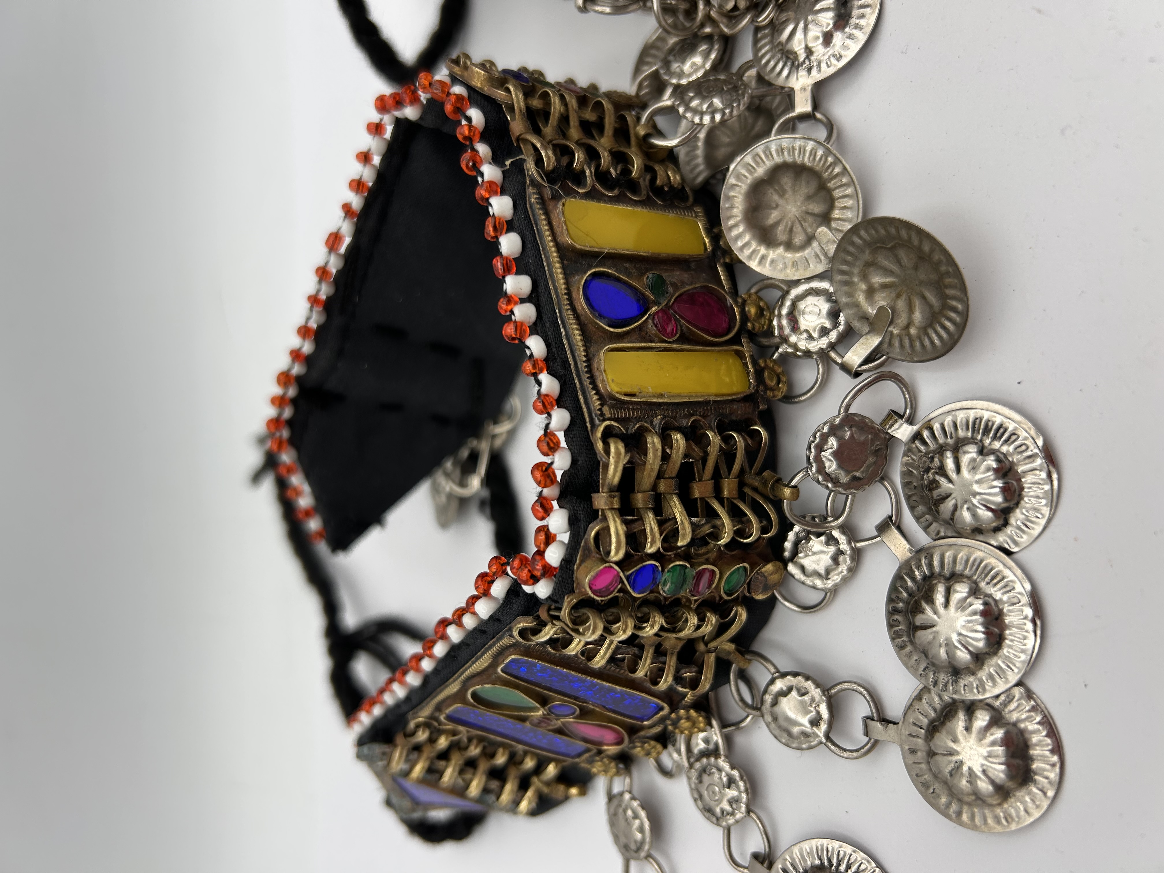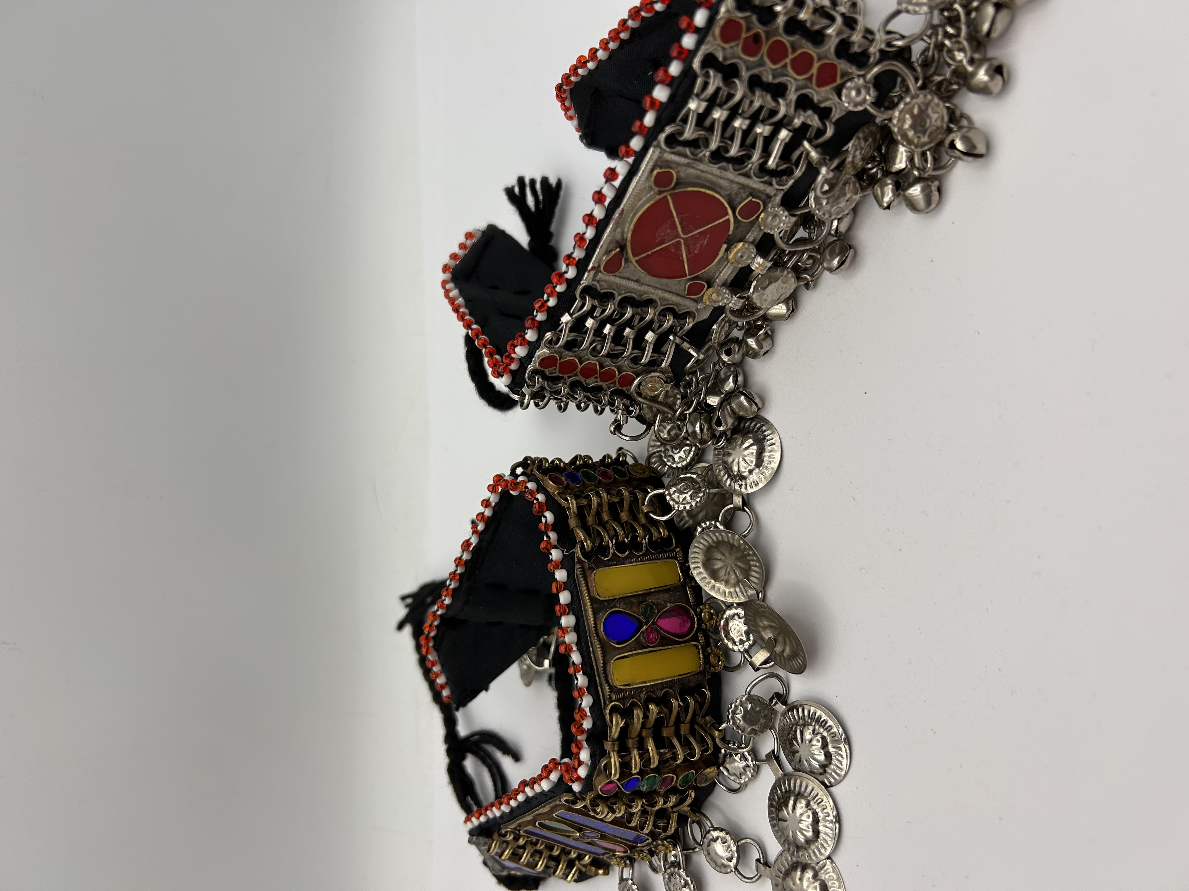 A pair of tribal style neckware pieces attributed to the Afghan Kuchi tradition. Each cuff is constructed on a dark textile backing and features braided tie closures. Both pieces are edged along the top and bottom with stitched rows of small white and red seed beads. The first cuff features gold-toned mixed metals set with rectangular and oval panels of colored glass or enamel in yellow, blue, purple, and green hues. It suspends dangles composed of silver-toned chains terminating in repoussé coin-like discs. The second cuff features silver-toned mixed metals utilizing a chain-link lattice design and accented with red enamel details, including a central round motif depicting a stylized cross or quadrant. This cuff suspends dangles consisting of clusters of small, dome-shaped jingle bells. No discernible text or maker’s marks are visible.