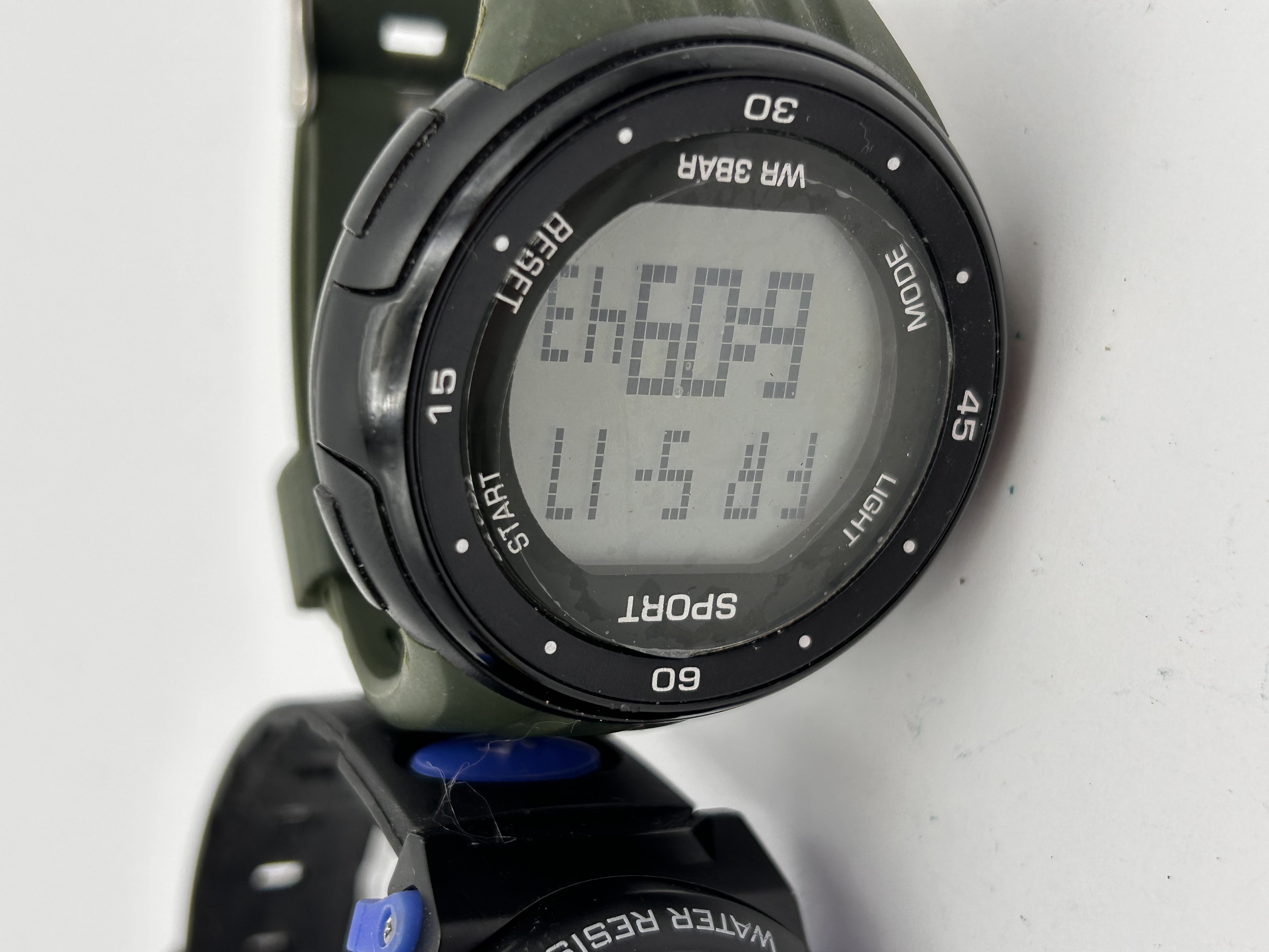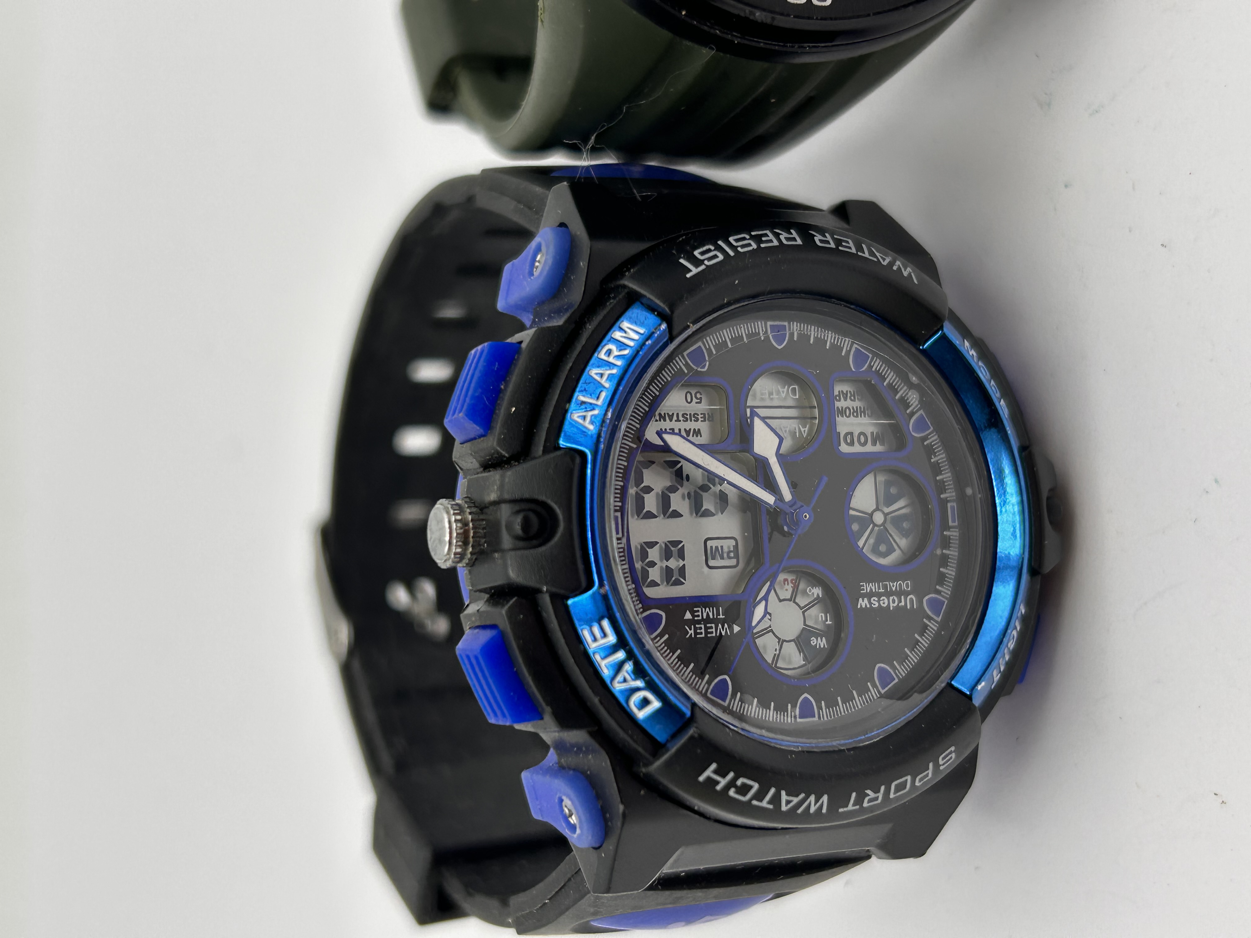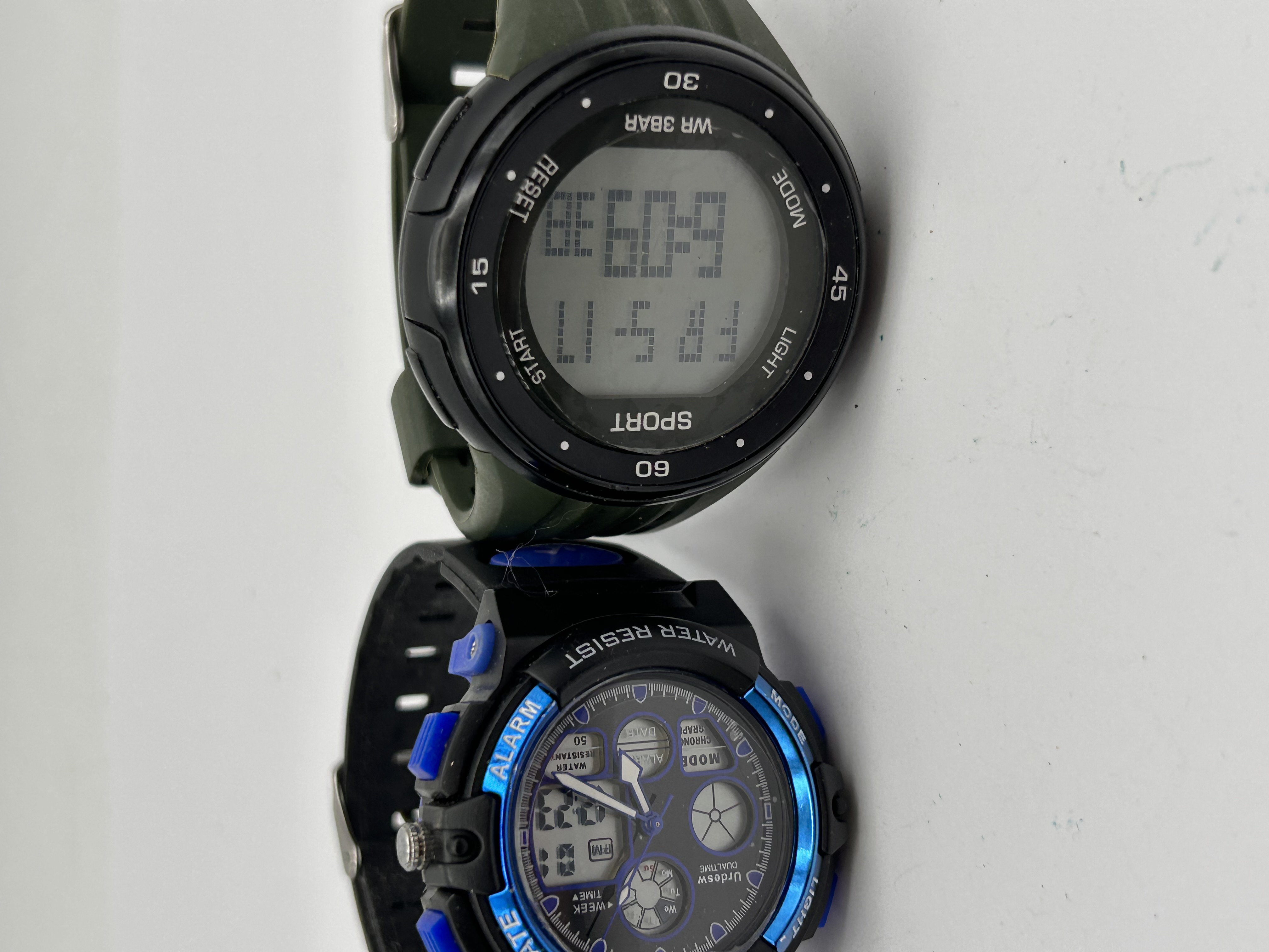 A pair of contemporary utility wristwatches, both constructed primarily from plastic or resin materials, consistent with modern sport and outdoor models. The first watch is an analog-digital combination model featuring a black case with blue accents and a black resin strap. The bezel is inscribed with function labels including DATE, ALARM, and WATER RESIST 50M. The face is marked Jrdesw QUARTZ. The second watch is a fully digital model set in a black case with an olive green resin strap. Its bezel is marked with index points (15, 30, 45, 60) and function labels including SPORT, START, LIGHT, and MODE. The face indicates WR 3BAR water resistance. These watches are consistent with common entry-level digital and sport watches widely available through online retailers.