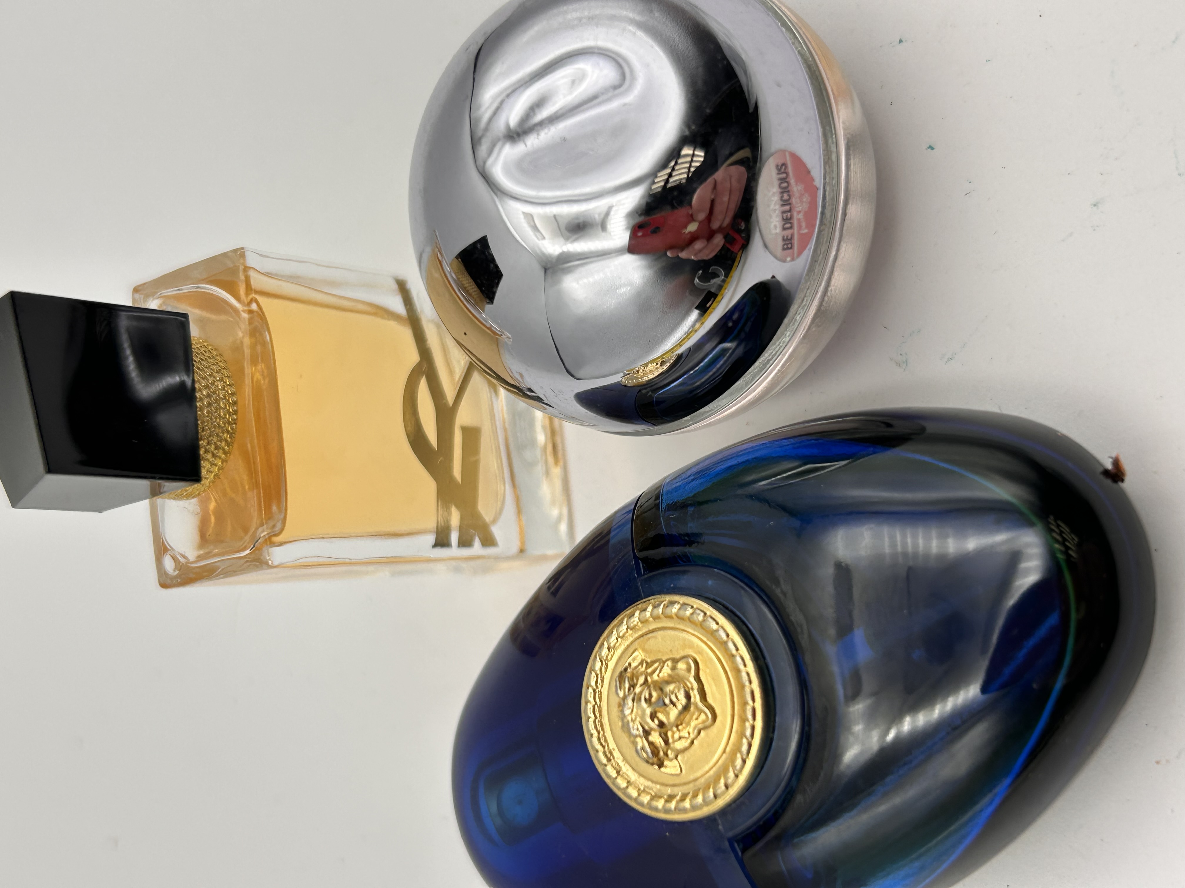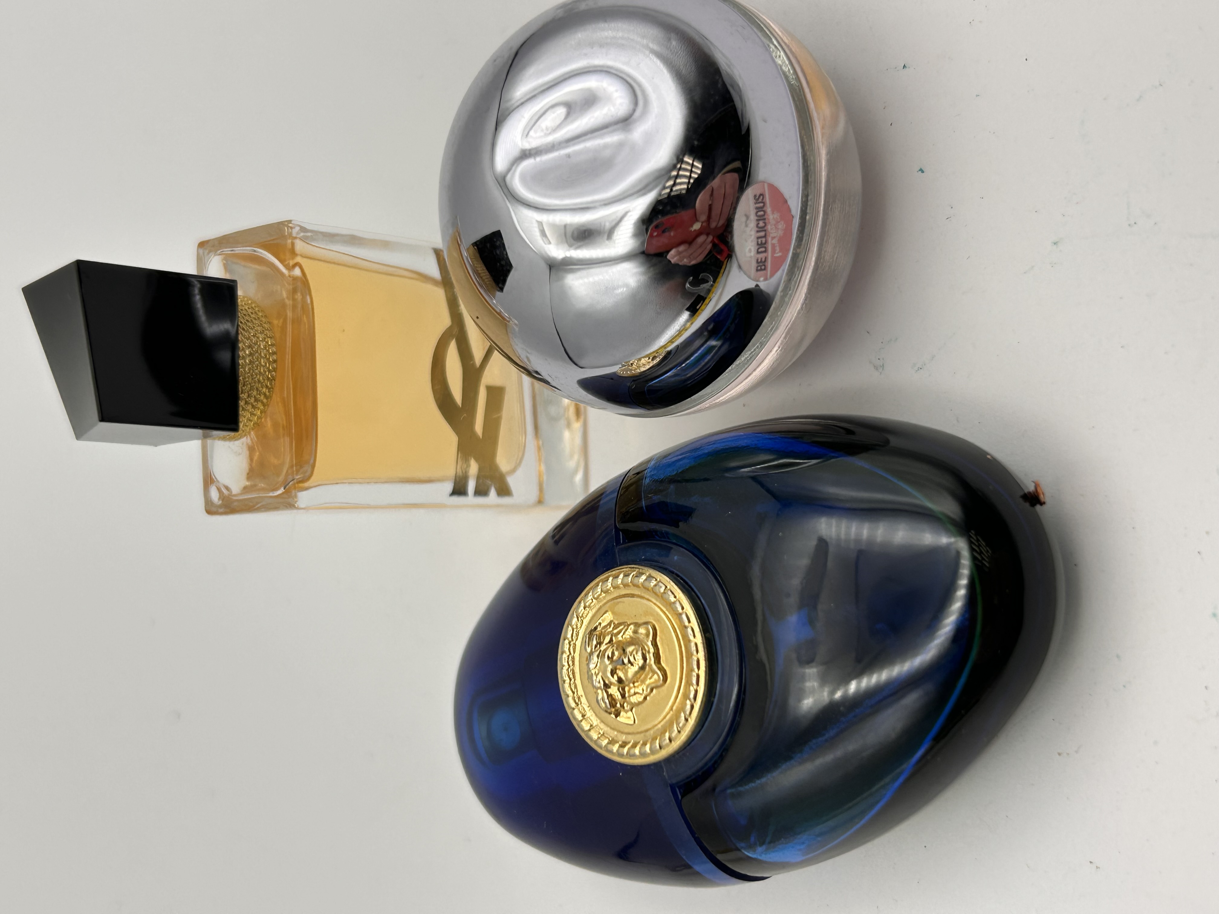 A collection of three designer fragrance bottles. The primary identified item, supported by web consensus, is a Versace Dylan Blue Pour Femme Eau De Parfum spray, presented in a deep blue ovoid glass flacon featuring a central gold-tone Medusa head emblem. The collection also includes a rectangular clear glass flacon containing amber liquid, marked with a gold-tone ‘Y’ logo and a black stopper, consistent with Yves Saint Laurent branding. The third item is a spherical or apple-shaped bottle with a clear pink base and a silver-toned chrome cap, bearing a sticker reading “BE DELICIOUS,” consistent with DKNY branding. All bottles are partially full and feature spray applicators.