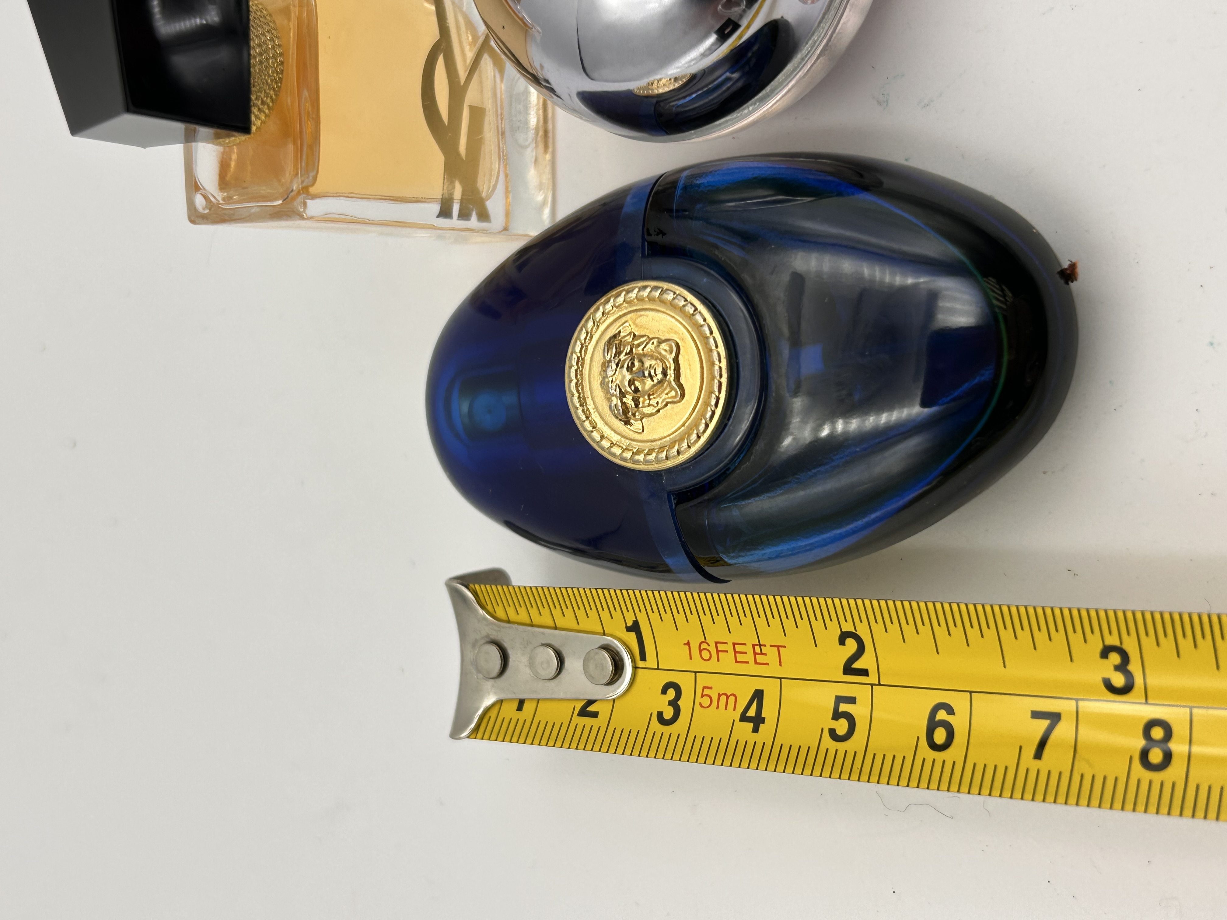 The Versace bottle measures approximately 3.5 inches (9 cm) in length.