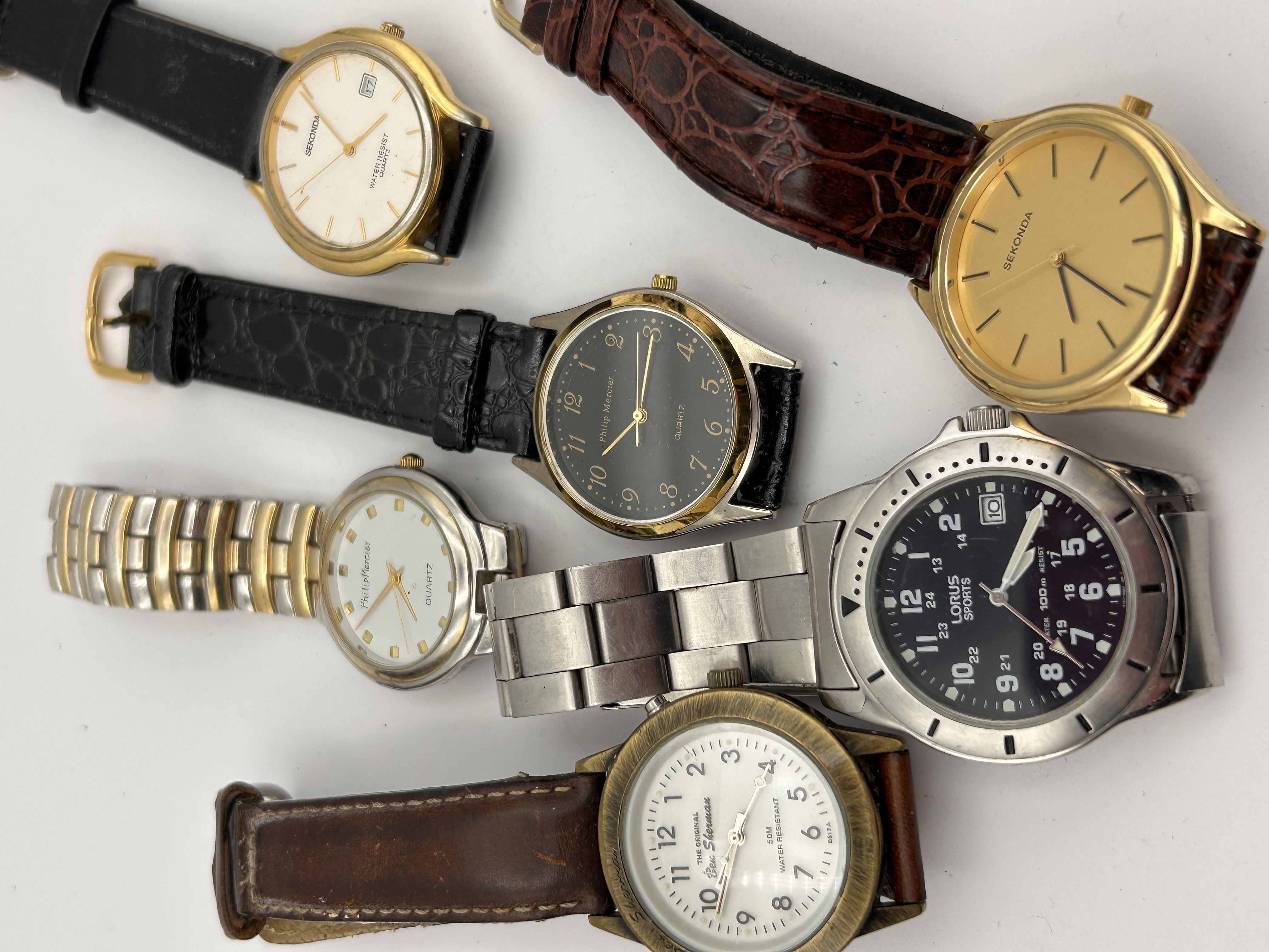 A collection of six pre-owned quartz wristwatches presented as a single lot. The collection includes examples from various entry-level and fashion brands, including two watches marked Sekonda, two marked Philip Mercier, one Lorus Sports model, and one marked The Original Tim Sherman. The watches feature mixed case materials, including stainless steel and gold or brass-toned base metal, with various dial colors (white, black, and gold). Straps and bracelets include stainless steel link bracelets, brown leather straps, black synthetic straps, and a burgundy faux-crocodile strap. The Lorus Sports model features a stainless steel case, link bracelet, and a rotating bezel. All dials are marked QUARTZ.