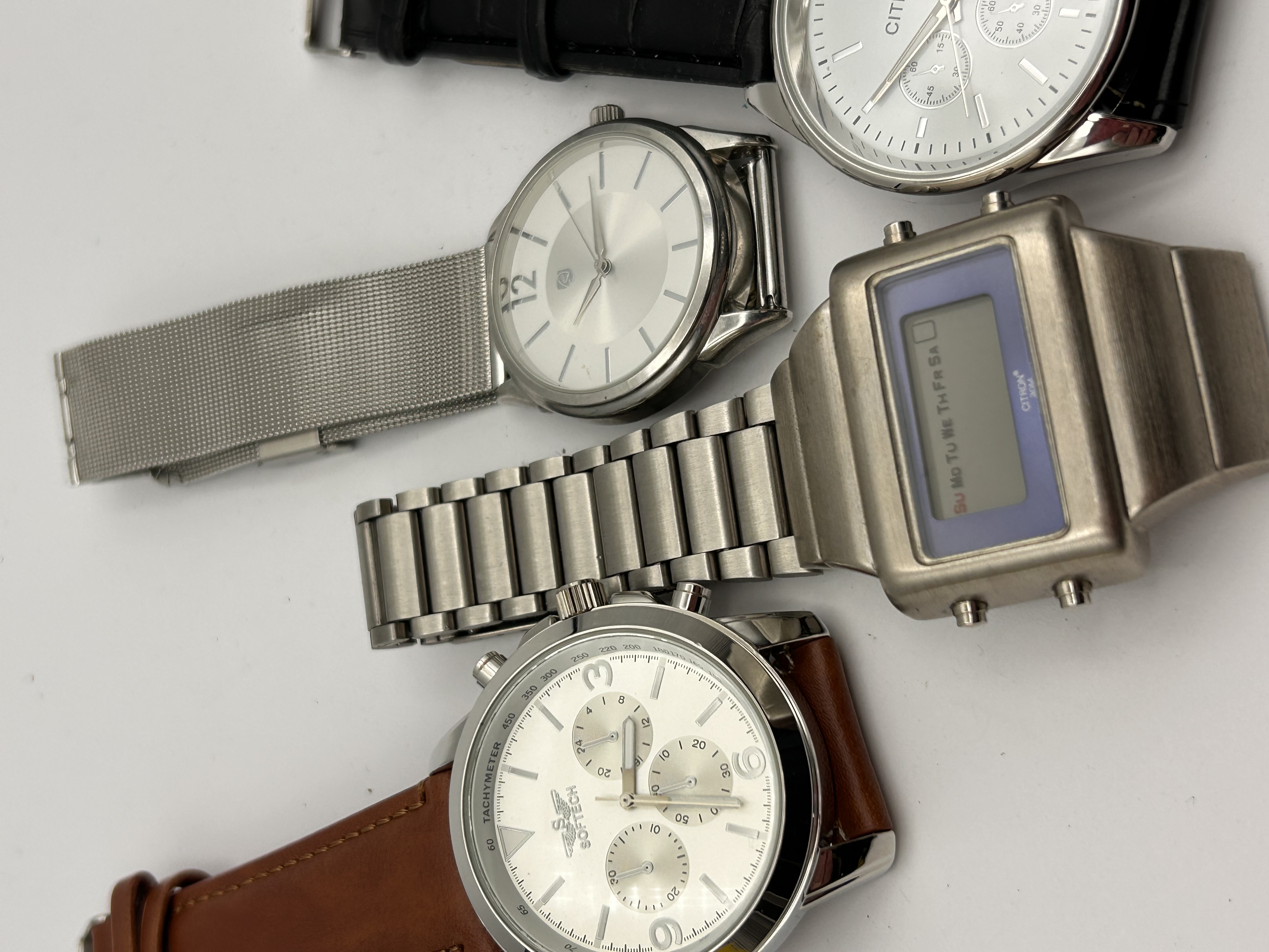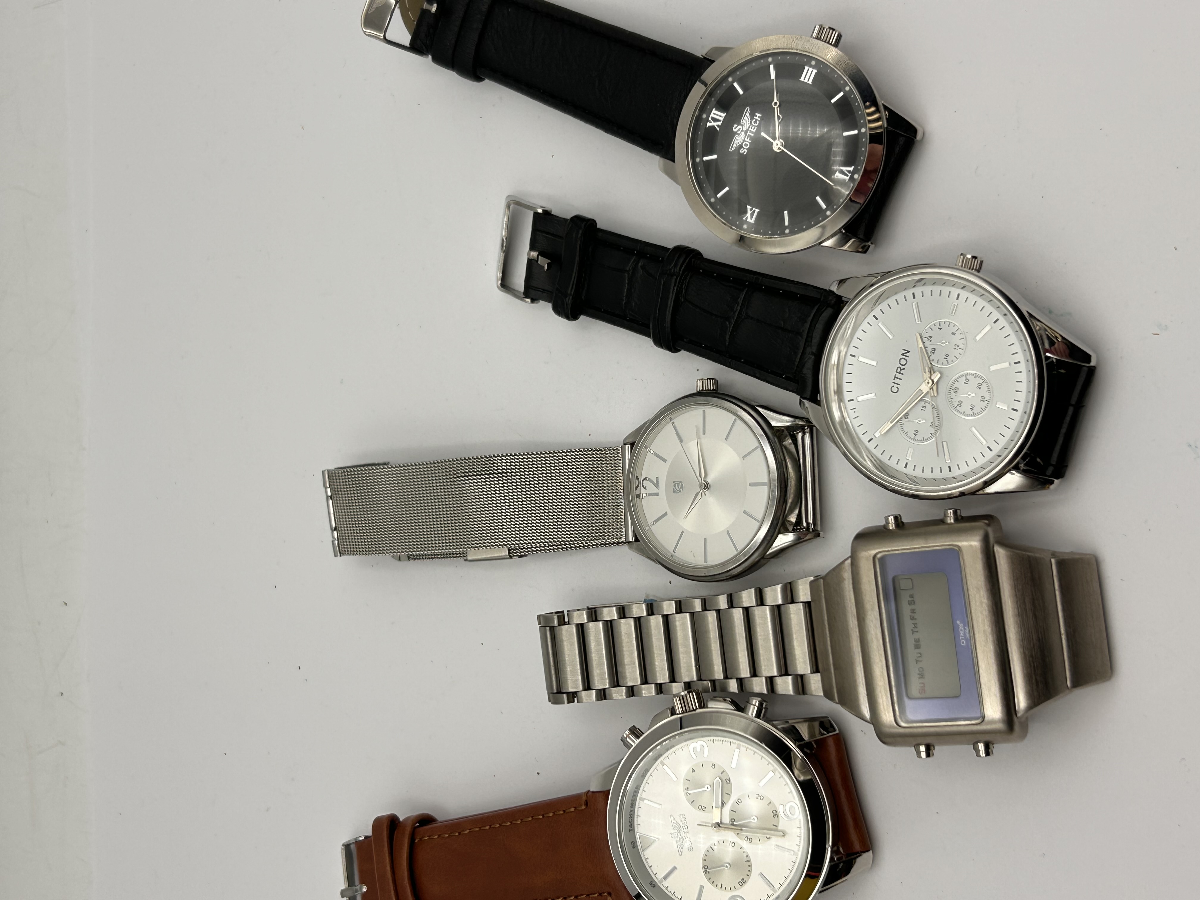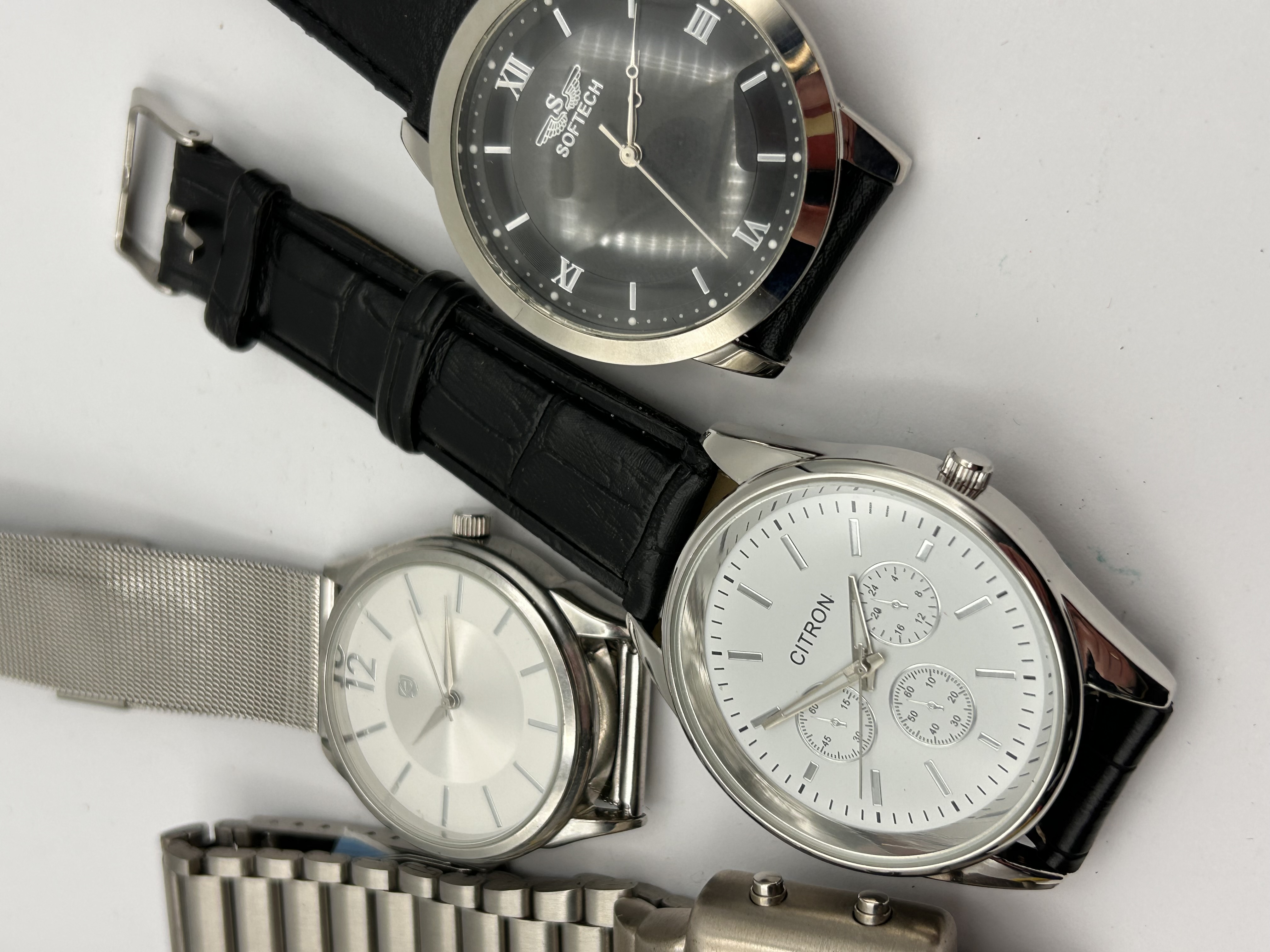 A collection of five contemporary wristwatches, primarily featuring quartz movements and silver-tone metal cases. The lot includes two watches marked SOFTECH, consisting of a white-dial chronograph on a brown leather strap and a black-dial analog model utilizing Roman numerals on a black leather strap. Also present are two watches marked CITRON, including a white-dial chronograph on a black faux-croc strap and a simple three-hand analog model featuring a silver-tone dial and a Milanese mesh bracelet. The collection is completed by one stainless steel-look digital watch marked CITRON SMART, which features a rectangular display showing standard day abbreviations and is attached to a linked metal bracelet.