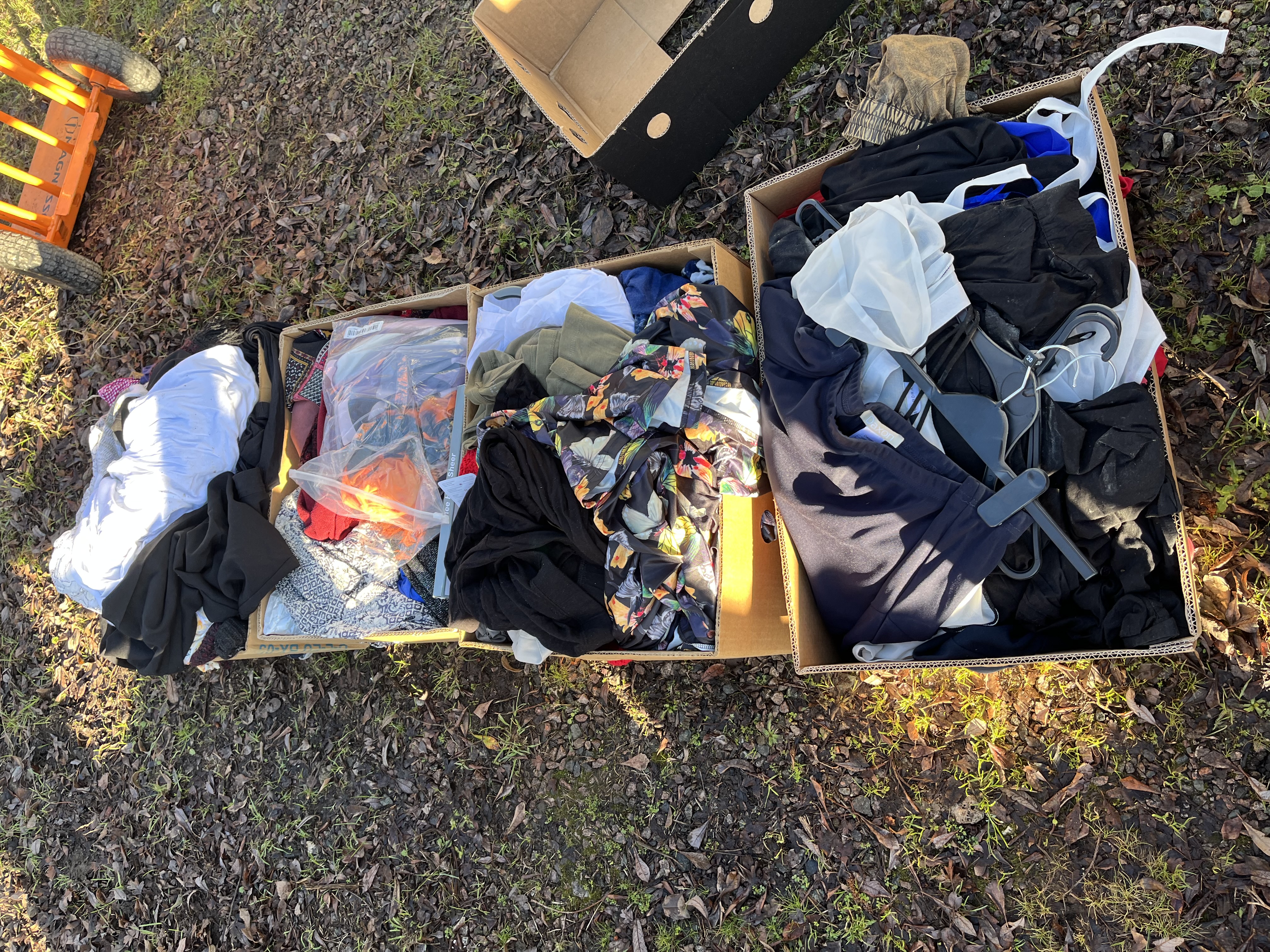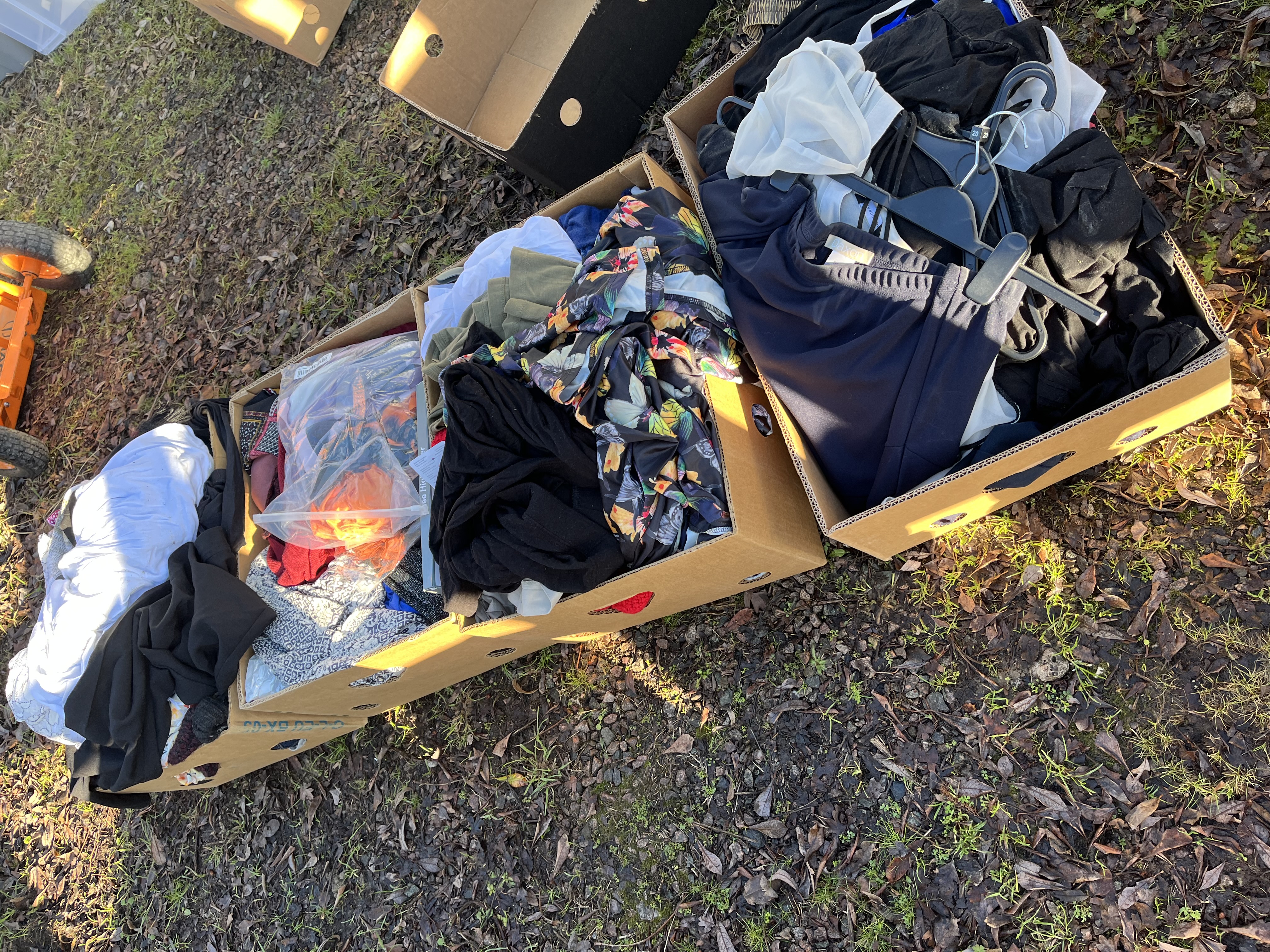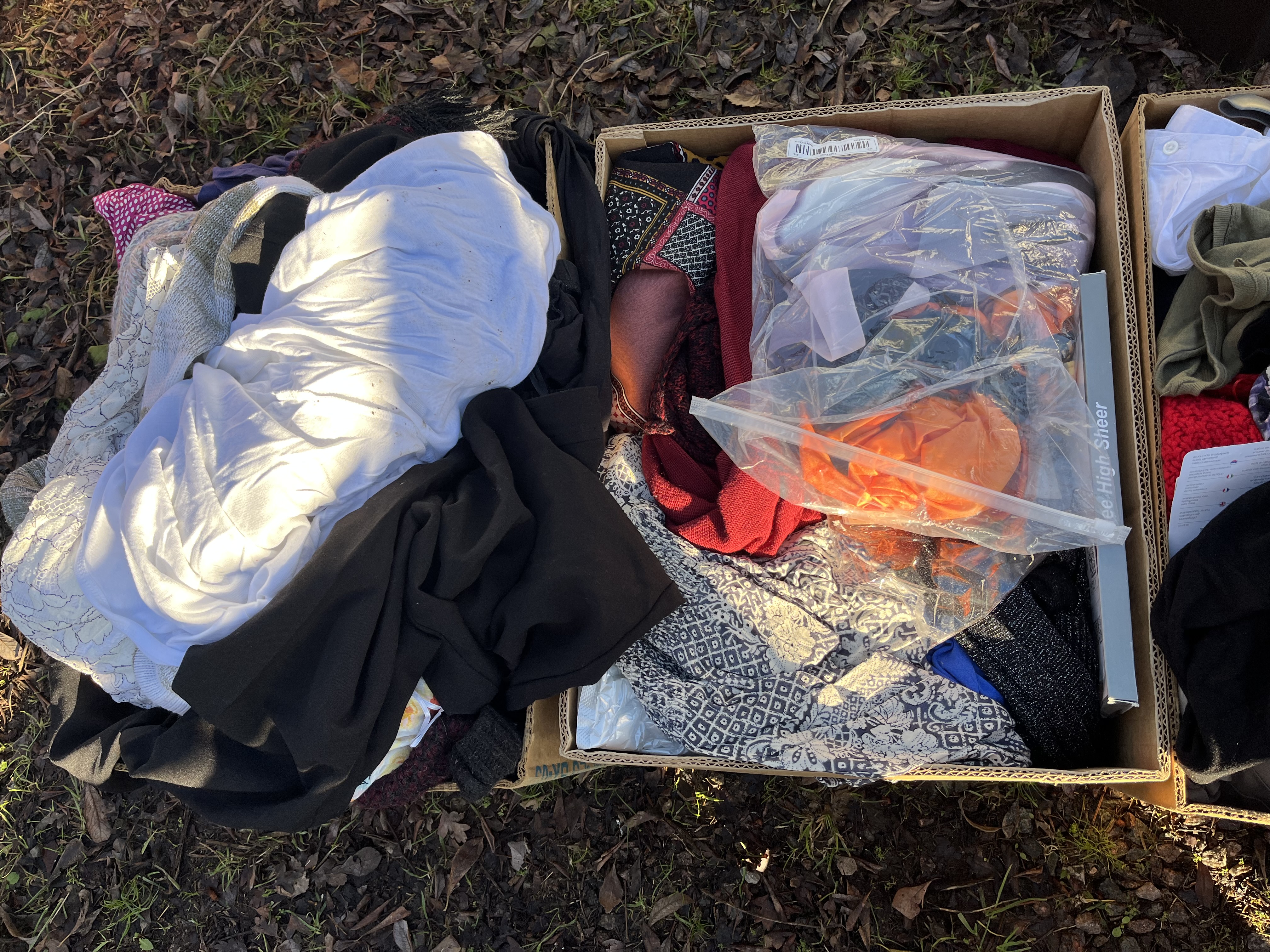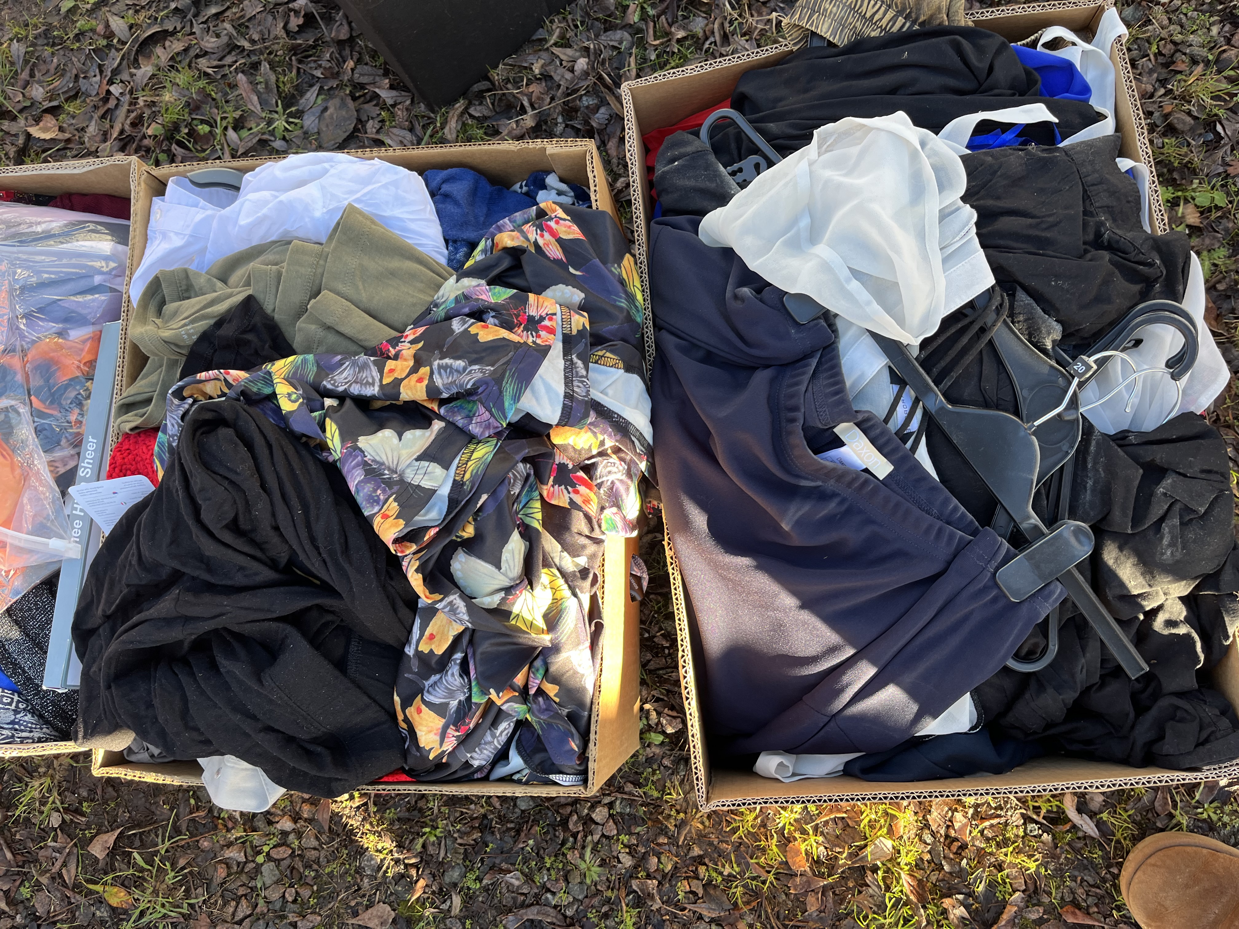 A collection comprising four corrugated cardboard shipping boxes filled with assorted contemporary apparel and textiles. The contents are presented in bulk and include a mix of clothing types, colors, and patterns. Predominant colors visible are black, white, olive, and navy. One box contains a sheer garment featuring a vibrant multicolored floral or butterfly print. Other visible items include knitted textiles, items packaged in clear plastic bags, and a box containing several black plastic hangers, suggesting inventory or retail origins. Visible text fragments on internal packaging suggest the inclusion of hosiery or sheer items, specifically noting “ee High Sheer.” A barcode is visible on a plastic bag within one box.