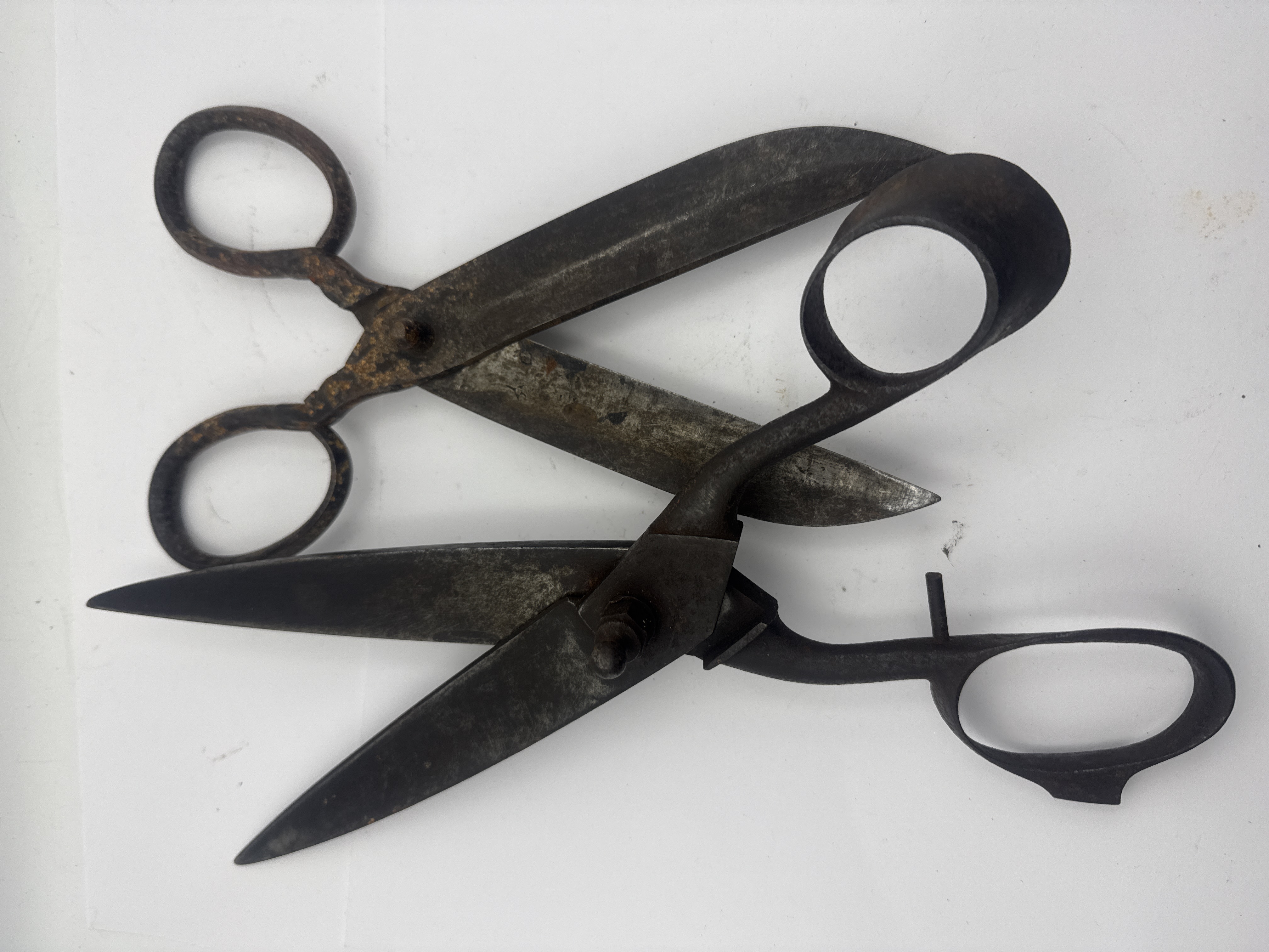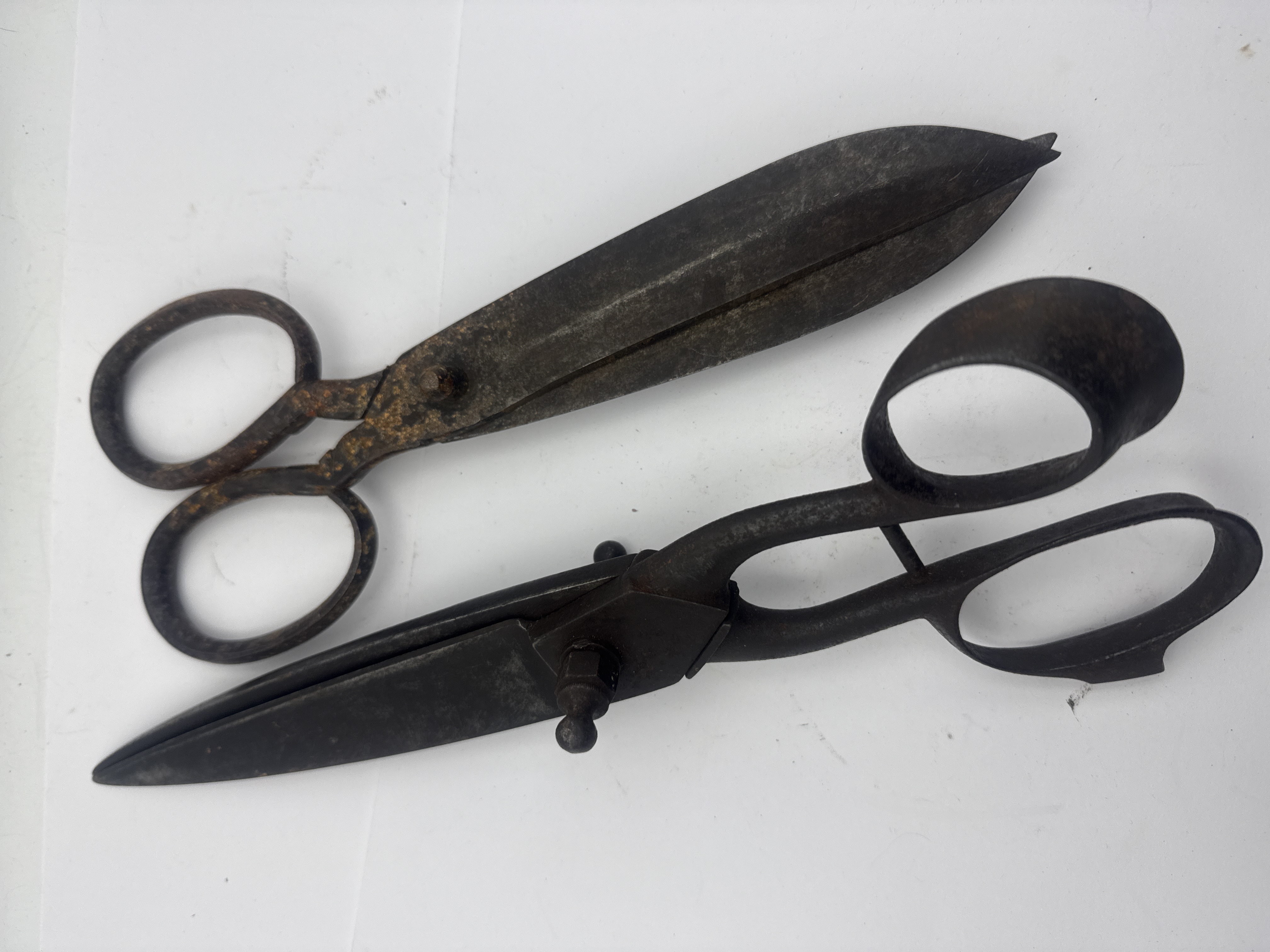 A collection of two individual pairs of heavy-duty antique shears, constructed entirely from ferrous metal (iron or steel). These items are consistent with utility or tailoring shears from the 19th or early 20th century. The first pair features a complex, adjustable pivot mechanism secured by a visible bolt and a knurled knob, along with a distinct metal support or finger rest extending from the lower handle loop. The second pair utilizes a simpler, fixed riveted pivot mechanism. Both pairs exhibit large handle loops designed for heavy-duty use. No legible text, maker’s marks, or stamps are discernible on either item due to extensive surface degradation.