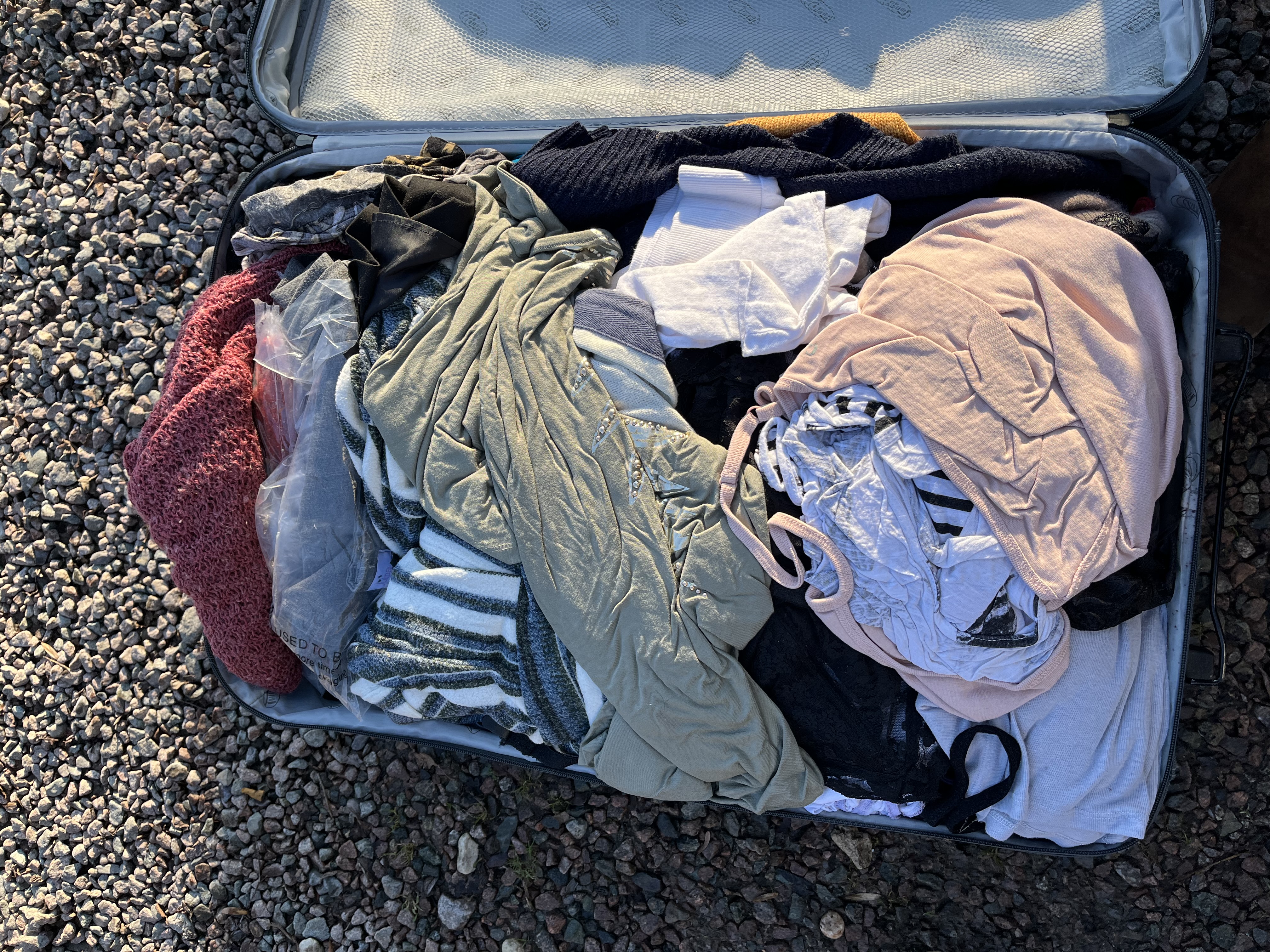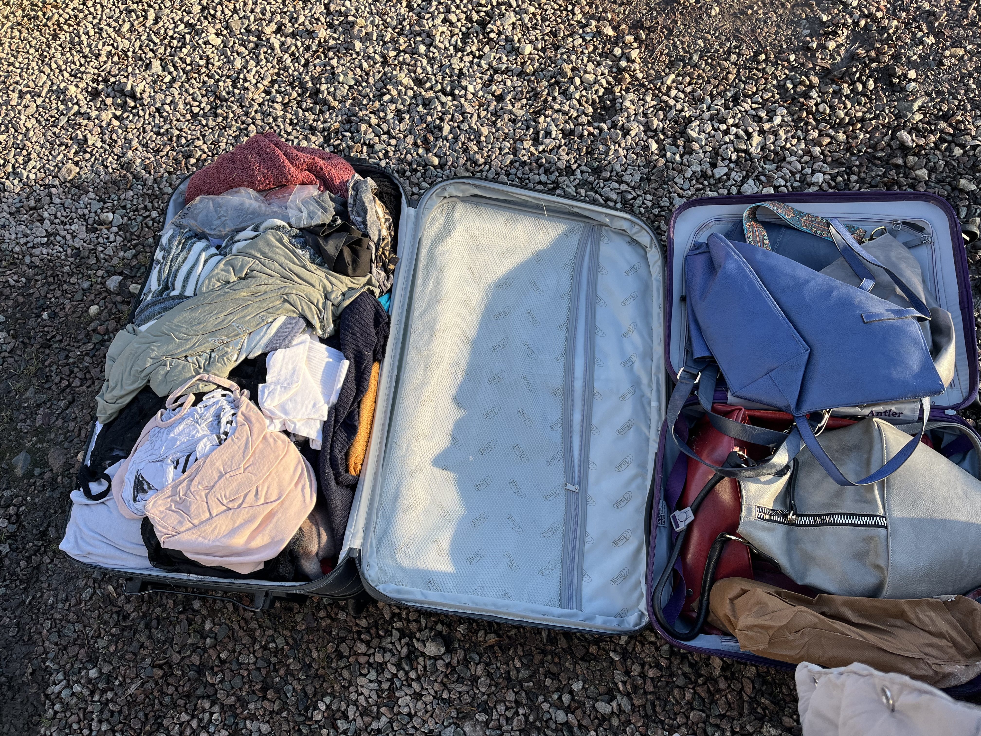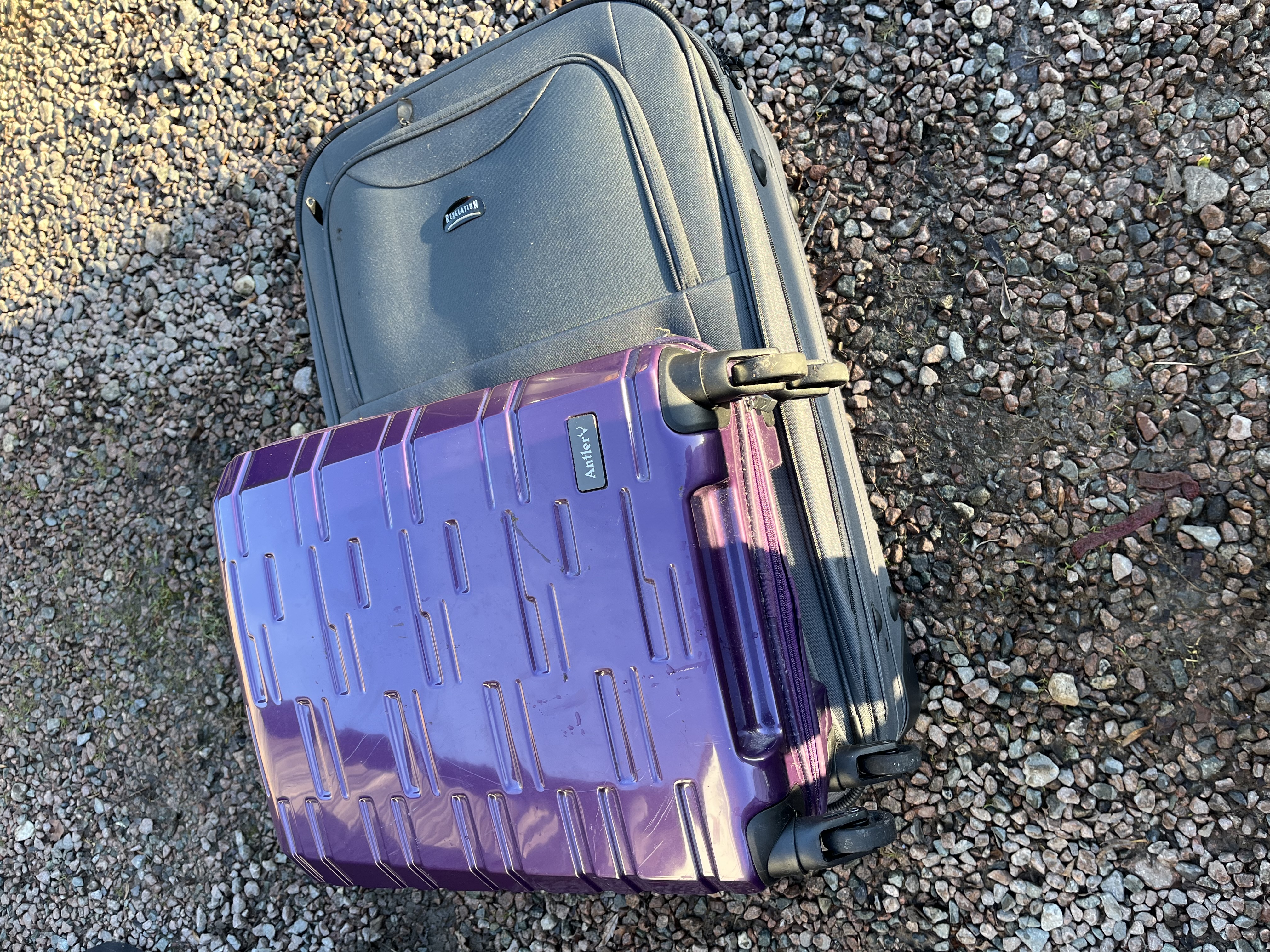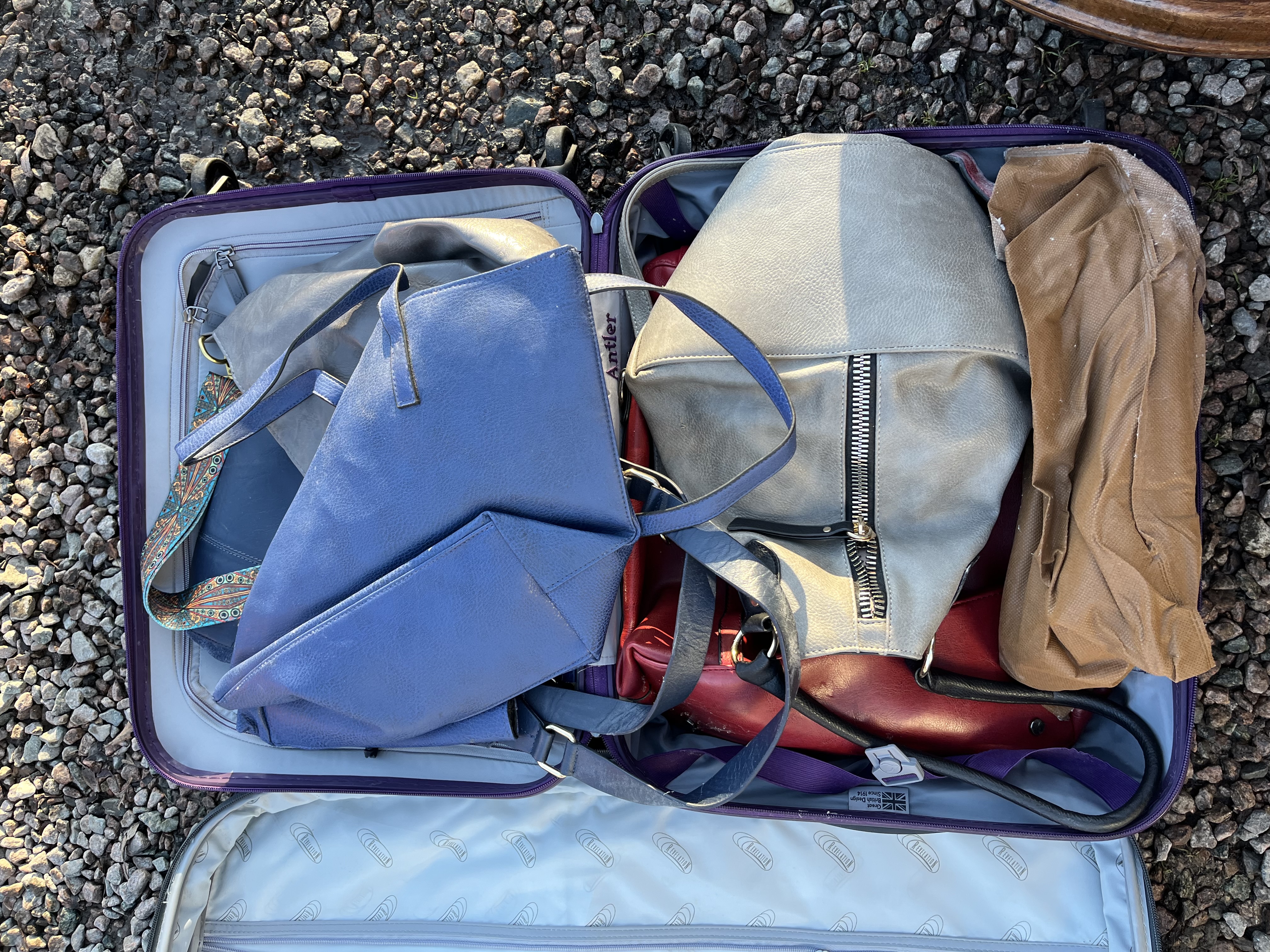 A collection of eight items, including two Antler brand wheeled suitcases and six assorted women’s handbags or purses. The luggage set includes one purple hard-shell suitcase and one dark gray/black soft-sided suitcase. Both suitcases feature wheels, telescoping handles, and appear to be designed for travel. The purple hard-shell suitcase contains six synthetic handbags and purses in various colors including periwinkle blue, light gray, red, and tan. The gray/black soft-sided suitcase is filled with a quantity of mixed textiles and clothing in assorted colors including white, pink, olive, and red. All items are modern.