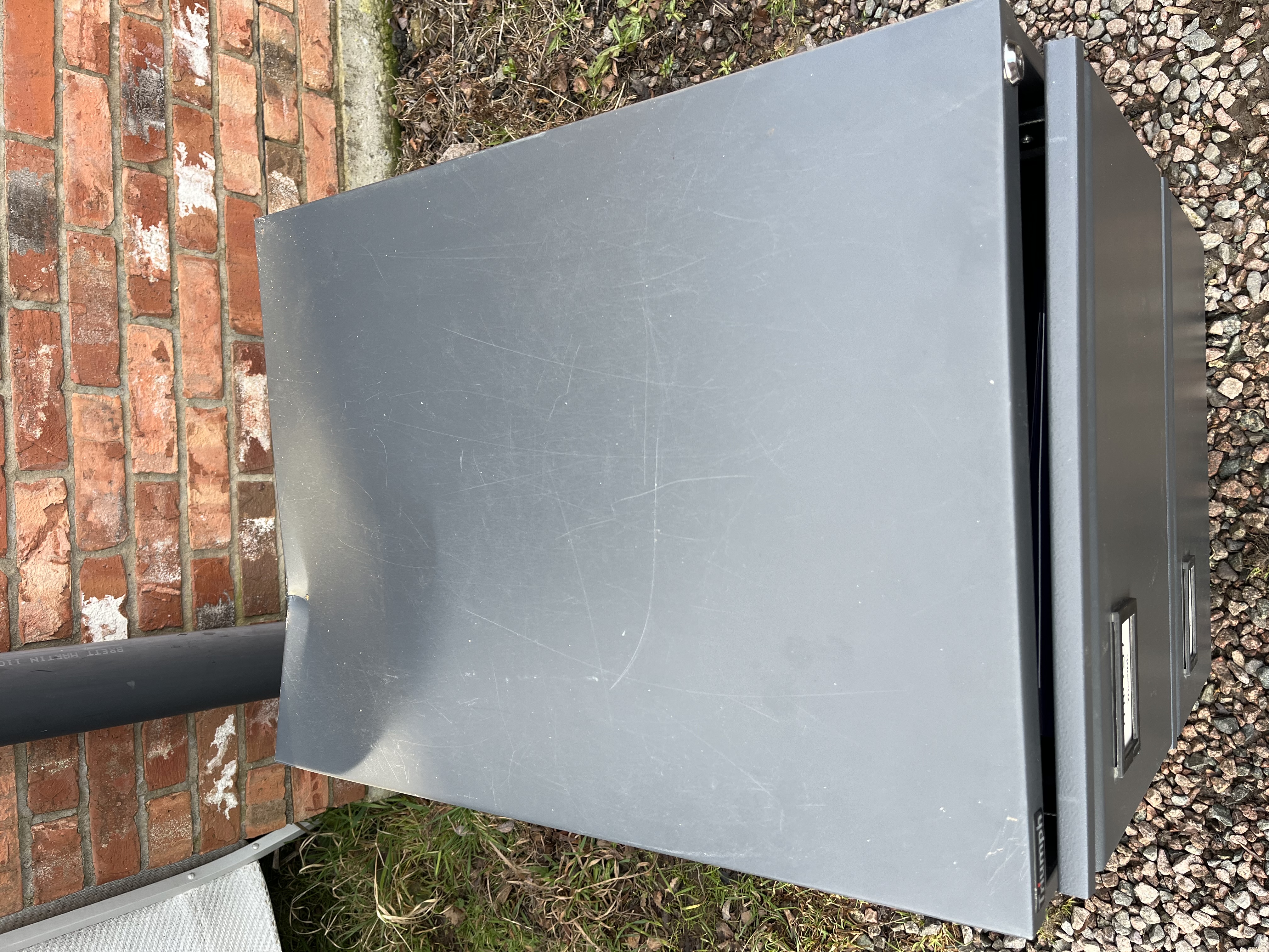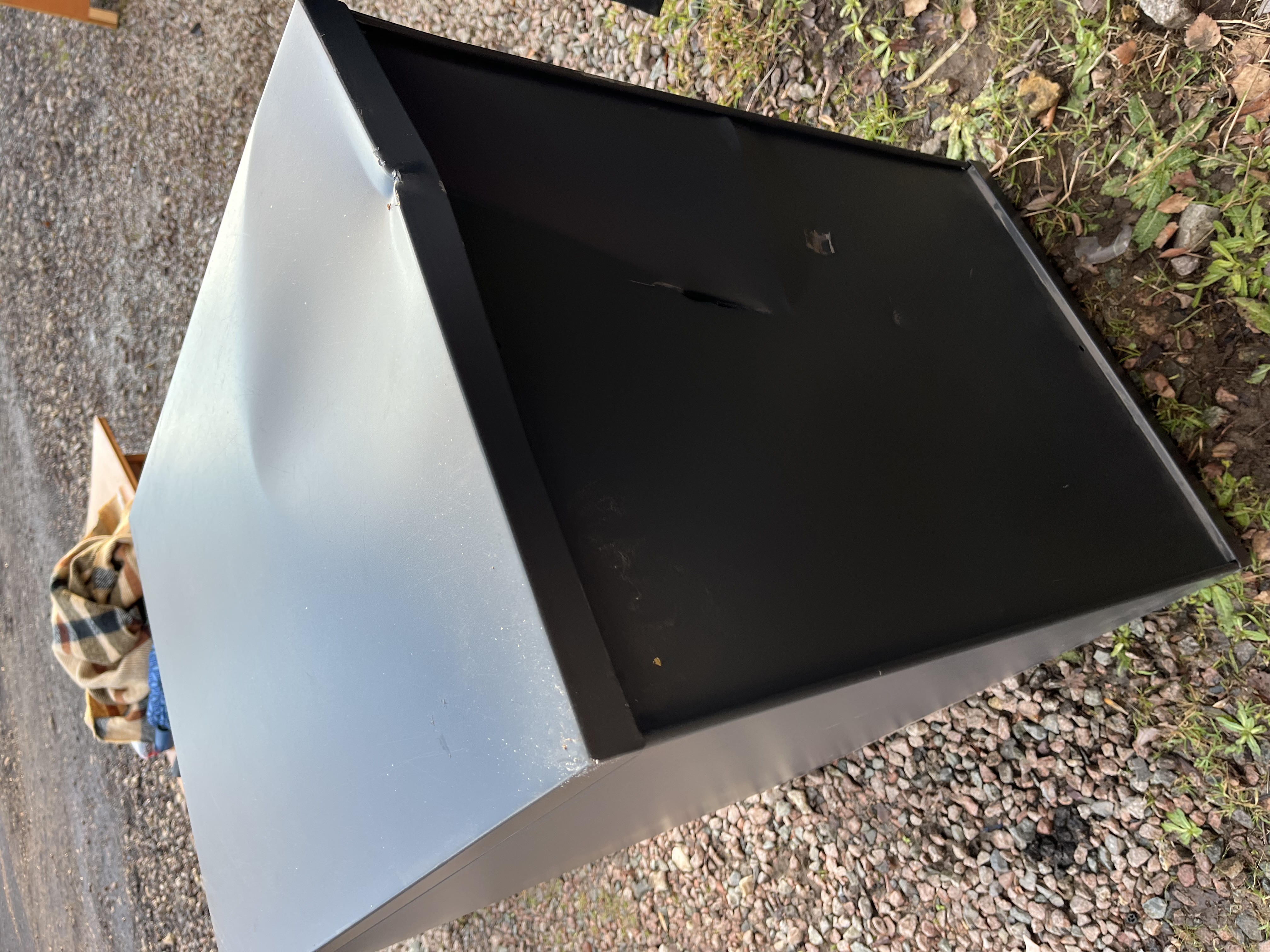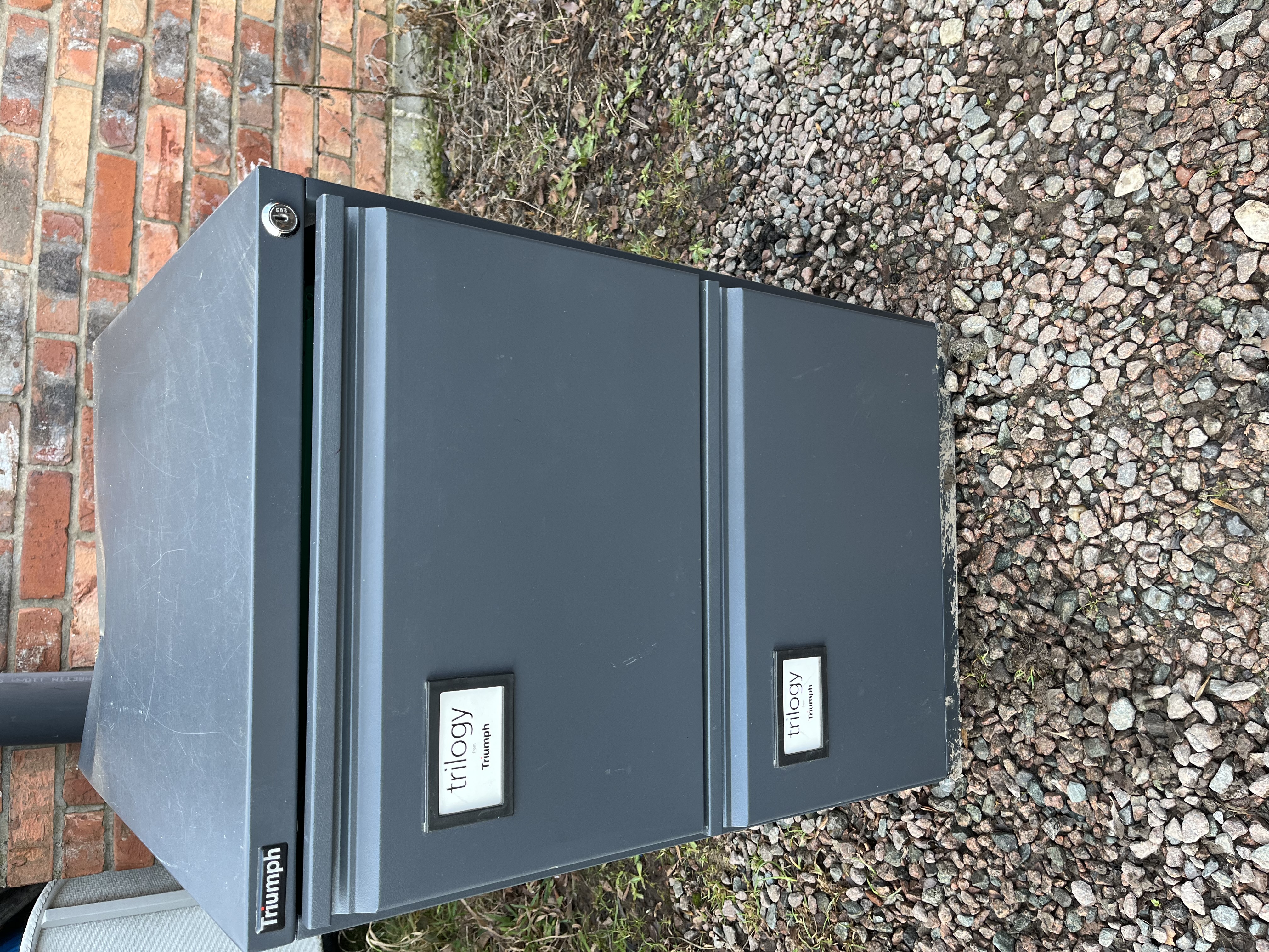 A utilitarian two-drawer vertical filing cabinet manufactured by Triumph, identified as the ‘trilogy’ model. The unit is constructed of dark grey painted steel. It features two vertical drawers, each bearing a recessed label plate marked “trilogy” above “Triumph.” A cylinder lock mechanism is present on the upper right corner of the casing. The item exhibits significant damage, as detailed in the condition report.