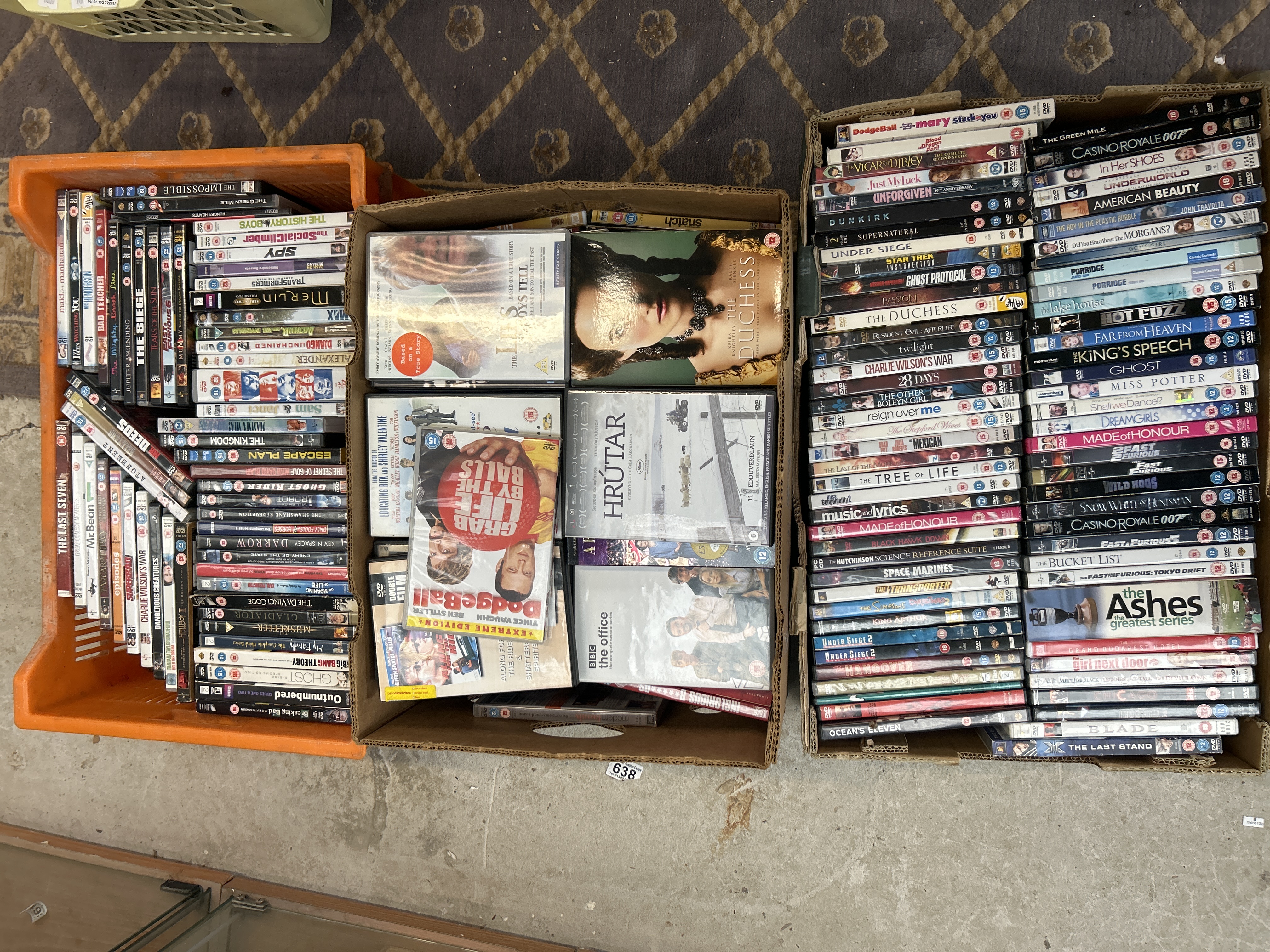 A large collection of commercial optical media items, primarily consisting of films and television series in DVD and Blu-ray formats. The lot is housed across three containers: one orange plastic storage crate and two corrugated cardboard boxes. Titles visible within the collection include The Last Seven, Mr. Bean, The Office, Dodgeball, The Duchess, The King’s Speech, Casino Royale 007, and the Icelandic film Hrútar (“Rams”). The collection is heterogeneous, spanning various genres and release periods. Many cases display visible classification markings, predominantly the British Board of Film Classification (BBFC) ratings, such as 12, 15, and 18. The item Hrútar notes “11 EDDUVERÐLAUN” (11 Edda Awards).