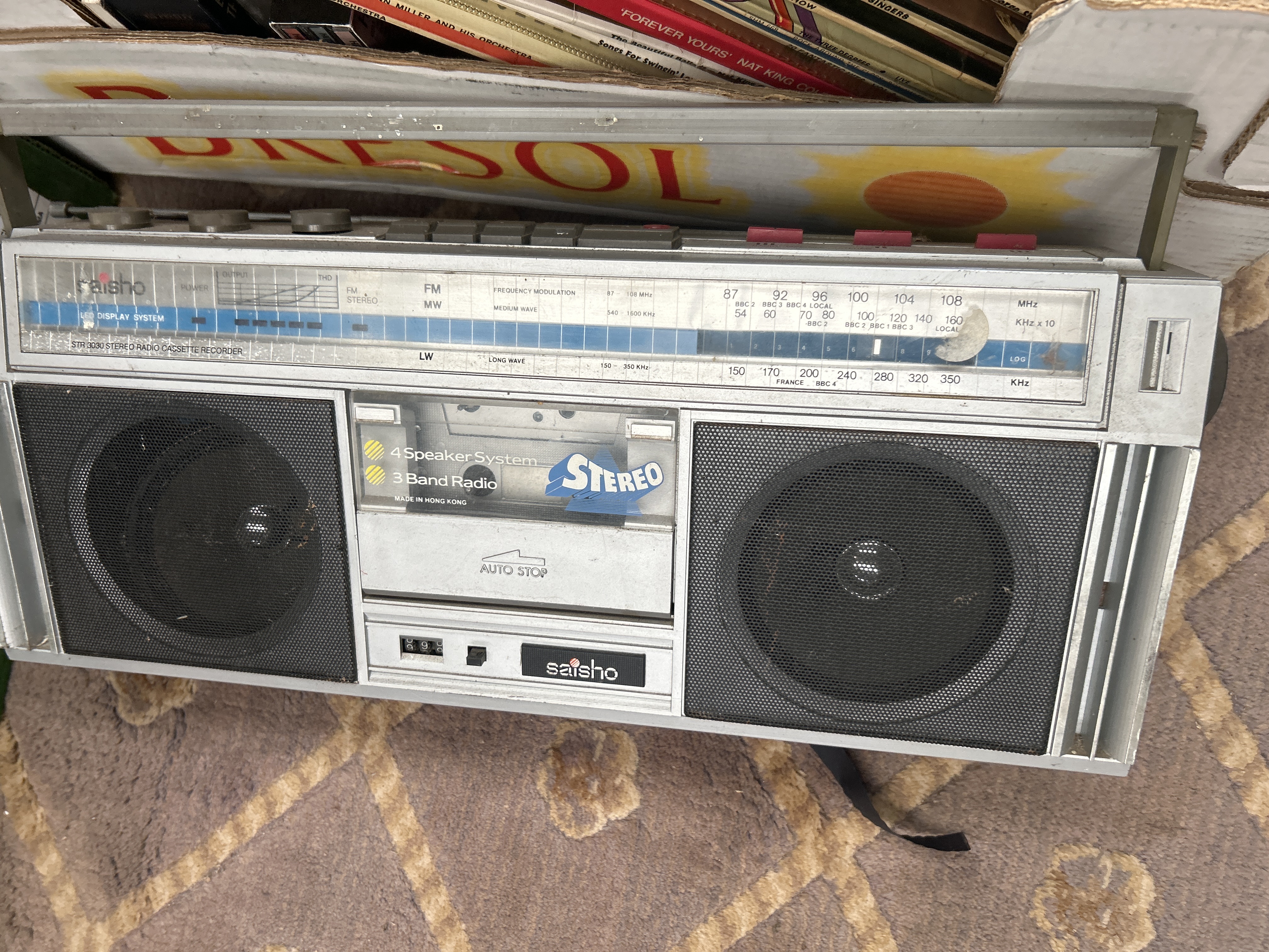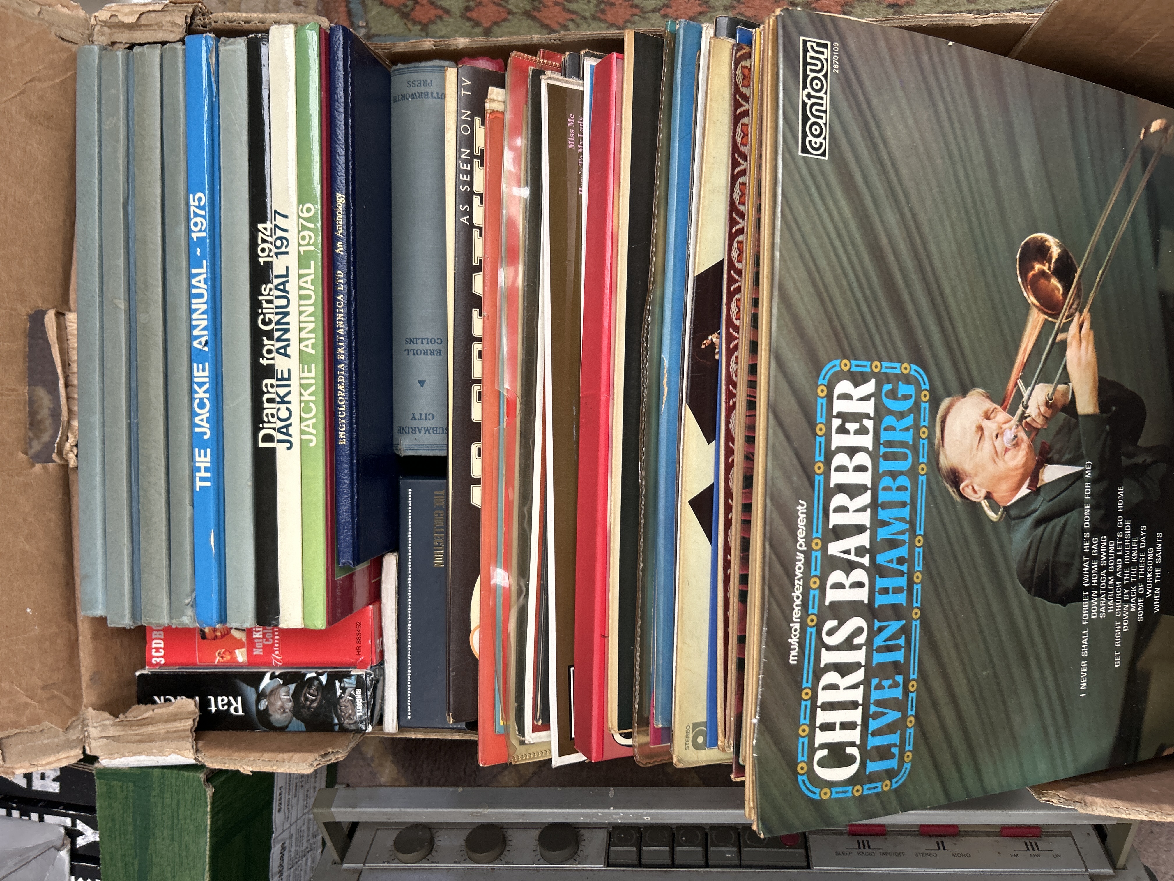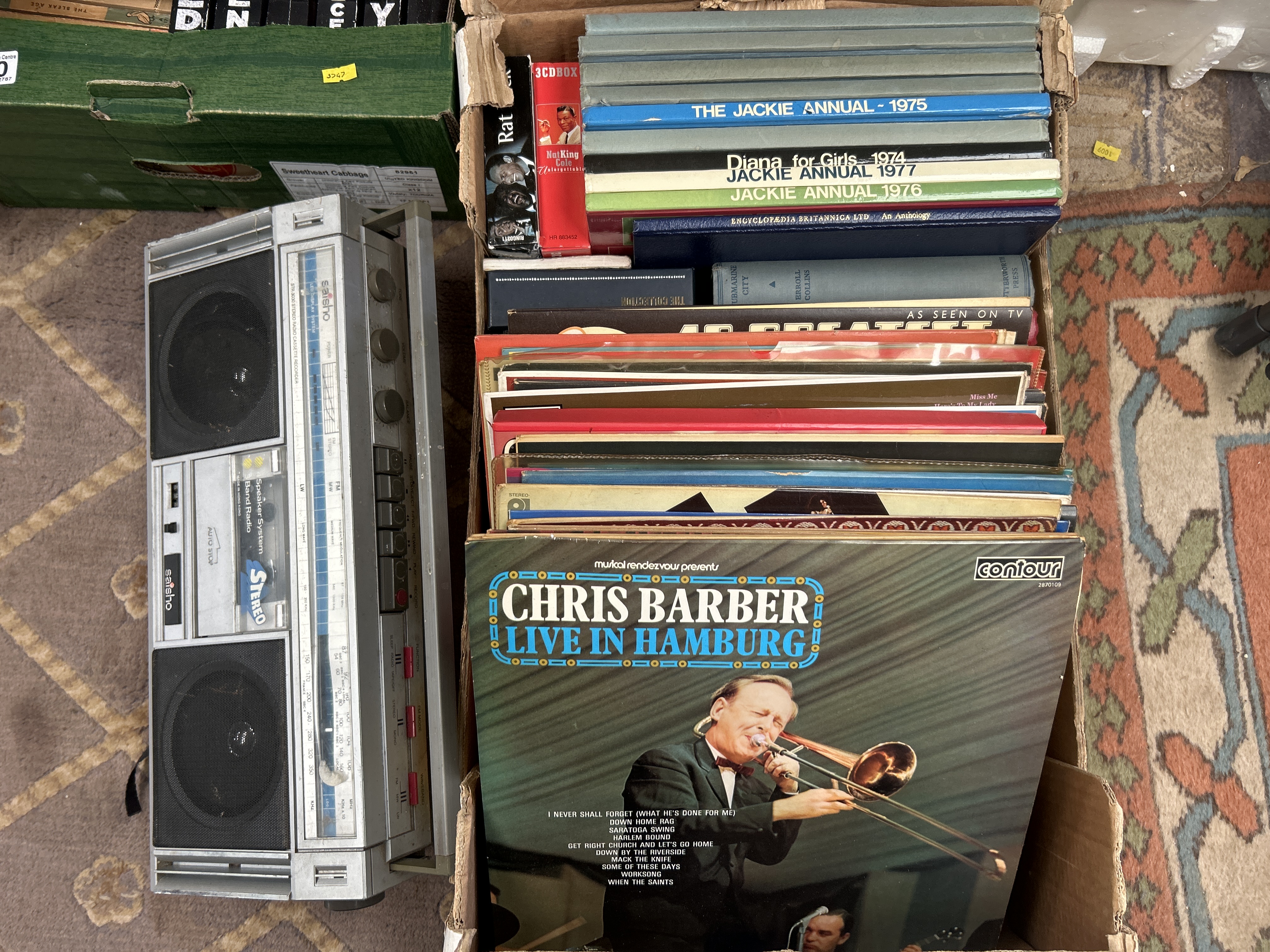 A collection of 37 items comprising one vintage Sanyo portable stereo cassette recorder/boombox and 36 pieces of mixed media. The Sanyo boombox is finished in silver-toned plastic with black metal speaker grilles and features a Four Band Radio (LW, MW, SW, FM), Stereo sound, and Auto Stop functionality. The media collection is stored in a corrugated cardboard box and consists of vinyl LPs, hardback annuals, and books, dating primarily to the mid-1970s. The most prominent LP is “CHRIS BARBER & HIS JAZZBAND – Live In Hamburg,” released on the Contour label (Ref 2870109). Other visible media titles include “THE JACKIE ANNUAL – 1975,” “JACKIE ANNUAL 1976,” “JACKIE ANNUAL 1977,” and “Diana for Girls 1974.”