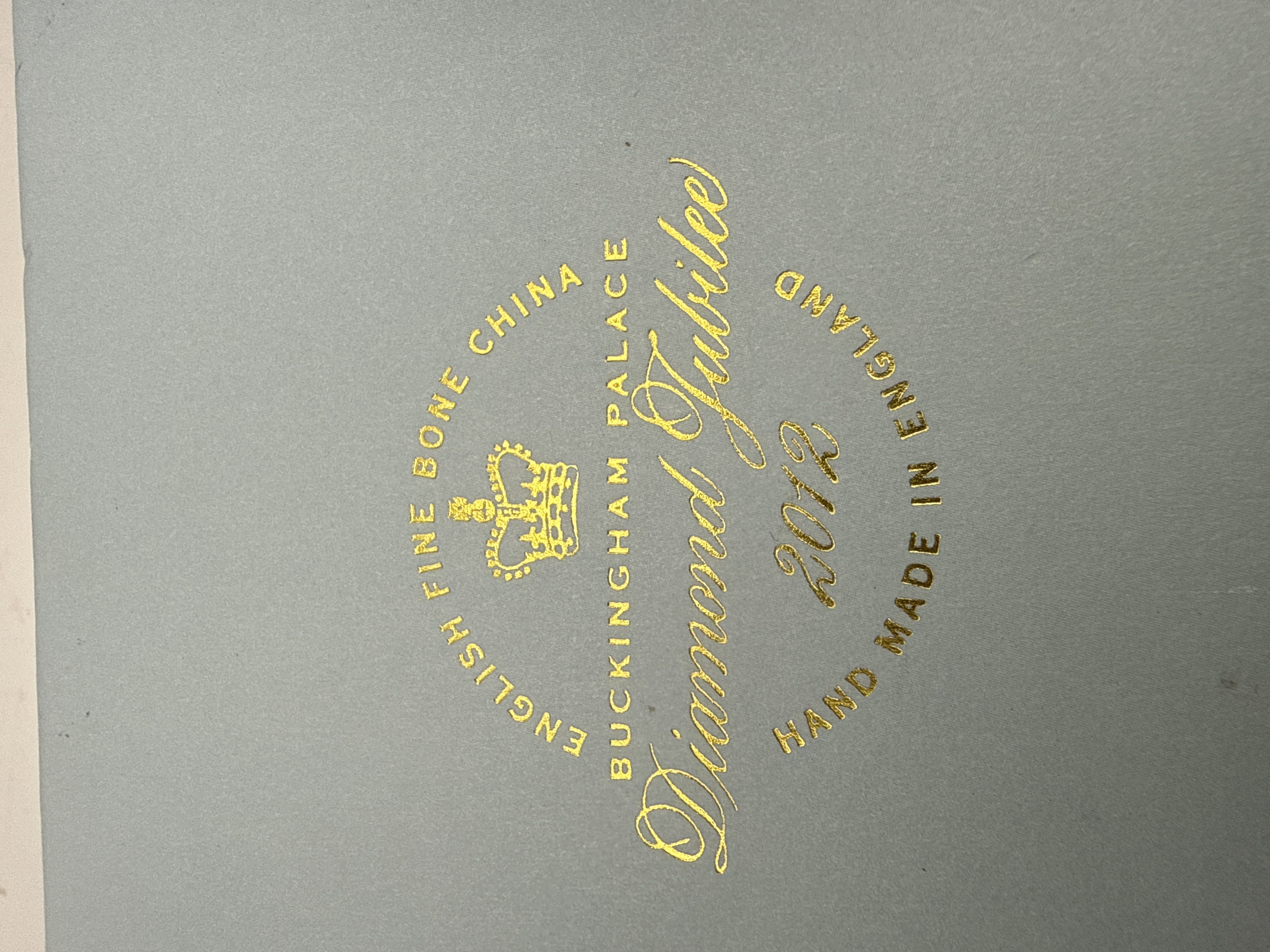 The collection consists of seven items, including three pieces of English fine bone china and four pierced metal napkin rings. The ceramic items commemorate Queen Elizabeth II’s Diamond Jubilee in 2012. The first set includes a porcelain teacup and matching saucer attributed to Royal Worcester, supported by a dark blue presentation box marked ROYAL WORCESTER ESTABLISHED 1751. Both pieces feature a white ground decorated with heavy gold scrolling and ornate gilt detailing. The second item is a circular porcelain lidded trinket box, resting on its light blue presentation box marked ENGLISH FINE BONE CHINA BUCKINGHAM PALACE Diamond Jubilee 2012 HAND MADE IN ENGLAND. The box is detailed with light blue banding and heavy gilt, featuring a royal portrait or device on the lid. The remaining four items are cylindrical pierced metal napkin rings, exhibiting a silver tone and a geometric star cutout pattern, consistent with silver-plated wares found in the market.