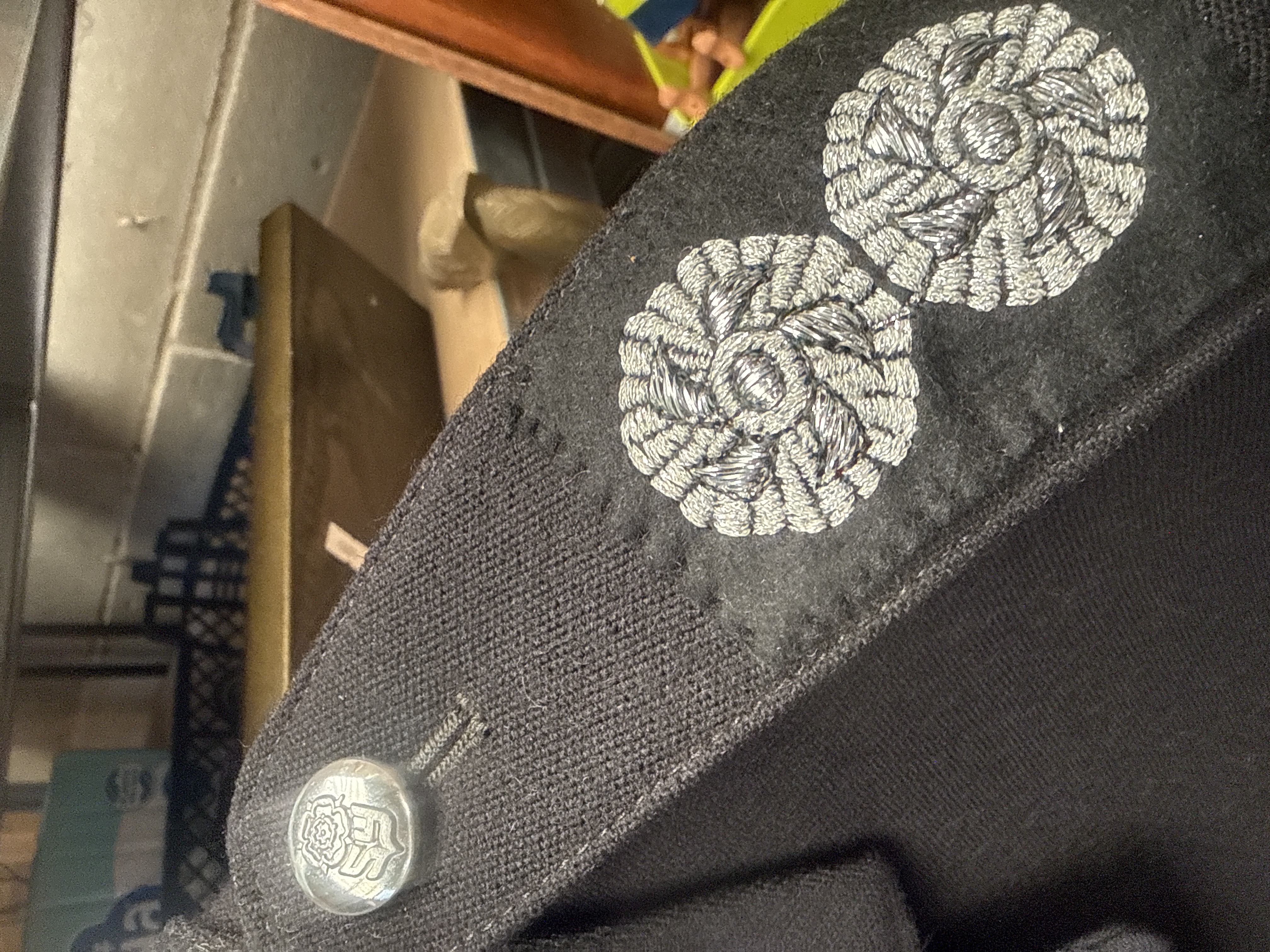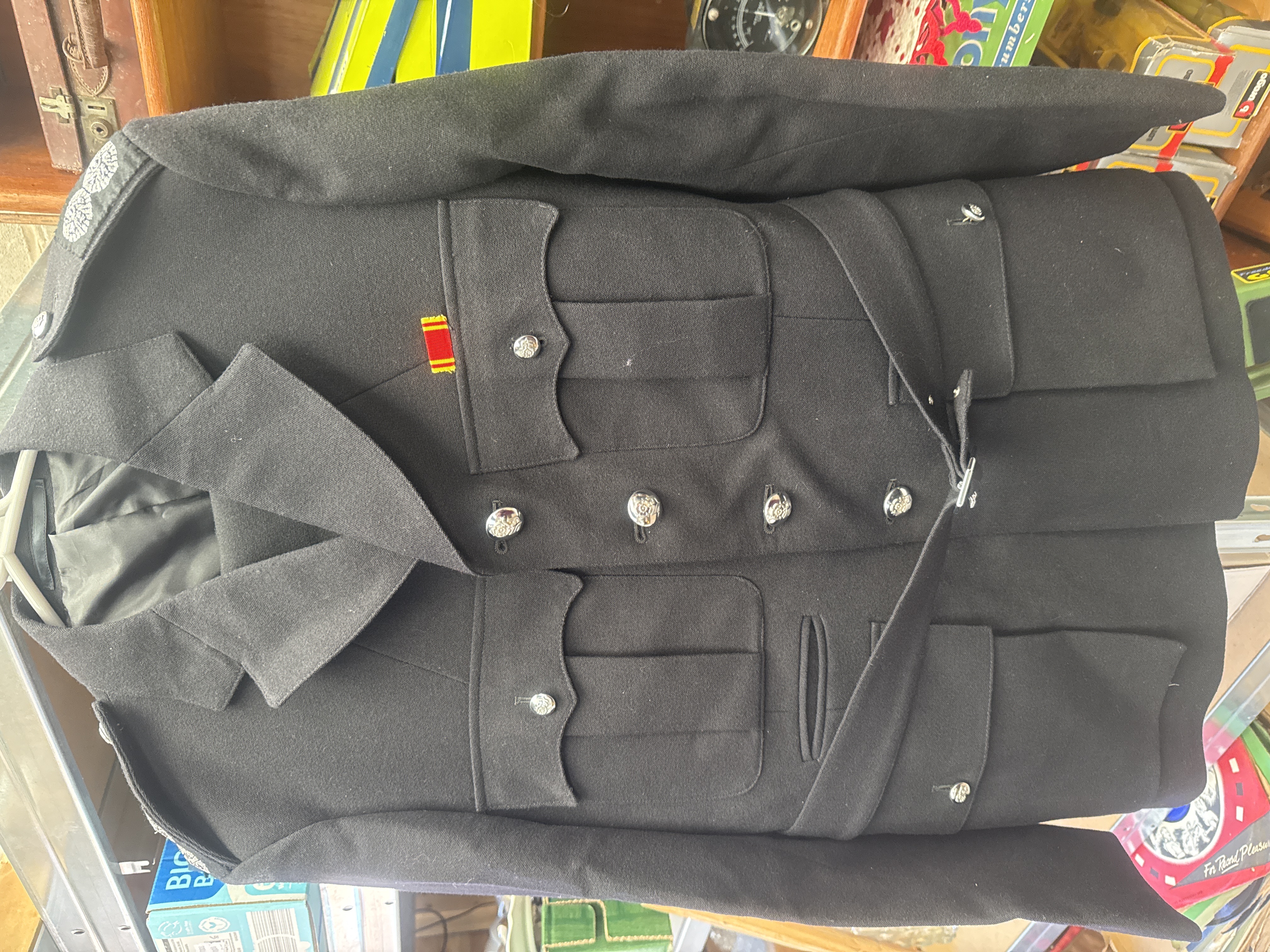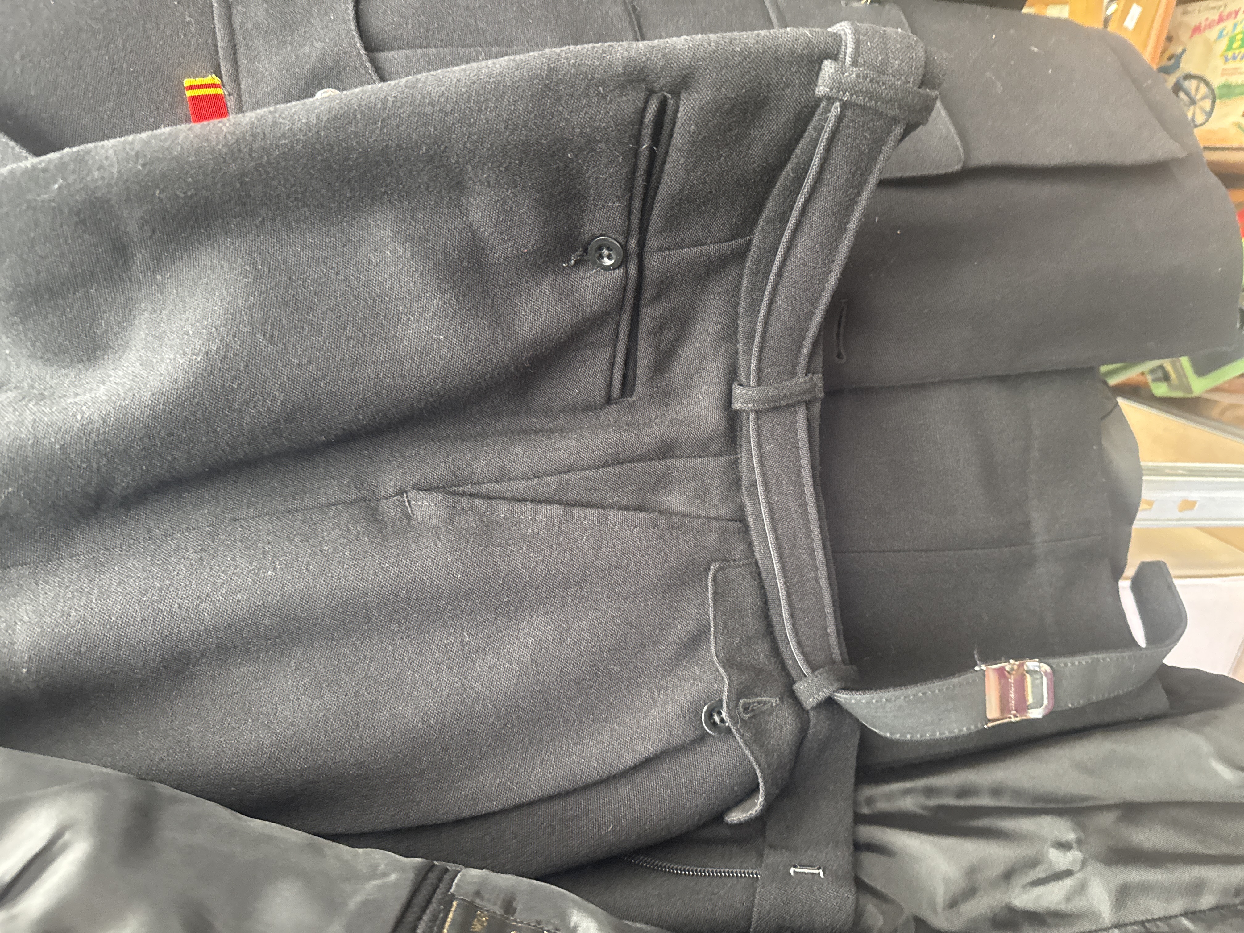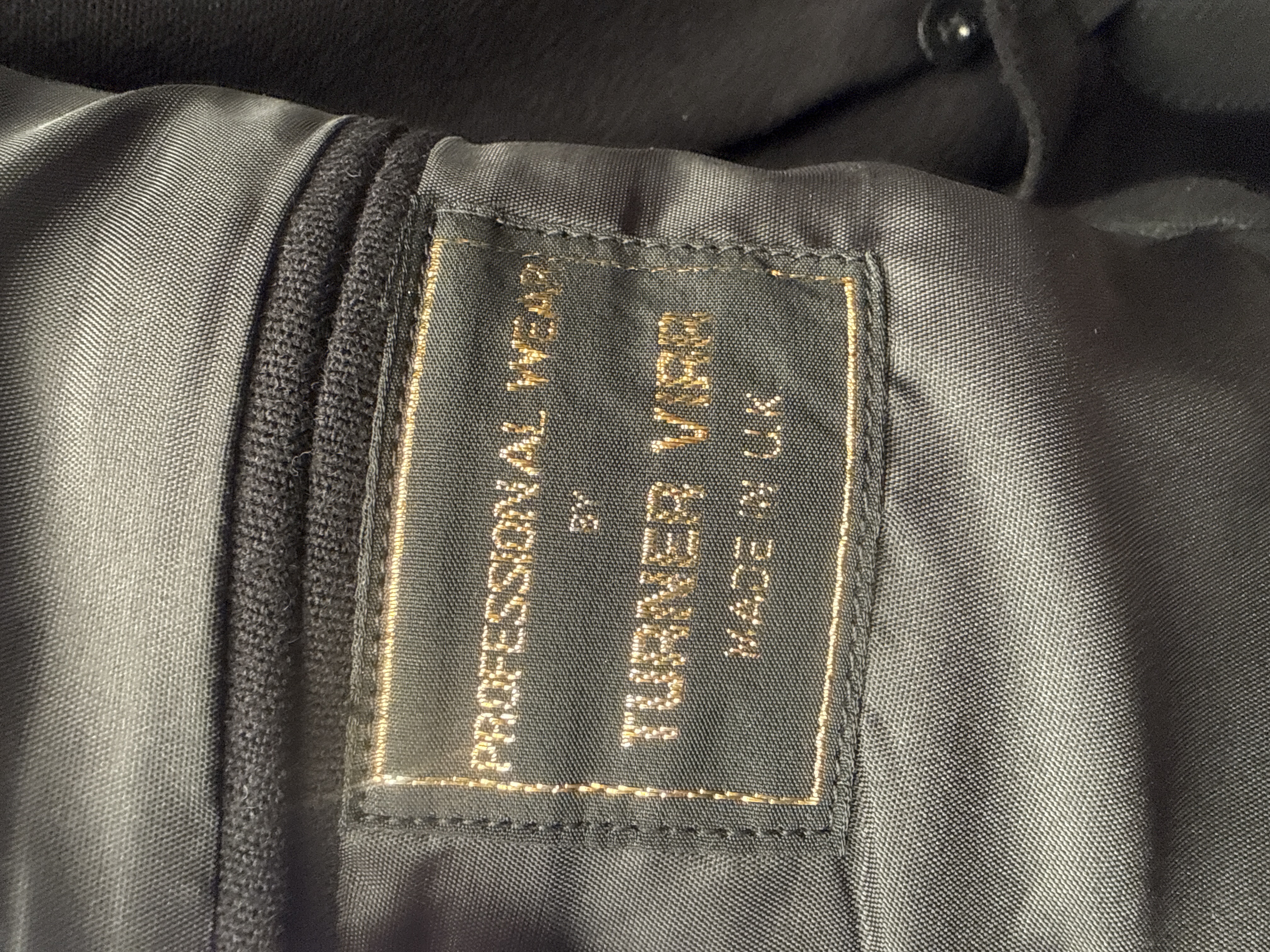 A two-piece service uniform comprising a jacket/tunic and a matching pair of trousers, manufactured by Turner Virgo in the U.K. The garments are executed in a black or very dark wool or wool blend fabric. The jacket is designed in a tailored, four-pocket style featuring notch lapels and a black synthetic lining. The jacket includes an integral fabric belt secured by a silver-tone buckle. Insignia includes a ribbon bar of red and yellow stripes affixed to the left breast. The shoulder epaulets bear silver wire embroidered rank rosettes, two visible per side, secured by silver-tone buttons. These buttons are embossed with a rose motif, likely the Tudor Rose, suggesting British service provenance. The interior features a woven label reading PROFESSIONAL WEAR BY TURNER VIRGO MADE IN U.K. The accompanying trousers are of matching material and are confirmed to be approximately 34” waist.