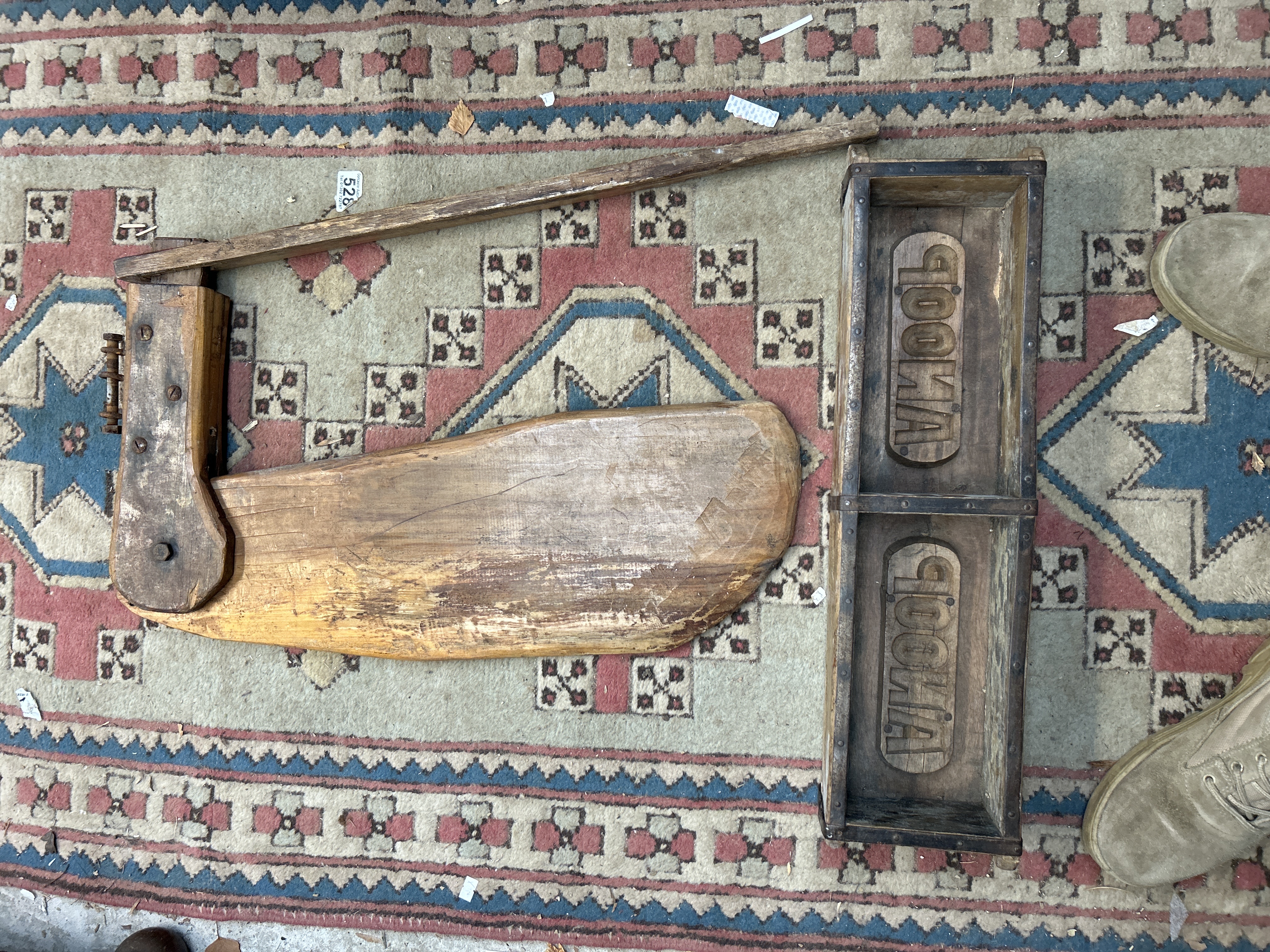 A collection of two vintage wooden implements likely used in dairy or food production, consistent with early 20th-century agricultural equipment. The lot includes two primary objects. The first is a large wooden tool, possibly a component of a mechanical butter worker or churn, featuring a wide, paddle-shaped blade hinged to a rectangular arm. This arm is secured with heavily oxidized metal screws and a threaded bolt mechanism. An associated wooden stick or handle, likely detached from the main assembly, is included. The second item is a sturdy, two-compartment wooden mold, reinforced externally with black metal strapping and rivets. The interior of the mold features deep, reverse-carved Cyrillic characters intended to stamp the finished product. The inscriptions read ‘УИЮОБ’ in the left section and ‘УИЮОД’ in the right section.
