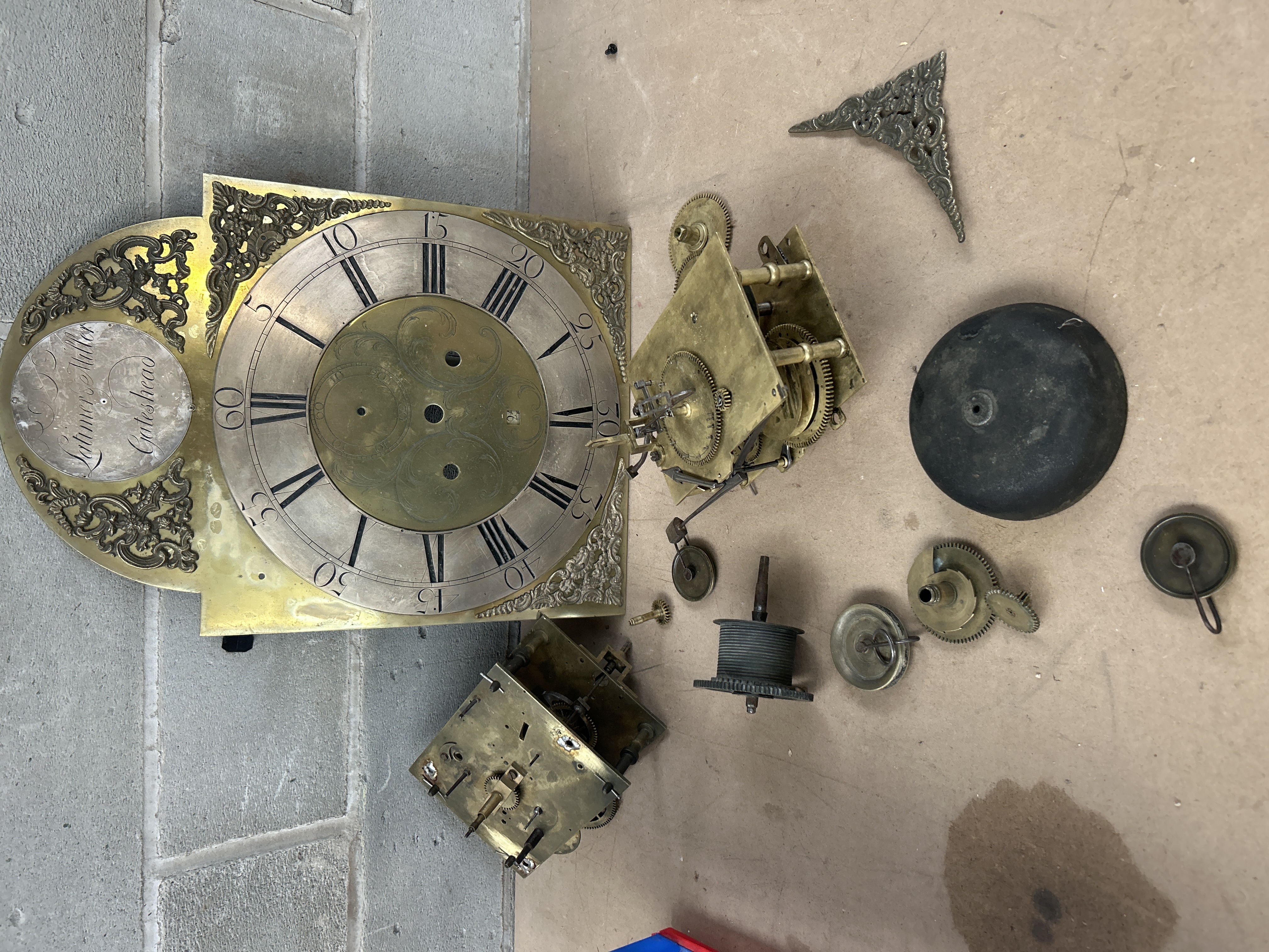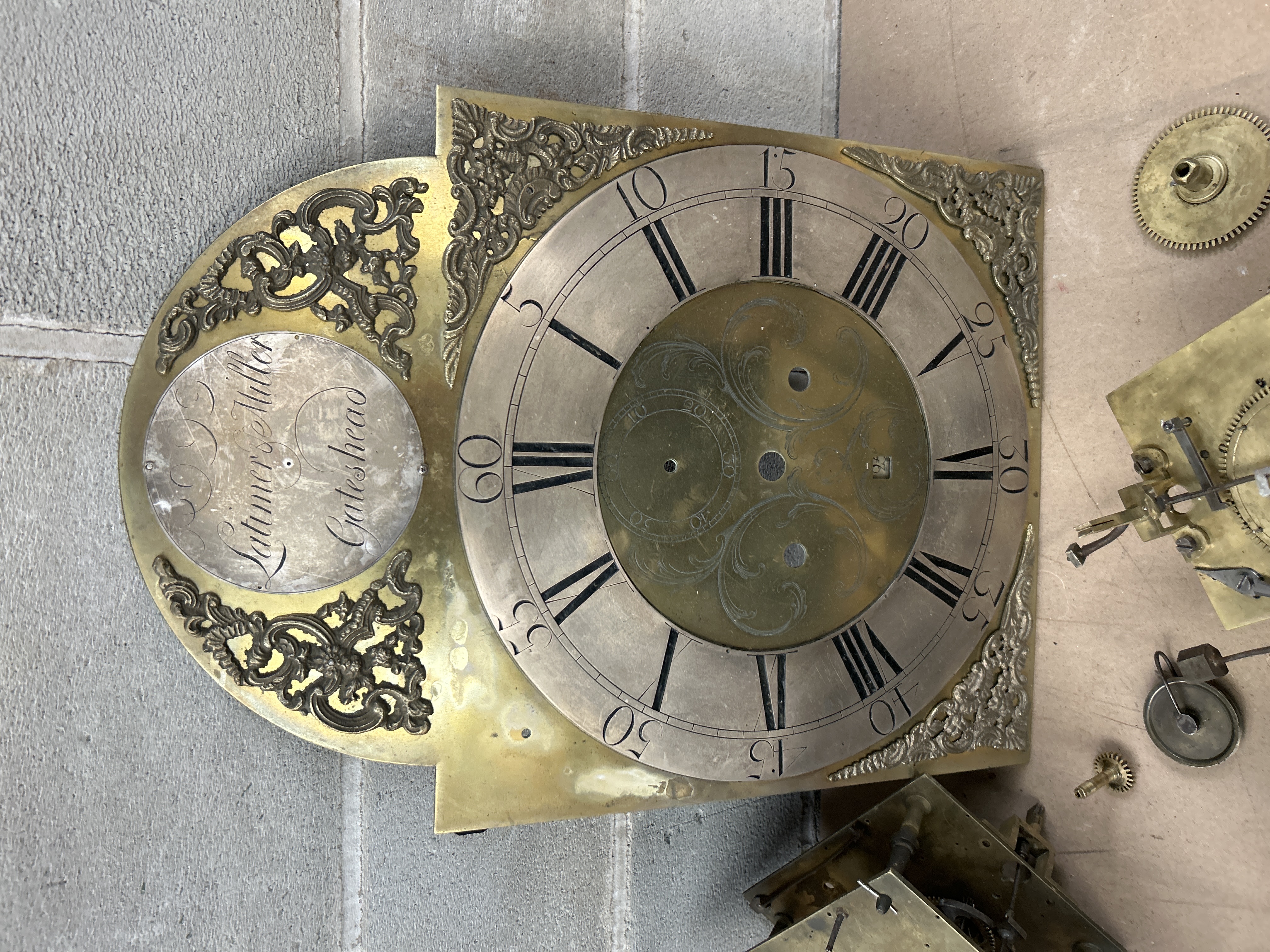 A collection of disassembled components from an antique English longcase (grandfather) clock, attributed to Latimer Miller of Gateshead, as inscribed on the dial. The lot includes the primary square and arched brass dial plate, featuring a silvered chapter ring with Roman numerals and Arabic minute markings. The dial is constructed from brass and decorated with ornate brass spandrels at the corners and arch. The inscription “Latimer Miller / Gateshead” is visible on a circular plaque within the arch. The collection also comprises two incomplete brass clock movements (cages), a dark metal bell, a winding barrel, one loose decorative brass corner spandrel, and a group of eight various smaller individual brass gears, wheels, and pinions. The overall style is consistent with English clockmaking of the late 18th or early 19th Century.
