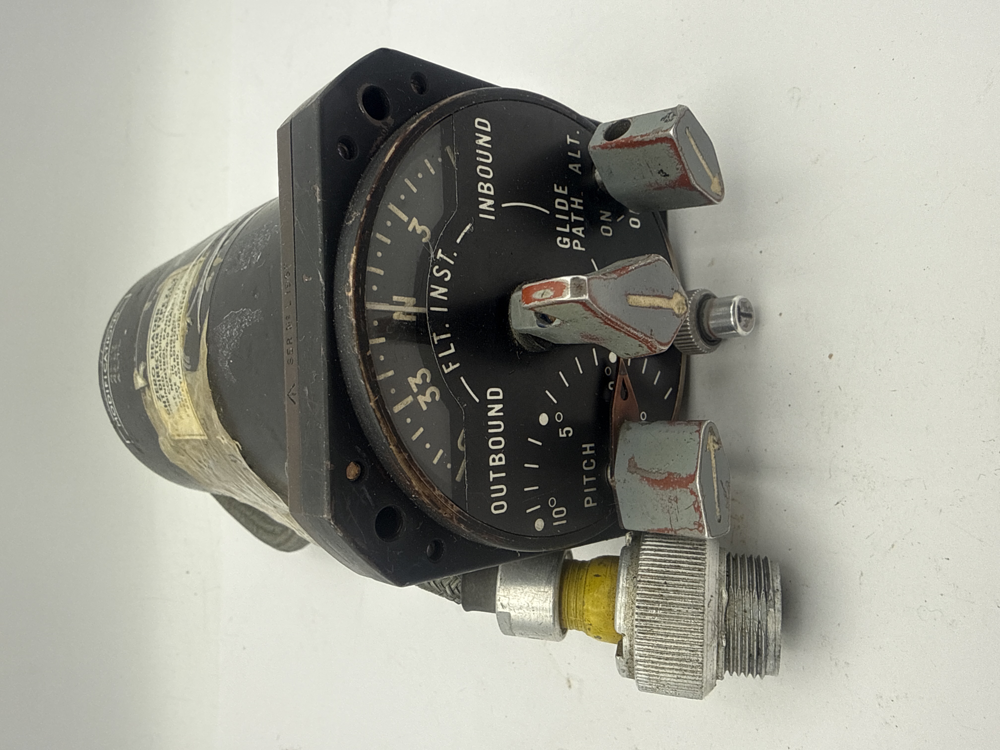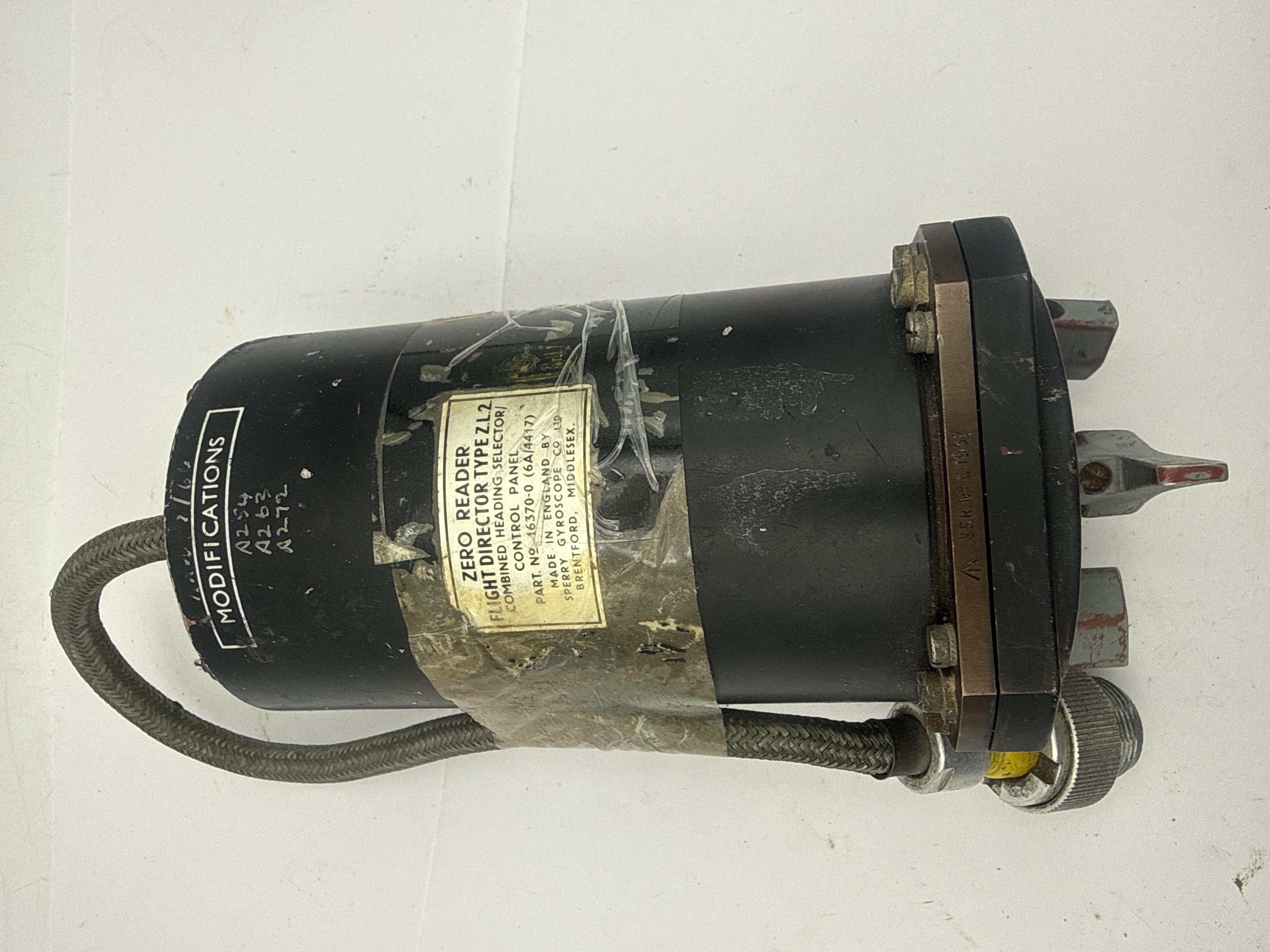 A vintage avionics component identified by its label as a Zero Reader Flight Director Type ZL2 Combined Heading Selector/Control Panel. Manufactured by Sperry Gyroscope Co. Ltd. in Brentford, Middlesex, England. The component features a cylindrical body constructed of black-painted metal, terminating in an octagonal mounting face. The black dial is marked with navigational indicators including “FLT. INST.,” “OUTBOUND,” “INBOUND,” “PITCH,” and “GLIDE PATH ALT.” Three control knobs, painted grey and red, are present on the face. A heavy braided wire cable connector is attached. Key identification markings include Part No. 16570-1 (6A/4212) and Serial No. 17924. Handwritten modification numbers (A204, A145, A272) are visible on the upper surface under the heading “MODIFICATIONS.”