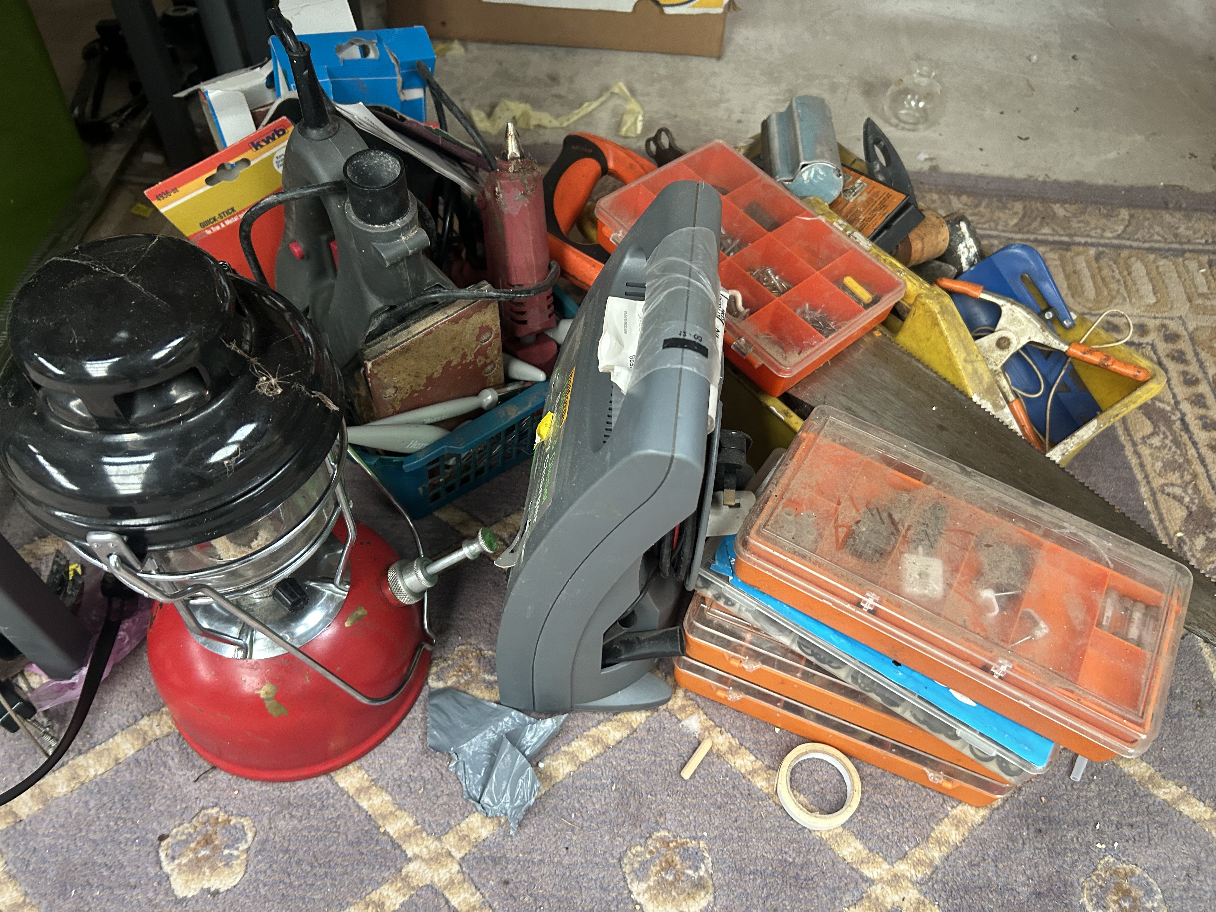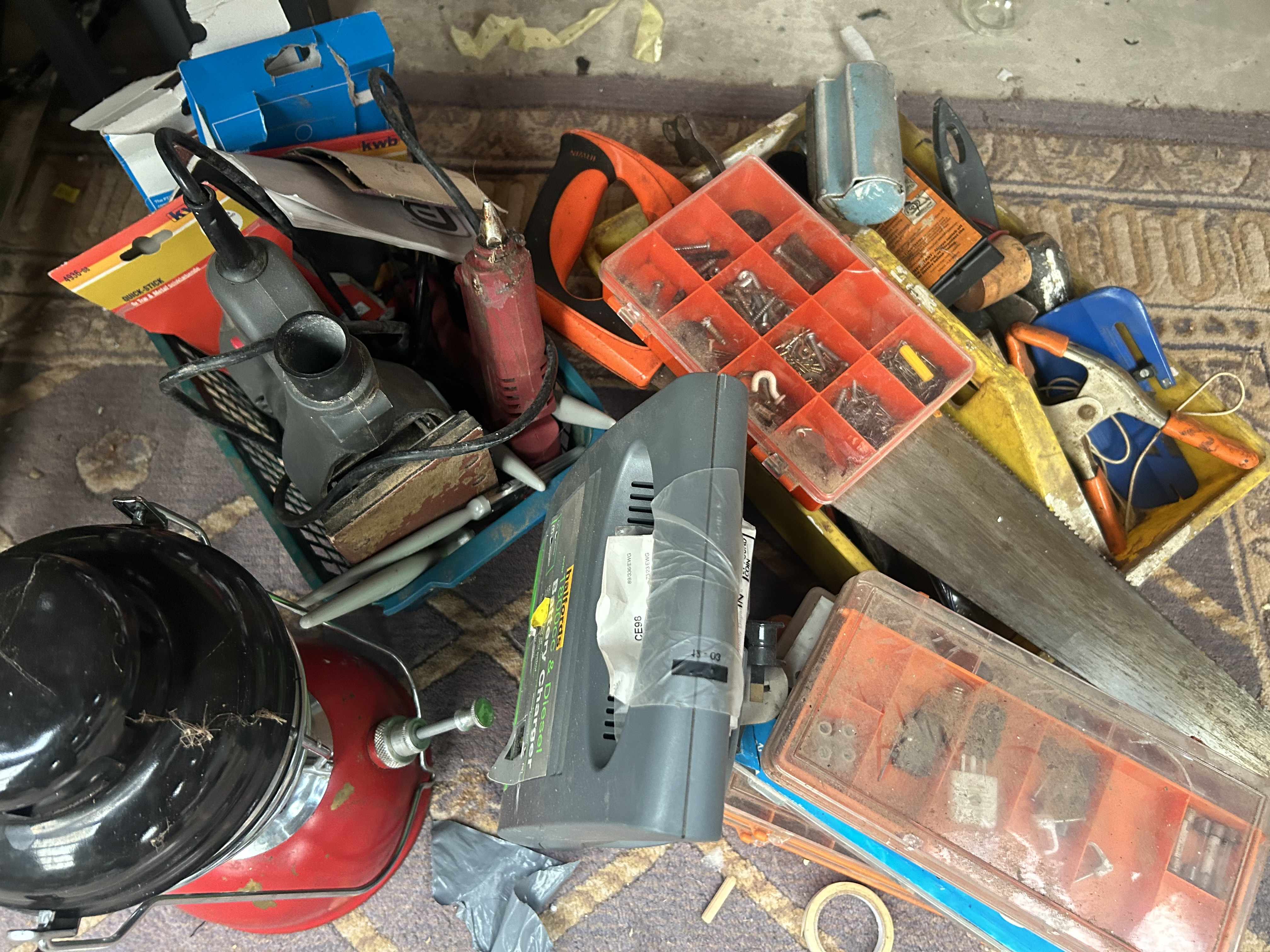 A substantial collection of miscellaneous household tools, loose hardware, and electronic devices. The lot includes several major components such as a vintage-style metal lantern featuring a red painted base and a black dome top. Power tools present include a corded drill or grinder and a smaller red electric rotary tool. Also visible is a large handsaw with a yellow plastic handle. The collection contains multiple orange and clear plastic organizer boxes filled with assorted fasteners, screws, and nails. A prominent gray plastic electronic device is present, marked with the text CHARGE and CE00. Research suggests this device may be related to specialized equipment such as a docking station, portable power station, or robotics controller, consistent with web context keywords like station, power, and VEX robotics. Additional items include various hand tools, loose wires, and packaged goods, including one box partially marked Kobo.
