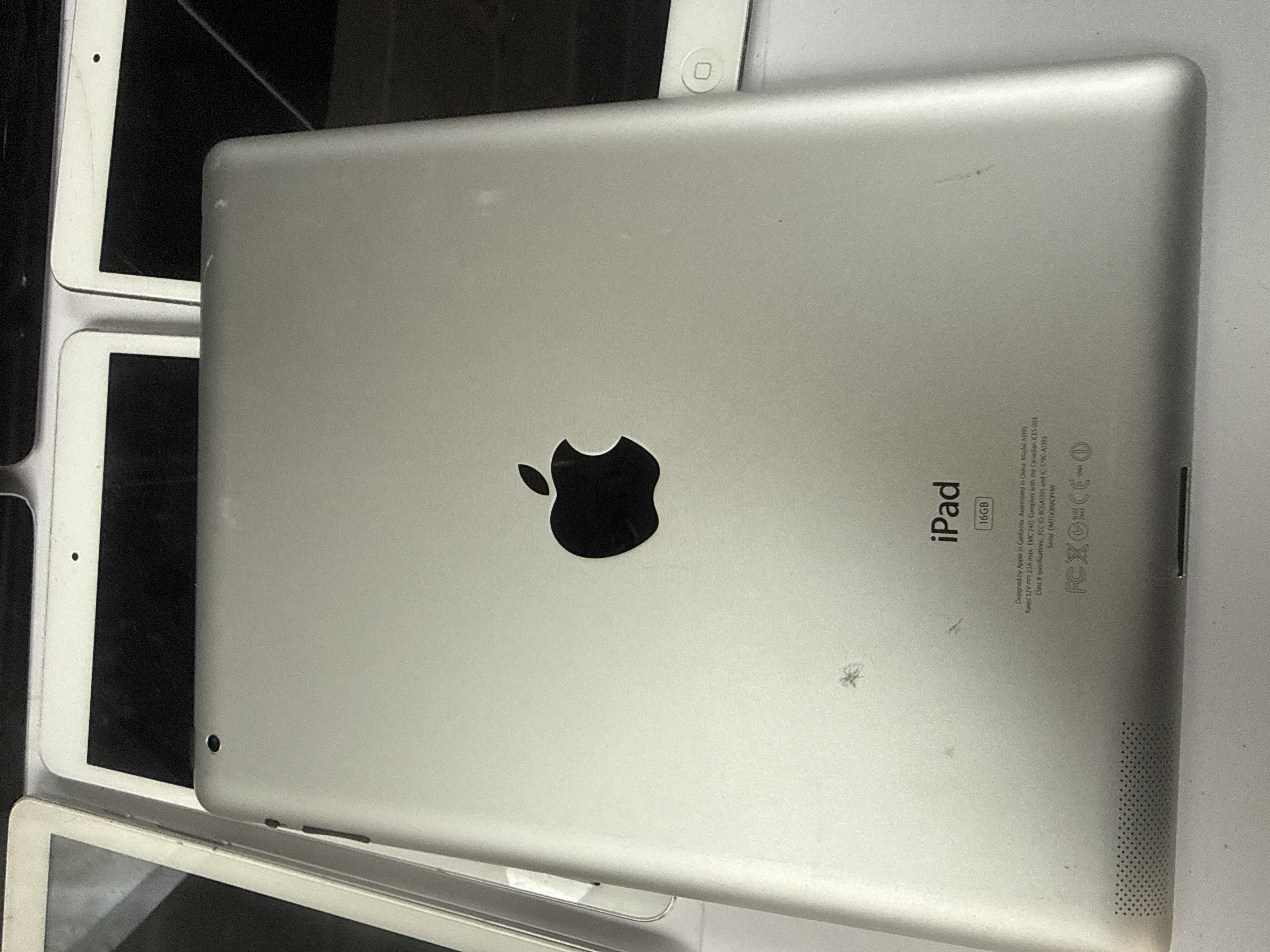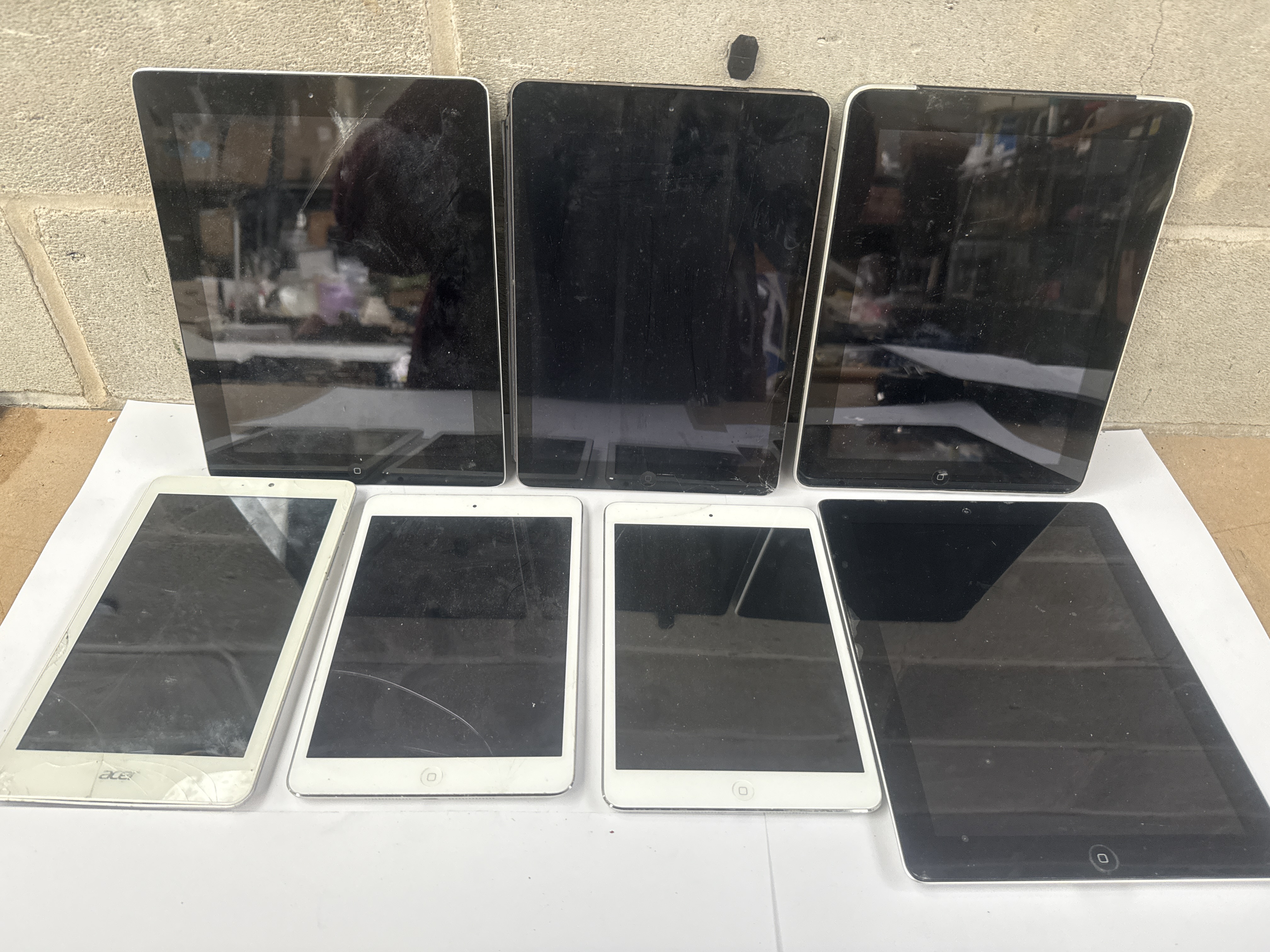 A collection of seven electronic tablets, described as being in working order. The lot consists of six Apple iPads and one Acer tablet, consistent with the visual inspection and user-provided keywords. The devices feature black glass touchscreens and are housed in white or silver/aluminum casings. One silver-backed Apple device is visible, marked with the Apple logo and the text “iPad,” “16GB,” and regulatory text identifying the Model A1395. This device confirms it was “Designed by Apple in California. Assembled in China.” The single Acer device is identified by the “ACER” marking on its front bezel.