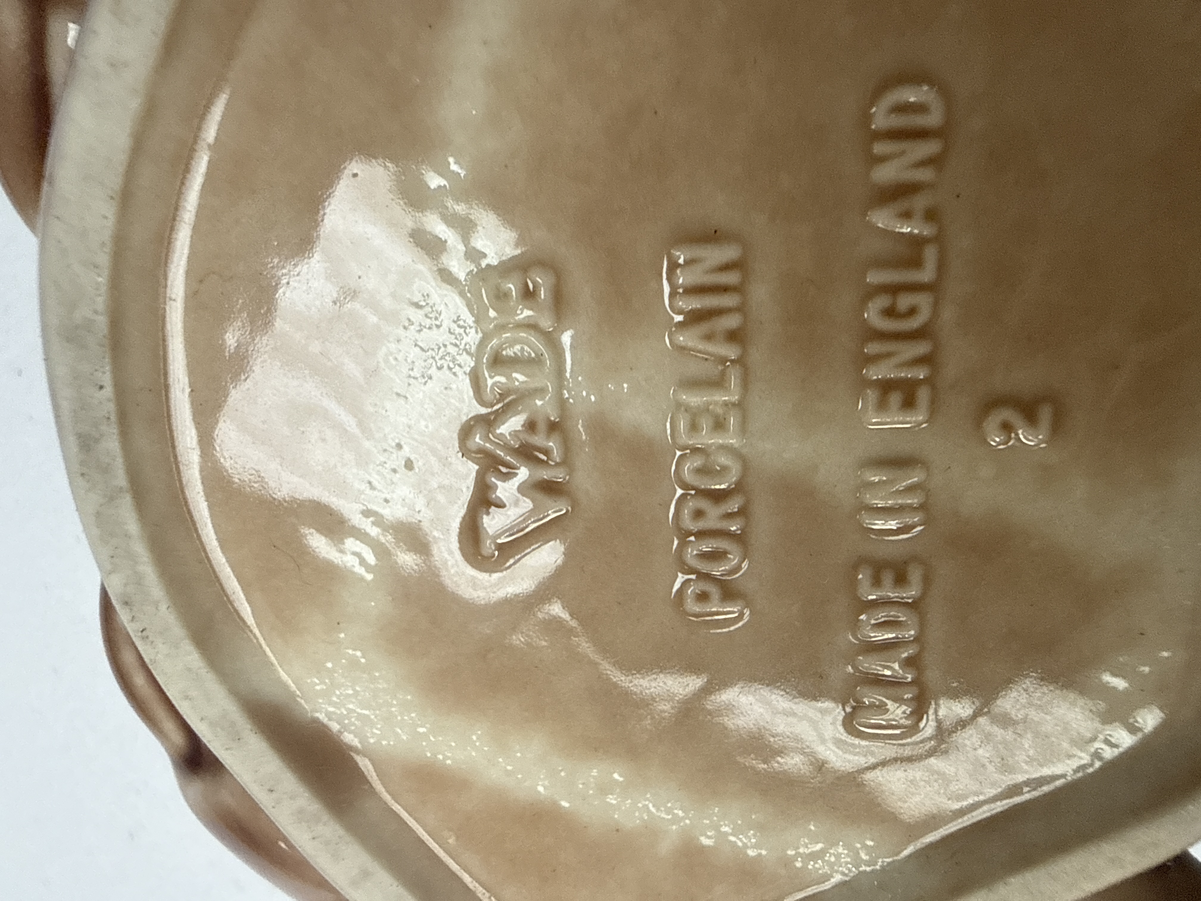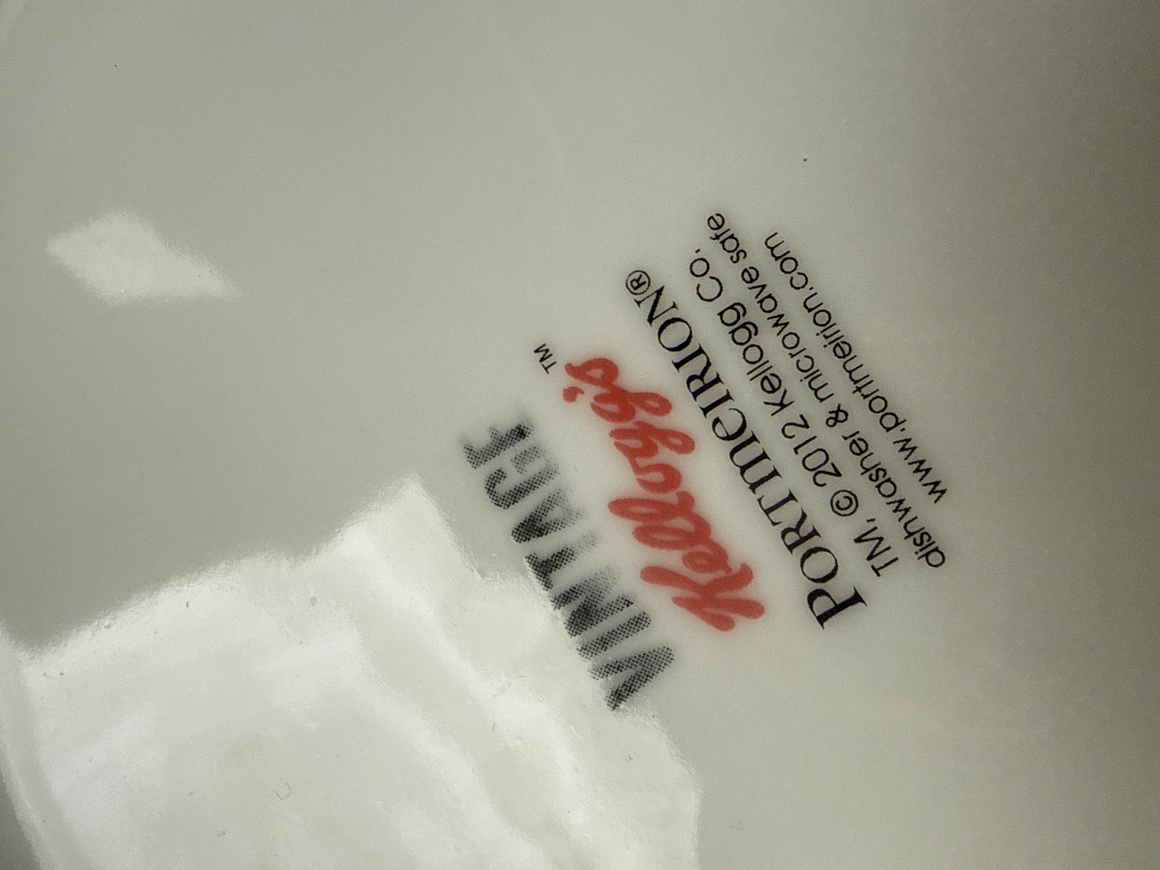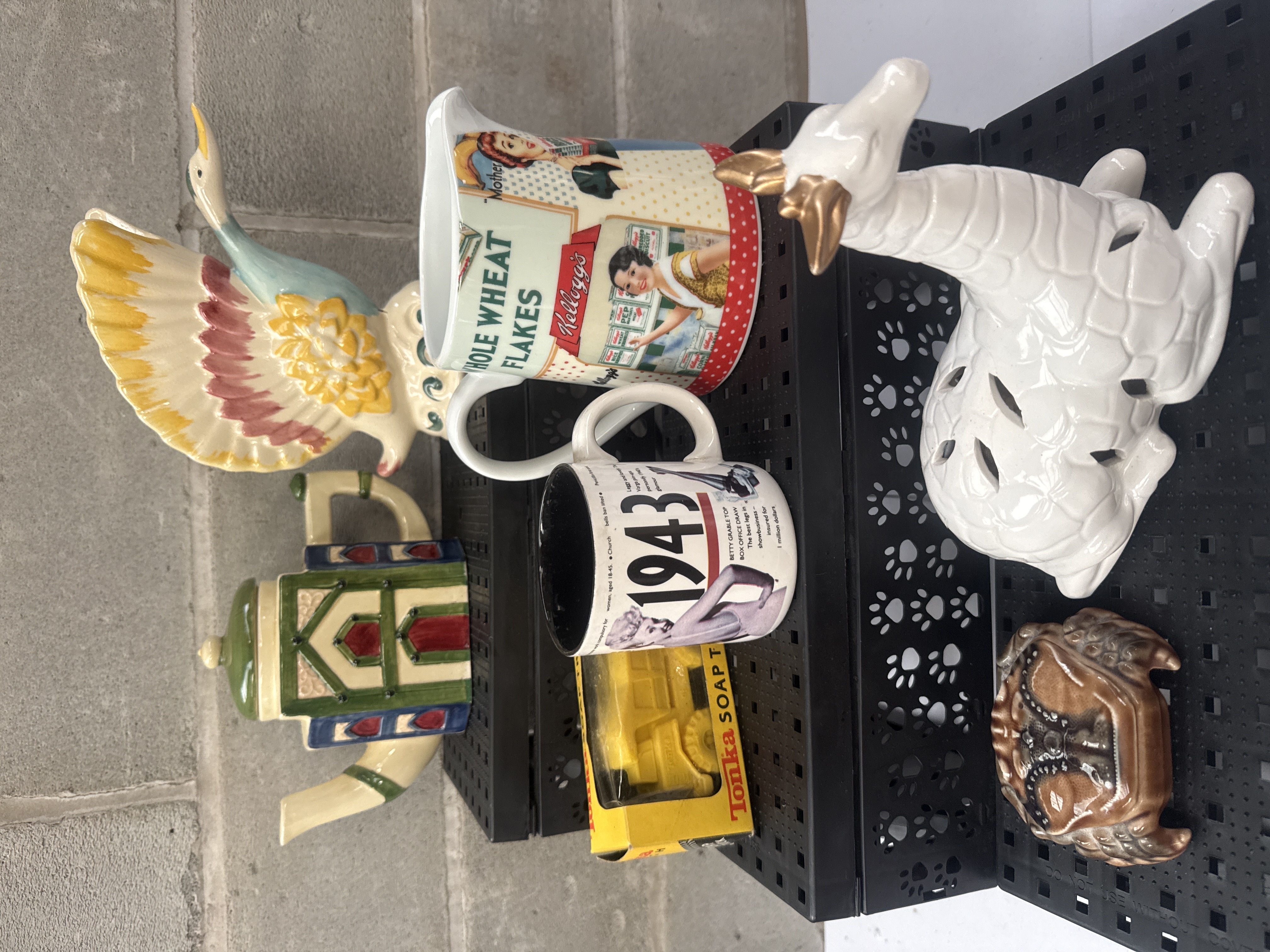 The collection consists of 7 items, primarily ceramic housewares and decorative objects, displayed across two storage risers. The ceramic items include a multi-colored geometric teapot, a stylized polychrome figural goose vessel, and a white glazed figural decoration piece with gold accents on the horns. Two advertising-themed ceramic vessels are present: a mug marked with a “1943” graphic, and a Kellogg’s ‘Whole Wheat Flakes’ pitcher. The pitcher is marked on the base “VINTAGE Kellogg’s PORTMEIRION TM, © 2012 Kellogg Co.” Also included is a small brown glazed figural box or trinket dish stamped on the underside “WADE PORCELAIN MADE IN ENGLAND 2.” The final item is a yellow cardboard “Tonka Soap Box” containing a small yellow toy vehicle.