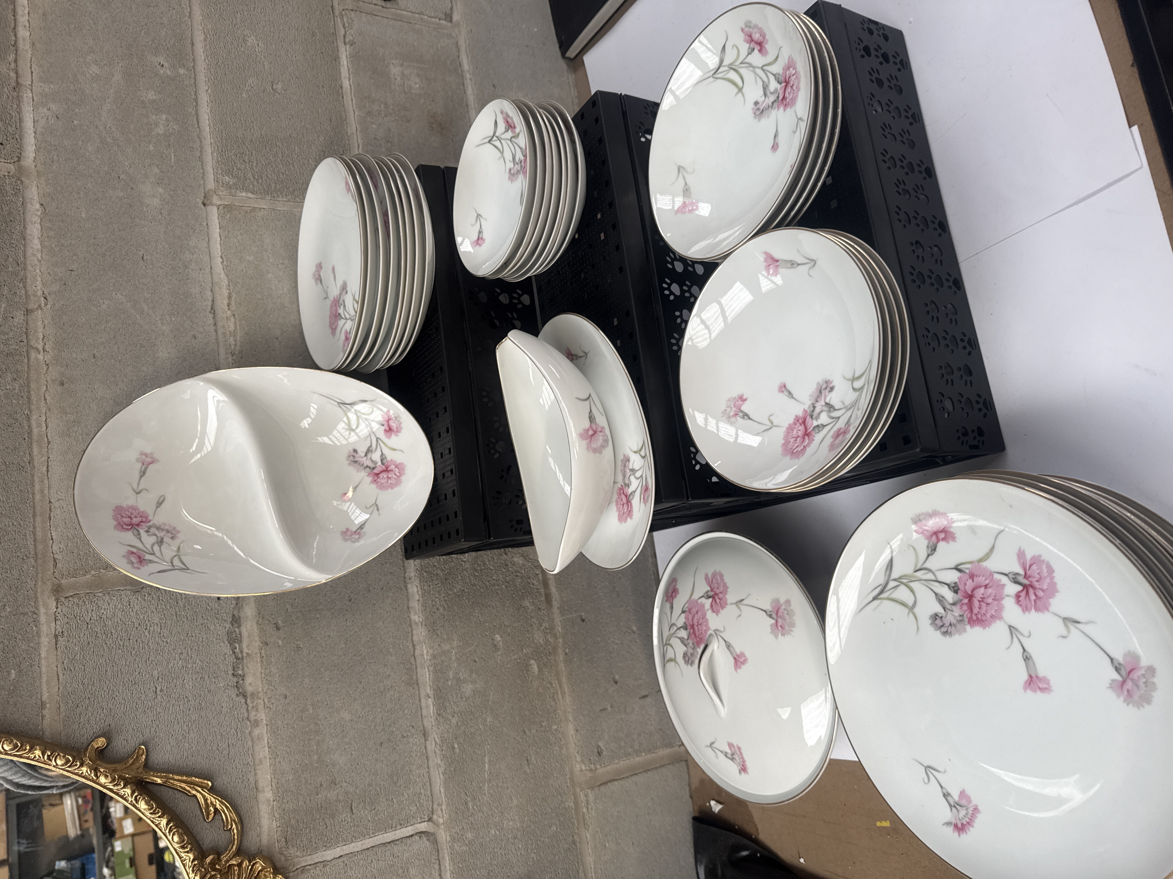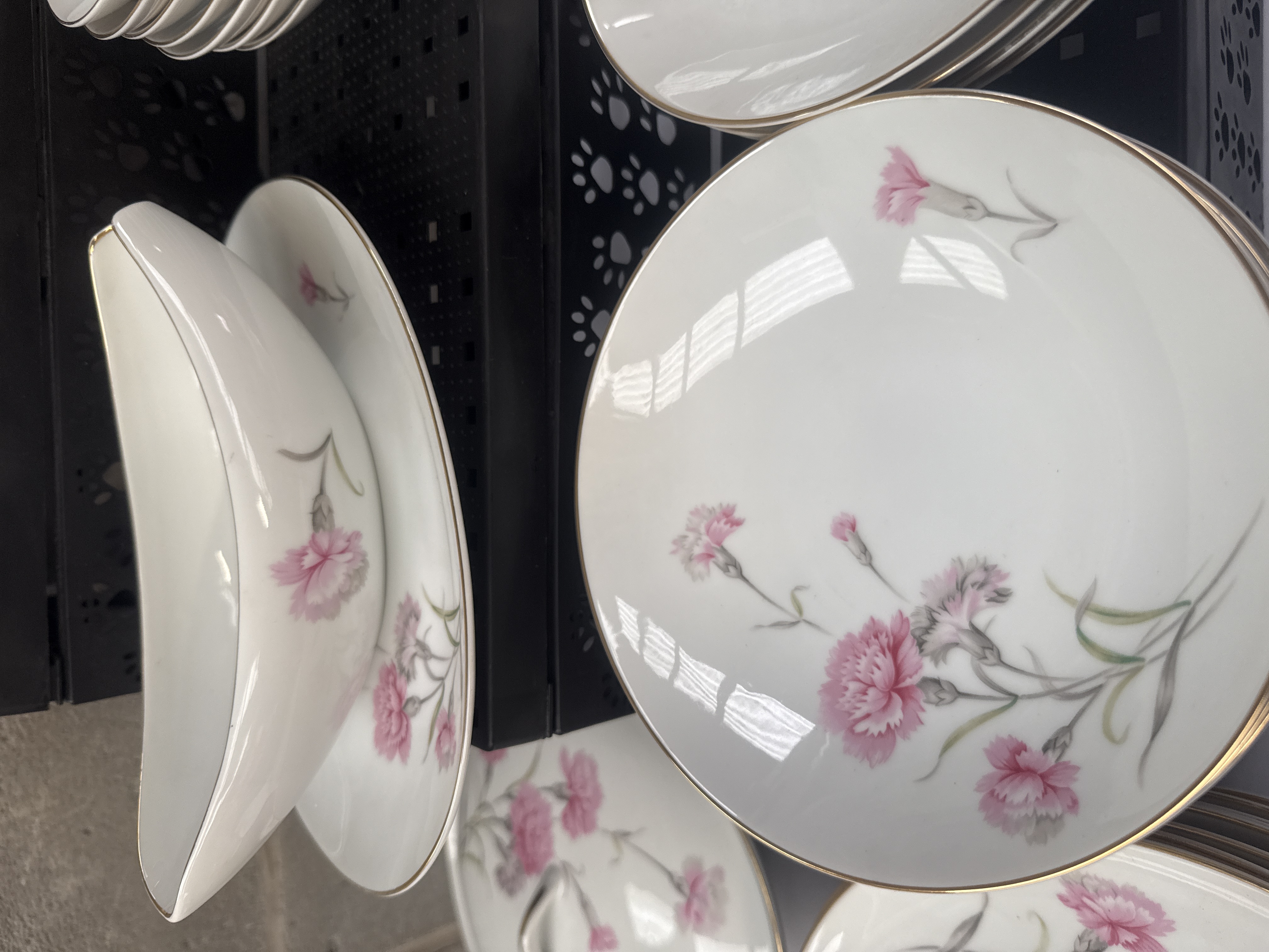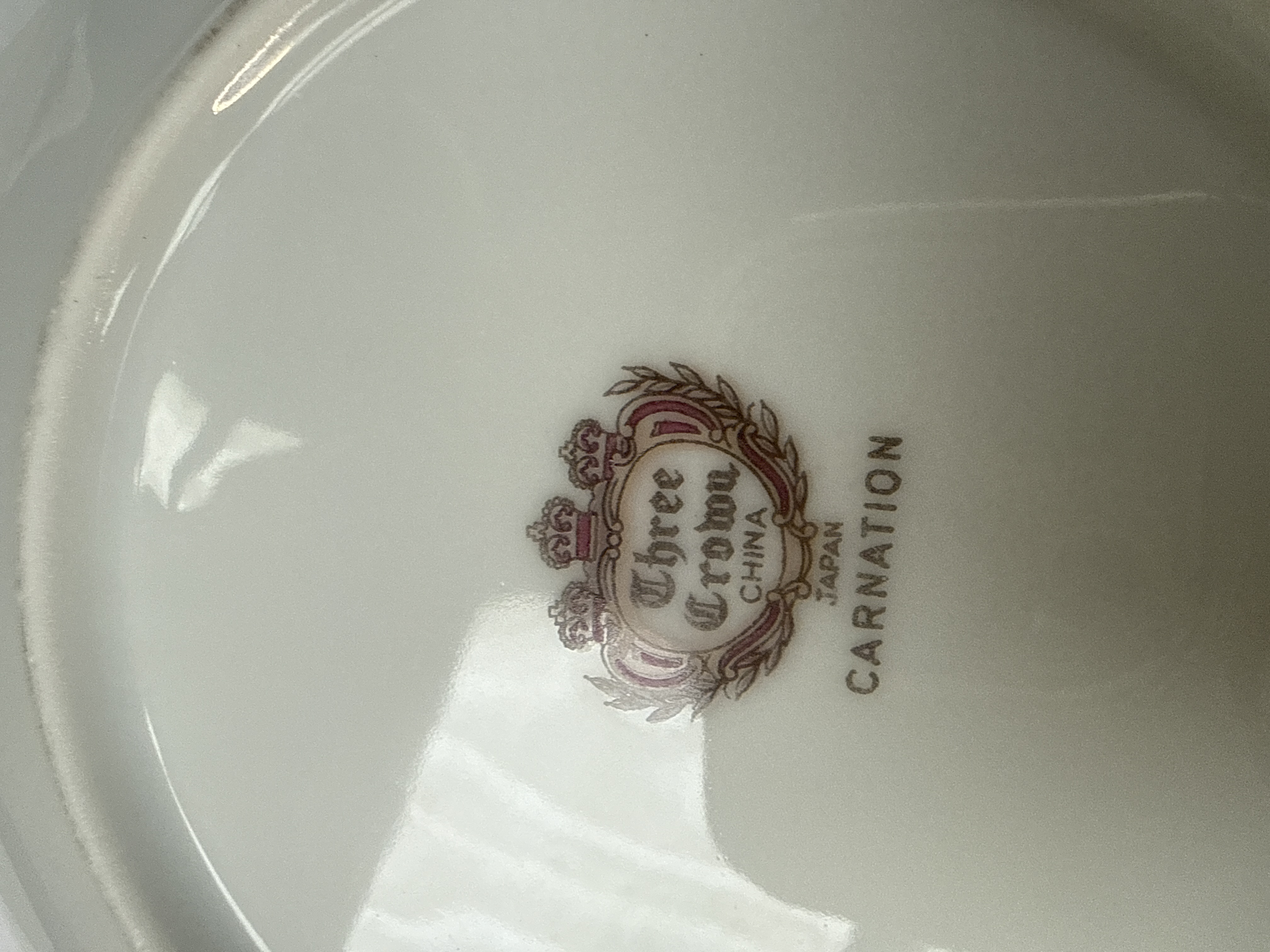 A collection of thirty-four pieces of mid-century Japanese china dinnerware in the Carnation pattern, attributed by market consensus to Royal Court. The pattern features a floral design of pink and magenta carnation sprays and gray-green foliage against a white ground. The pieces are finished with a high gloss glaze and gold trim along the rims. The visible backstamp on the pieces identifies the manufacturer as Three Crown China, Japan, Carnation. The collection includes various sized plates, bowls, and serving pieces, such as a large two-compartment oval serving dish, a gravy boat resting on its underplate, and a covered serving dish (base and lid).