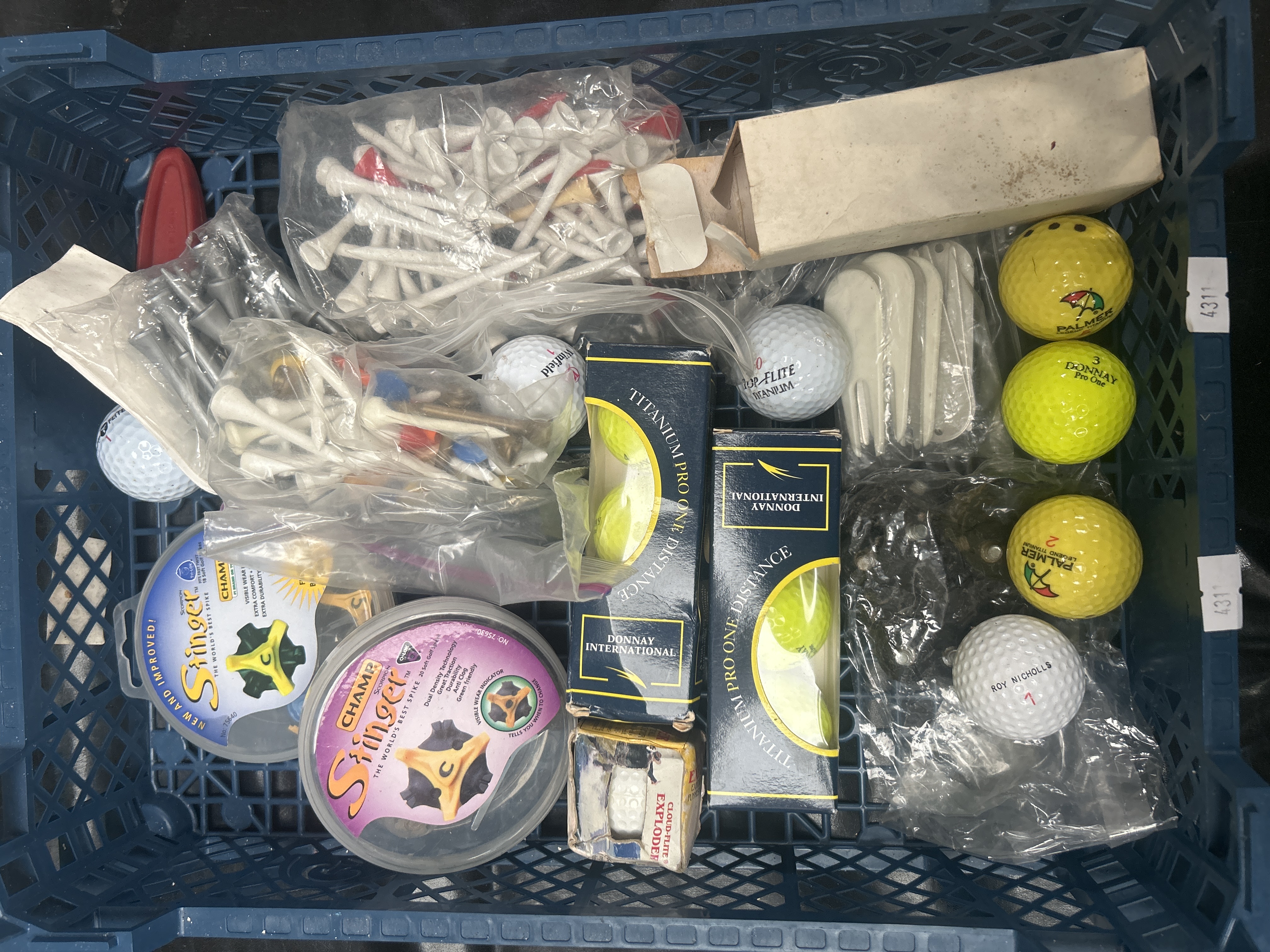A collection of packaged and loose golf accessories and balls contained within a blue plastic lattice storage crate. The lot includes various contemporary sporting goods made from plastic, composite materials, and cardboard packaging. Packaged items include two clear containers of CHAMP Stinger golf spikes/cleats, two dark blue boxes of Donnay International Titanium Pro One Distance golf balls, and one small partially open box labeled Cloud-Flite Exploder. Also present are two large plastic bags holding numerous mixed white, red, and yellow plastic and wooden golf tees, a tall upright beige box, a small bag of black accessories, a stack of white accessories, and a red plastic marker/accessory. Seven loose golf balls are included, bearing brands such as Top Flite, Winfield, Roy Nicholls, and Arnold Palmer Legend Titanium.