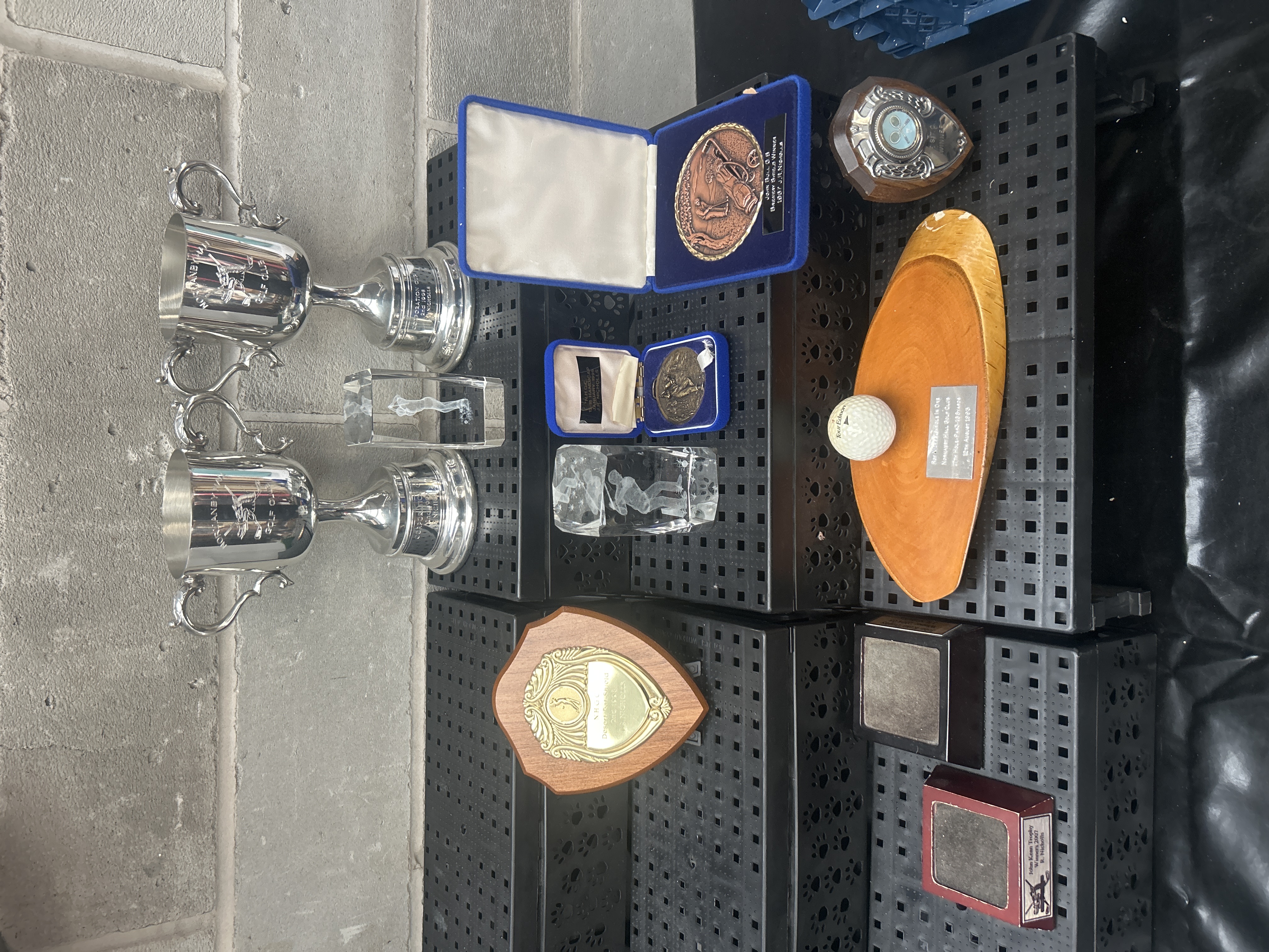 A collection of sporting awards, presentation pieces, and related items, primarily associated with golf and inscribed to members of the Nicholls family, dating from 1908 to 2007. The collection includes two traditional two-handled silver-tone metal cups, both engraved with club insignia (Hornby Hall Golf Club visible) and inscriptions. Also present are two rectangular crystal or glass awards featuring internal 3D laser-etched figures of golfers. The lot further comprises multiple plaques and trophy bases constructed from wood, brass-tone metal, and composite materials. Specific historical inscriptions noted include Corporation Cup 2nd 1908, John Bull & St. Baskervy Shield Winner 1937, and multiple achievements attributed to J.R. Nicholls. The collection also features two blue velvet presentation boxes, one containing a circular medal/buckle, and three separate trophy bases (one red, two dark wood). One oblong wooden base commemorates a Hole In One achievement (dated 1993) and rests a single white Tour Edition golf ball. A small shield plaque depicting tennis rackets is also included, referencing a S.I.T.C. Winner. The latest inscription references the John Kean Trophy Winners 2007.