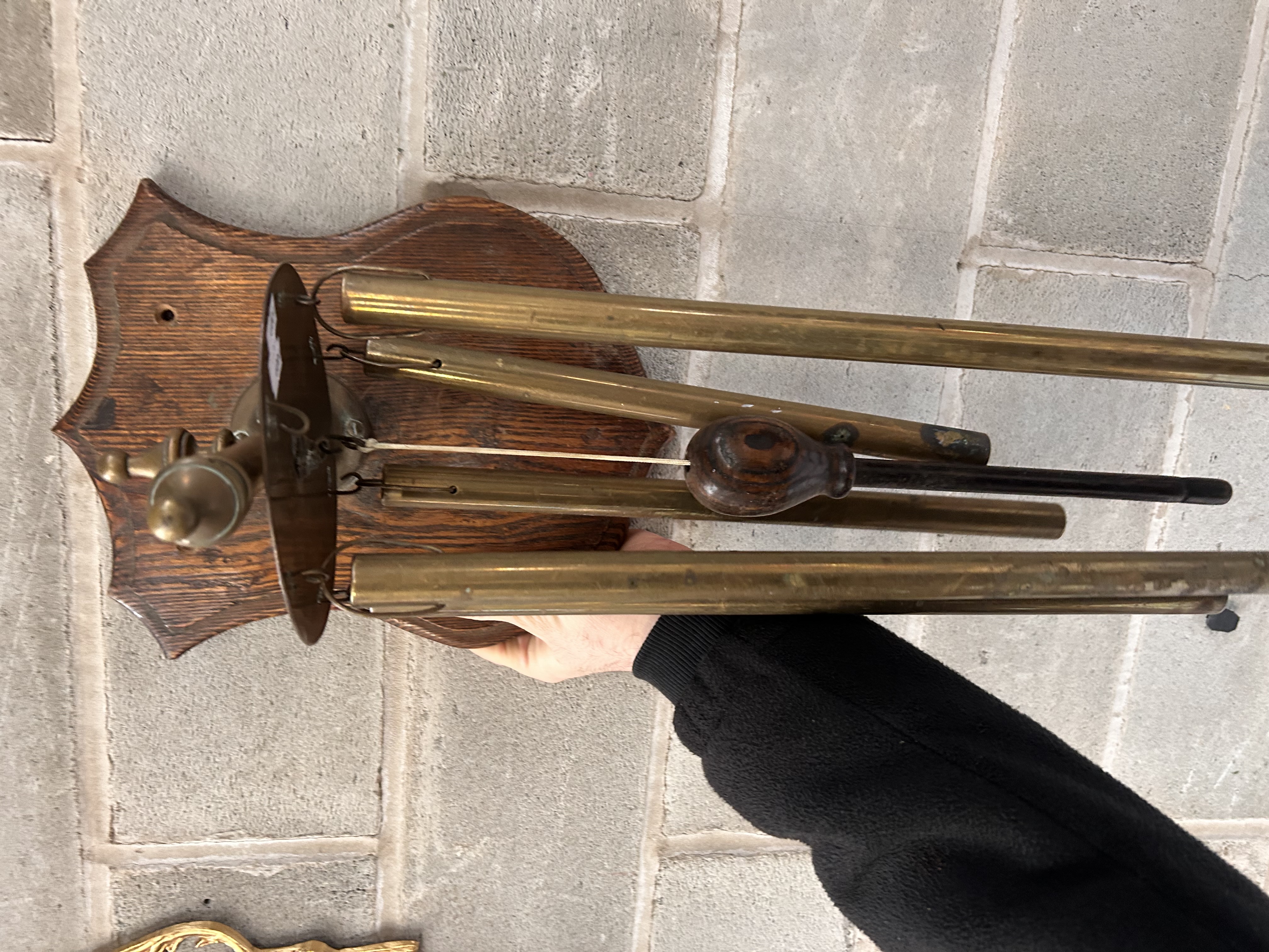 A wall-mounted mechanical tubular chime unit, likely functioning as a doorbell or signaling device, consistent with an early 20th-century aesthetic. The unit features a shield-shaped backplate constructed of stained dark wood. Suspended from a circular brass-toned metal plate are five individual metal tubular chimes. A central striker rod, tipped with a dark wooden knob, hangs in the middle position, designed to strike the chimes when activated. A small, illegible white inventory or price sticker is affixed to the upper brass mounting plate.