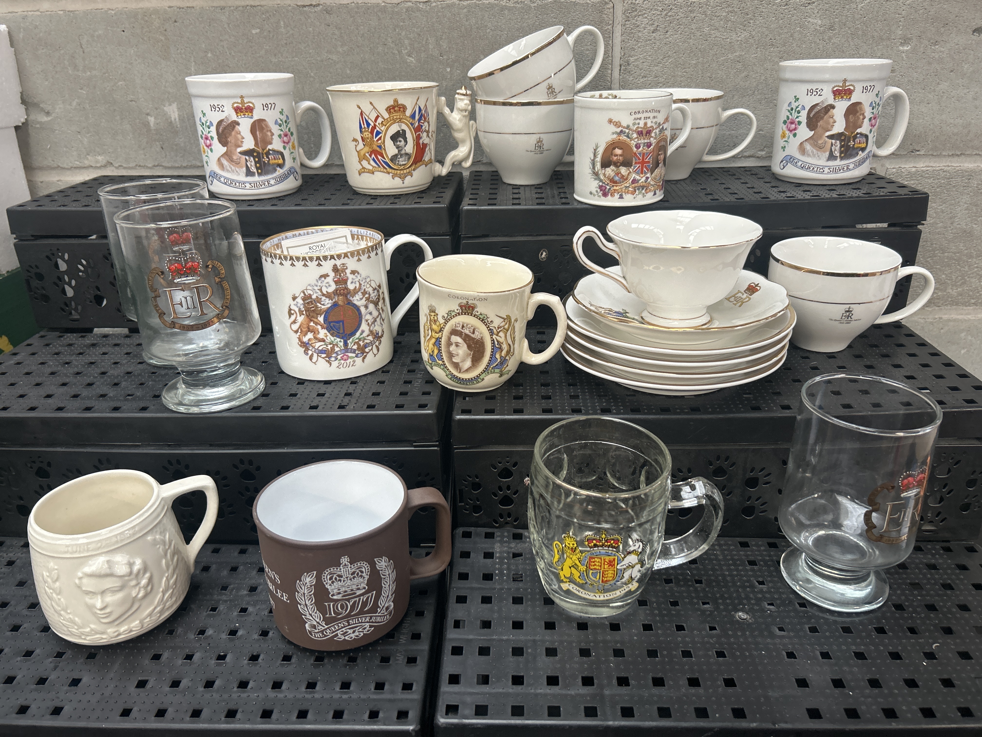 A collection of British Royal commemorative ware, primarily ceramic and glass, celebrating various significant events across the 20th and early 21st centuries. The collection comprises eight ceramic mugs, four ceramic teacups, four ceramic saucers, and three clear glass drinking vessels (tankards and goblets). The ceramic items are predominantly white or cream-colored, with several pieces featuring gilt or gold banding, particularly the teacups and saucers. Commemorative events visible on the items include the Coronation of King George V and Queen Mary (dated June 22, 1911), the Coronation of Queen Elizabeth II (1953), the Silver Jubilee of Queen Elizabeth II (1977), and the Diamond Jubilee (2012). Noteworthy pieces include a ceramic mug featuring a figural lion handle, a cream-colored mug with a relief-molded portrait of Queen Elizabeth II, and several pieces decorated with the Royal Coat of Arms and portraits of the monarchs. The glass vessels are decorated with transfer-printed crests and monograms, including the ER II cypher.