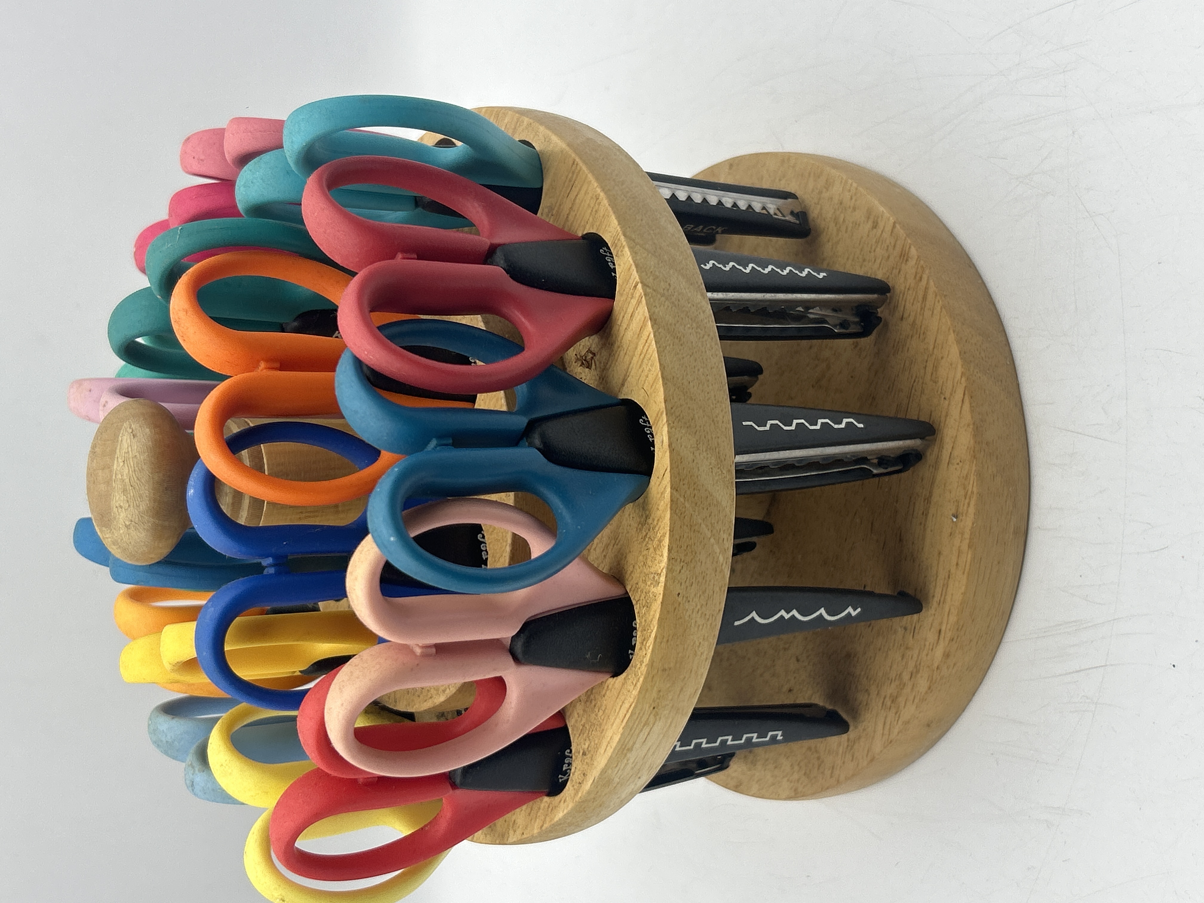 A collection of ECR4Kids Kraft Edgers decorative craft shears presented in their original rotating hardwood rack. The collection comprises 21 individual shears, exceeding the standard 18-piece set often marketed. Each shear features black metal blades with specialized cutting edges, including wavy, scalloped, and zigzag patterns, designed for craft and paper edging. The handles are constructed of brightly colored plastic or soft-grip material in a variety of colors including red, yellow, orange, blue, teal, and pink. The shears are stored in a tiered, light-toned wooden rotating stand with a central finial. Visible partial markings near the handle insertion points include fragments such as “Krac” and “raft,” consistent with the Kraft Edgers branding.